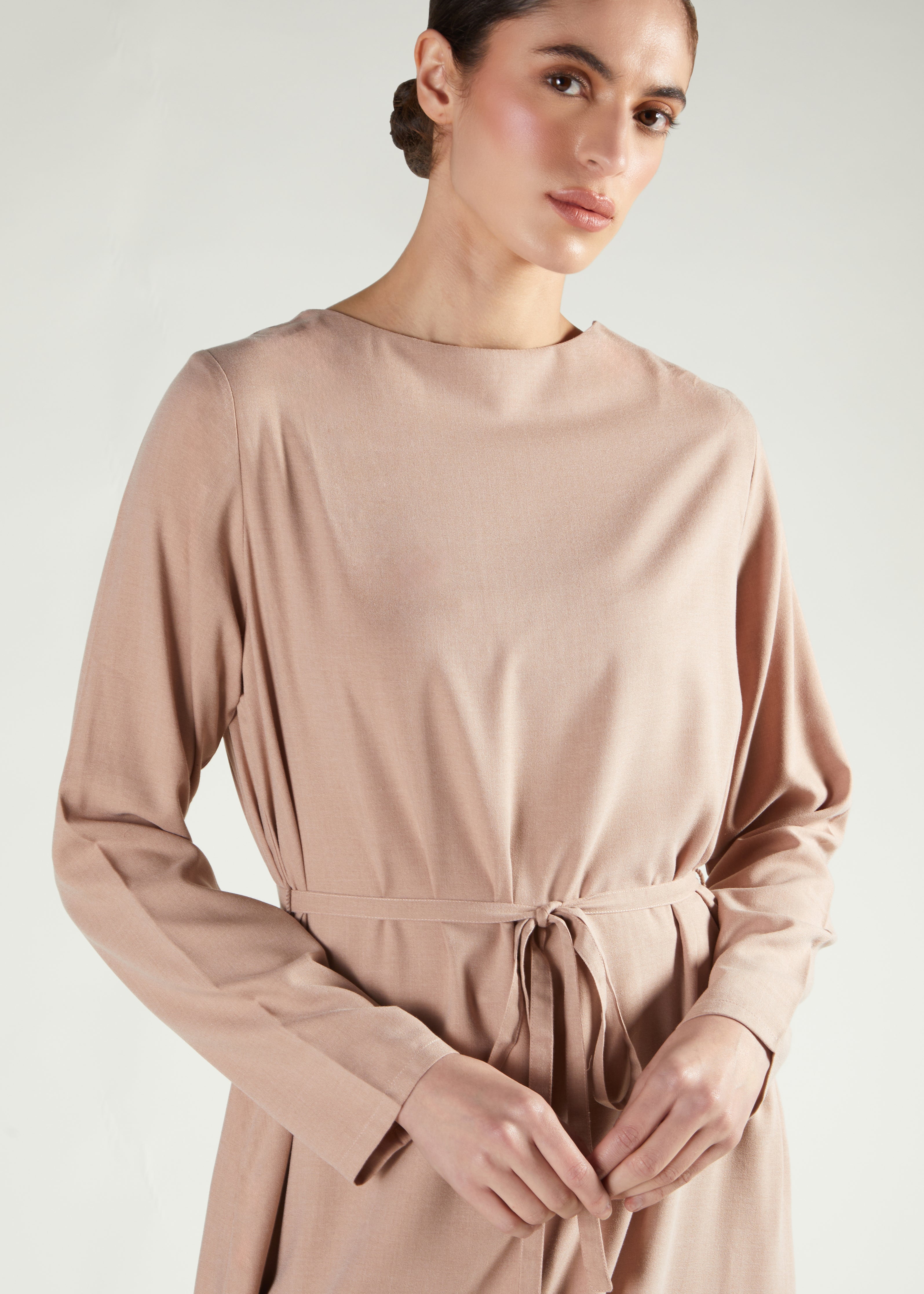 A-line Abaya Nude is made from soft, flowing fabric with a round neckline and a thin belt to define your waist.