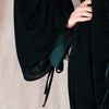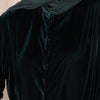This floor-length abaya is made from a deep green velvet fabric, exuding a timeless elegance. The abaya features a loose, flowing silhouette with statement batwing sleeves, offering a dramatic yet refined look. Subtle ruching and adjustable tie details on the sleeves enhance its versatility and style. A modest, high-neck collar and concealed front closure complete its sophisticated design, making it perfect for any formal occasion.