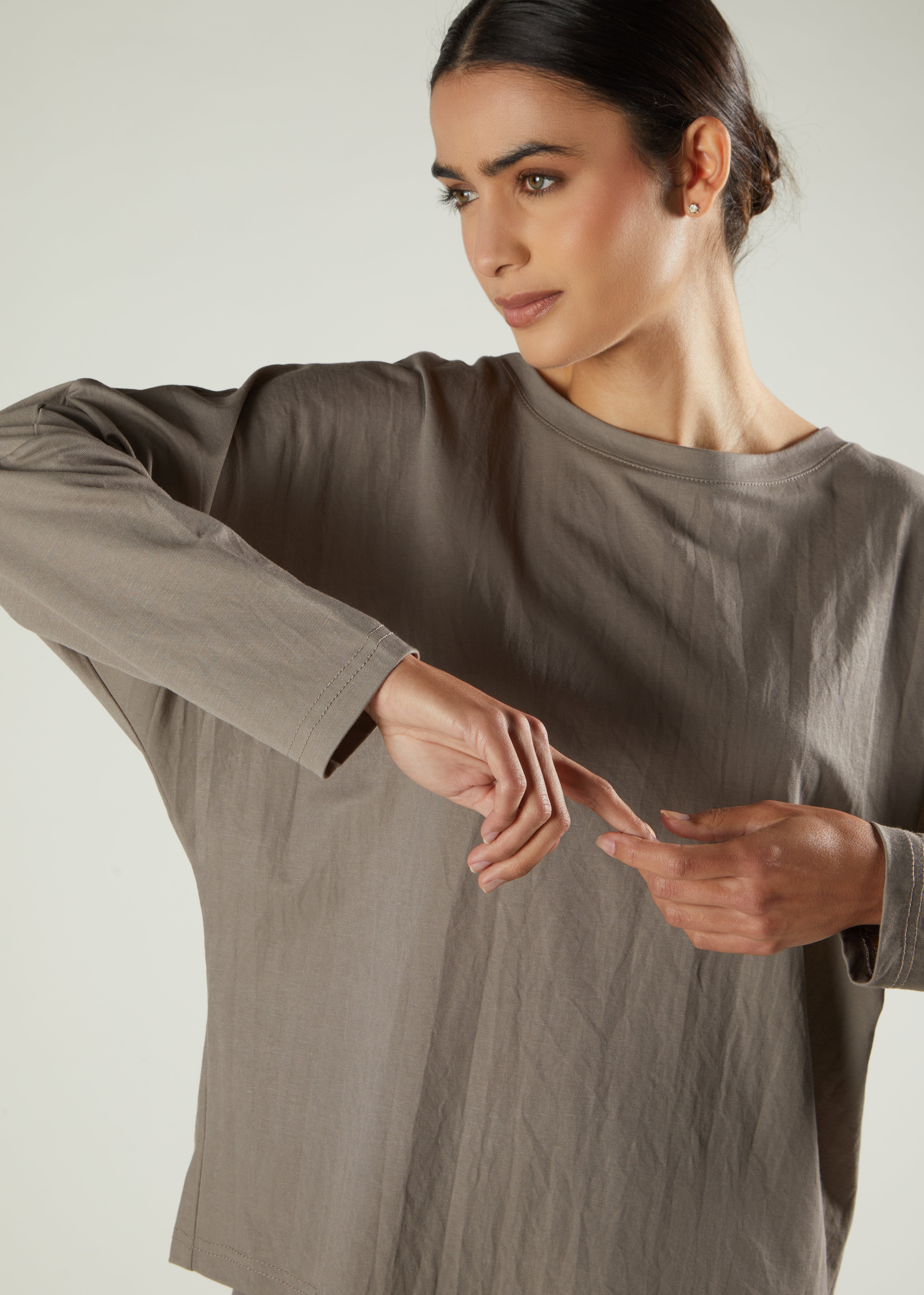 Aab basics prioritise practical comfort - ideal for travel or daily wear. This understated set features a modest-length top paired with mid-flare trousers made from soft, comfortable fabric. Its versatile design ensures effortless, fuss-free dressing for any occasion, making it a reliable choice for both everyday life and journeys.