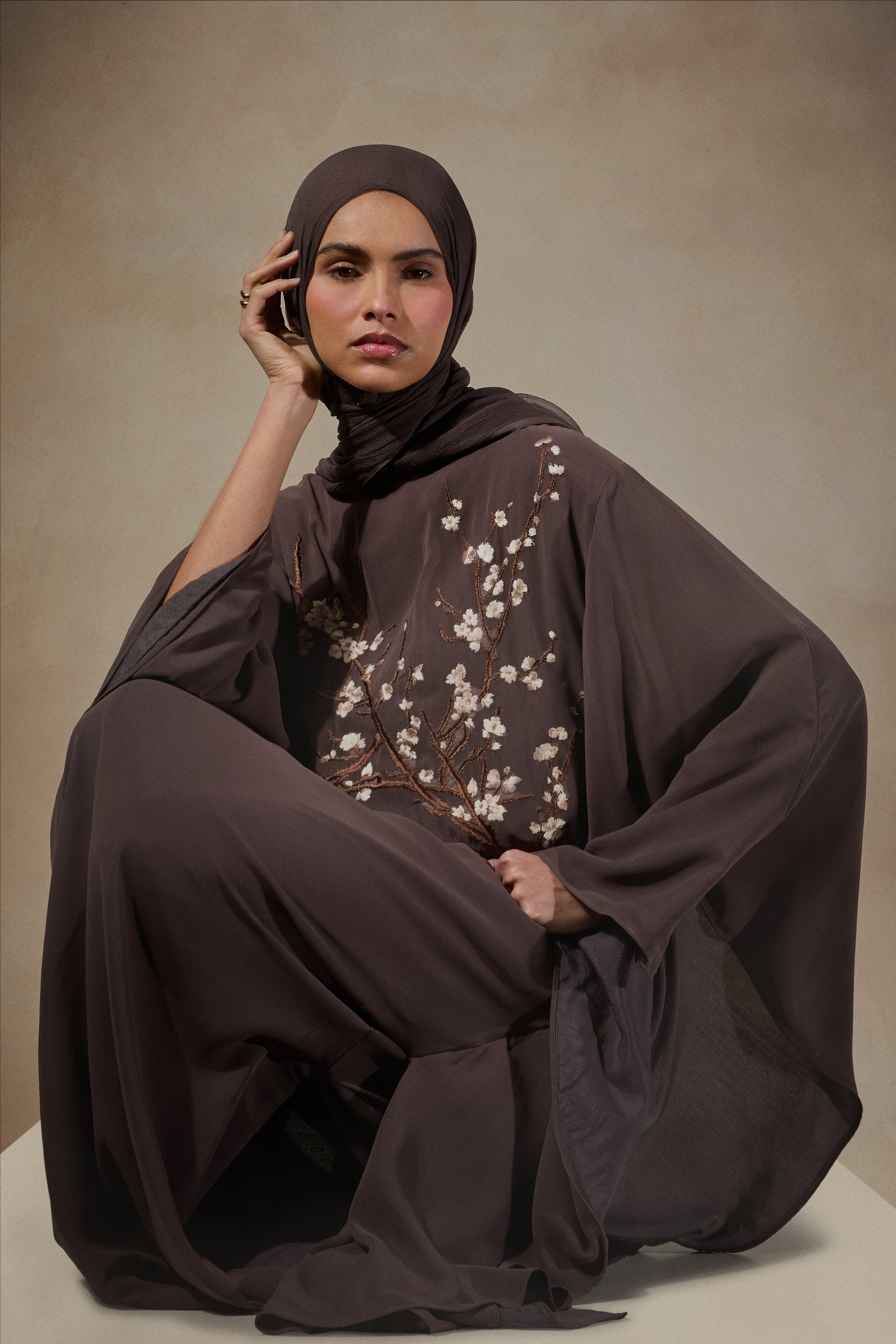 Beautifully embroidered Kaftan featuring delicate almond bloom motifs inspired by the beauty of spring blossom. The garment is made using a fluid crepe that's fully lined using 100% cotton lining for comfort. Kaftan has a modest silhouette a comes with a self-fabric belt that can be used without obscuring the beauty of the embroidery.