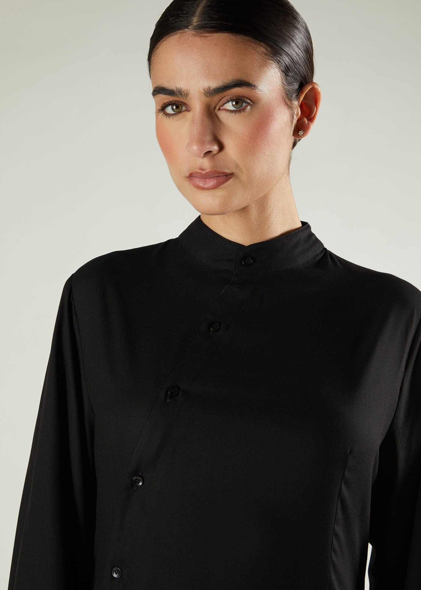 Elevate your everyday modest wear with our Asymmetric Abaya in black. Designed with clean lines and a flattering drape, this garment features a modern asymmetric button detail that flows gracefully down the front. Made from soft, breathable fabric for all-day comfort, it seamlessly blends modesty with minimalist sophistication. Perfect for both casual and smart styling, with discreet side pockets adding a touch of practicality.