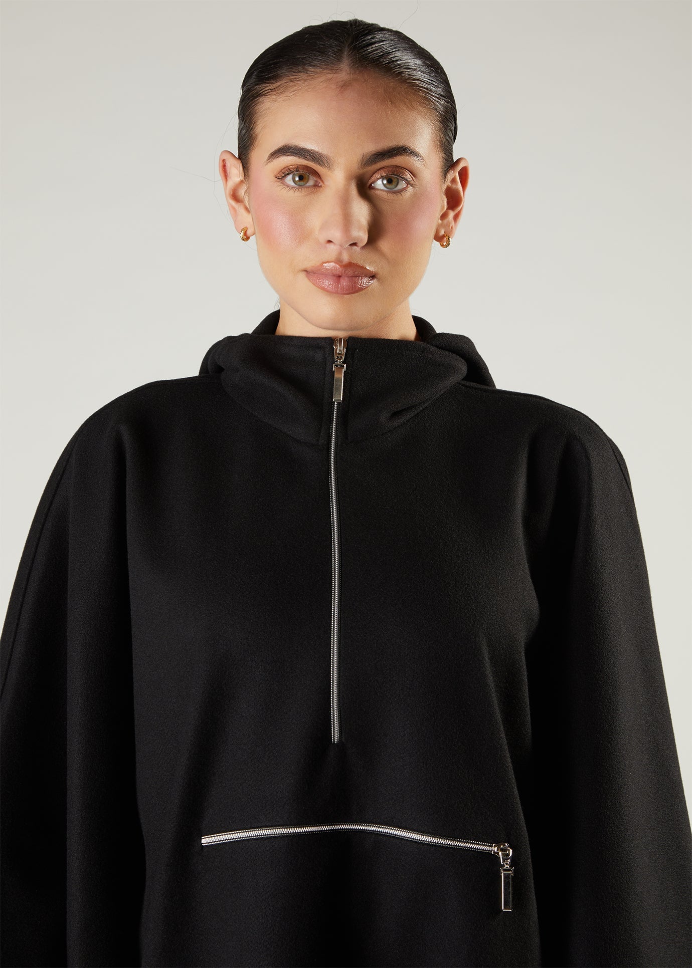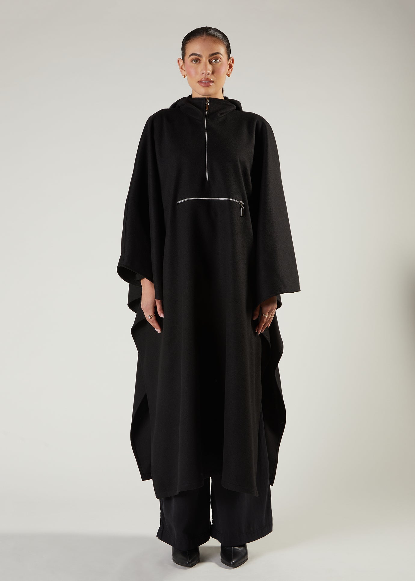 Made from a soft boucle-like material, this cape offers a cosy appearance. Its loose, the enveloping design ensures comfortable layering for added warmth and style. Also available in a camel colour.