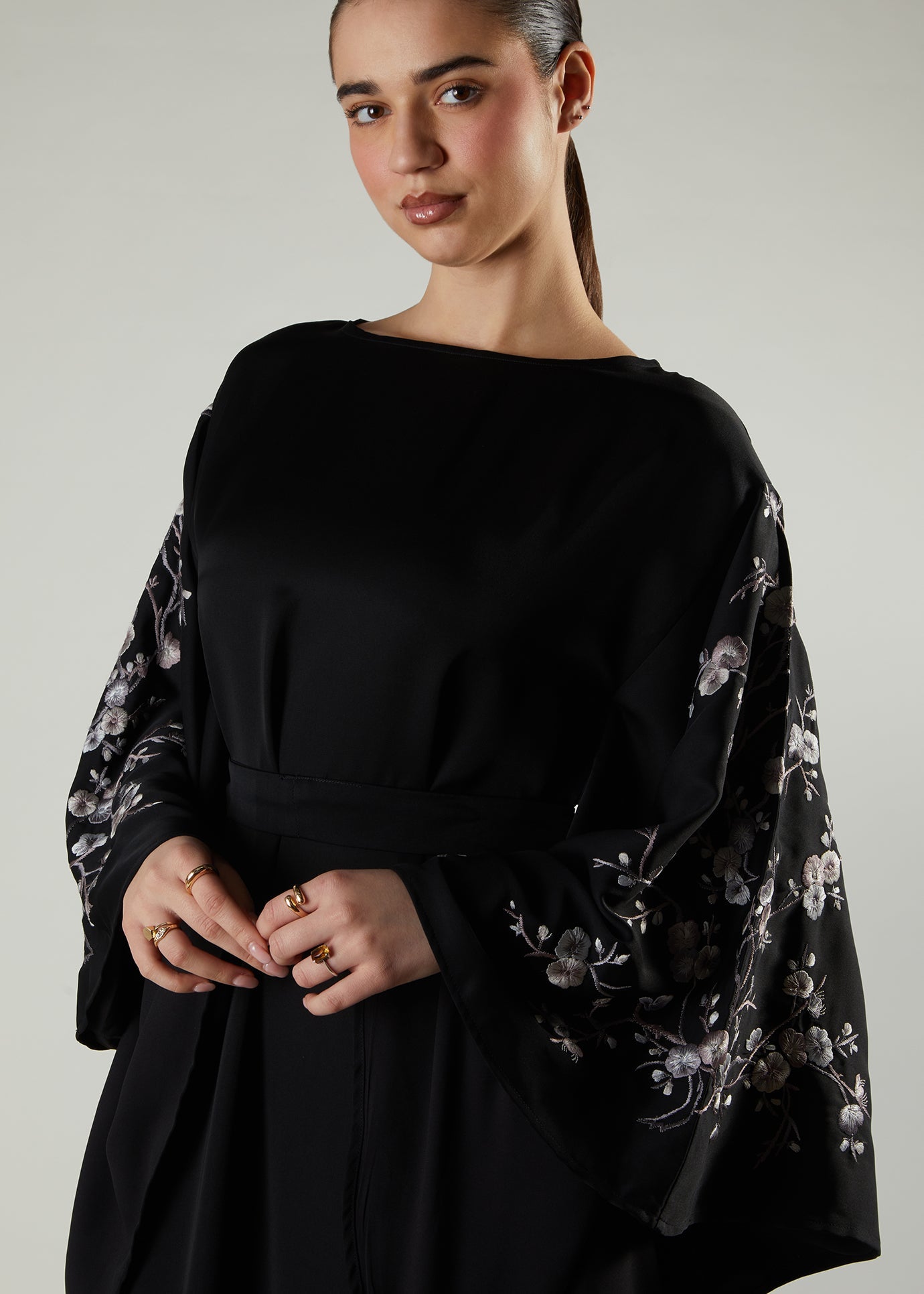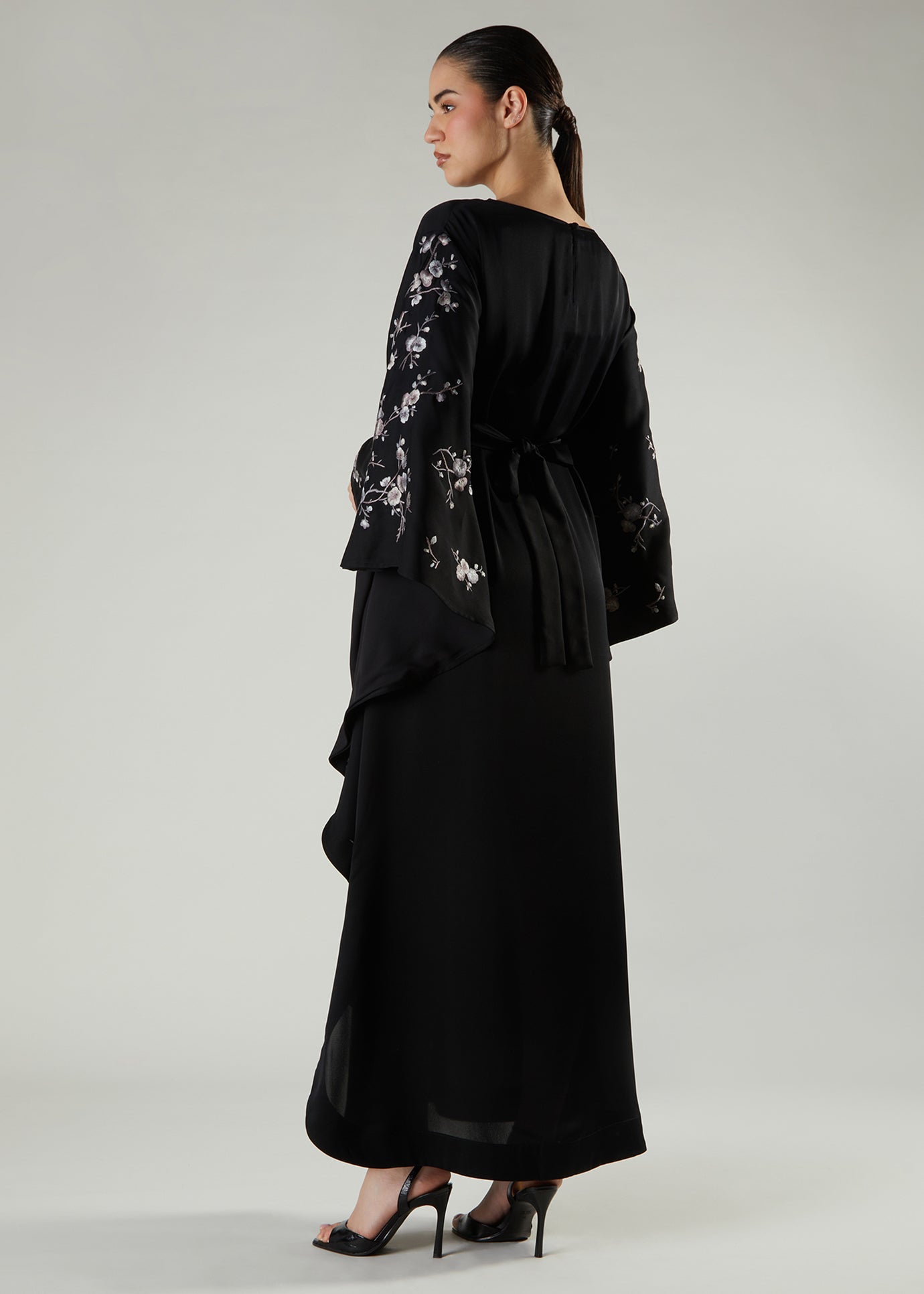 Beautifully cut for a floaty silhouette from a fluid crepe fabric. The garment is fully lined with 100% cotton lining; the kaftan features exquisitely embroidered panels on the sides with tonal silvery grey floral motifs.