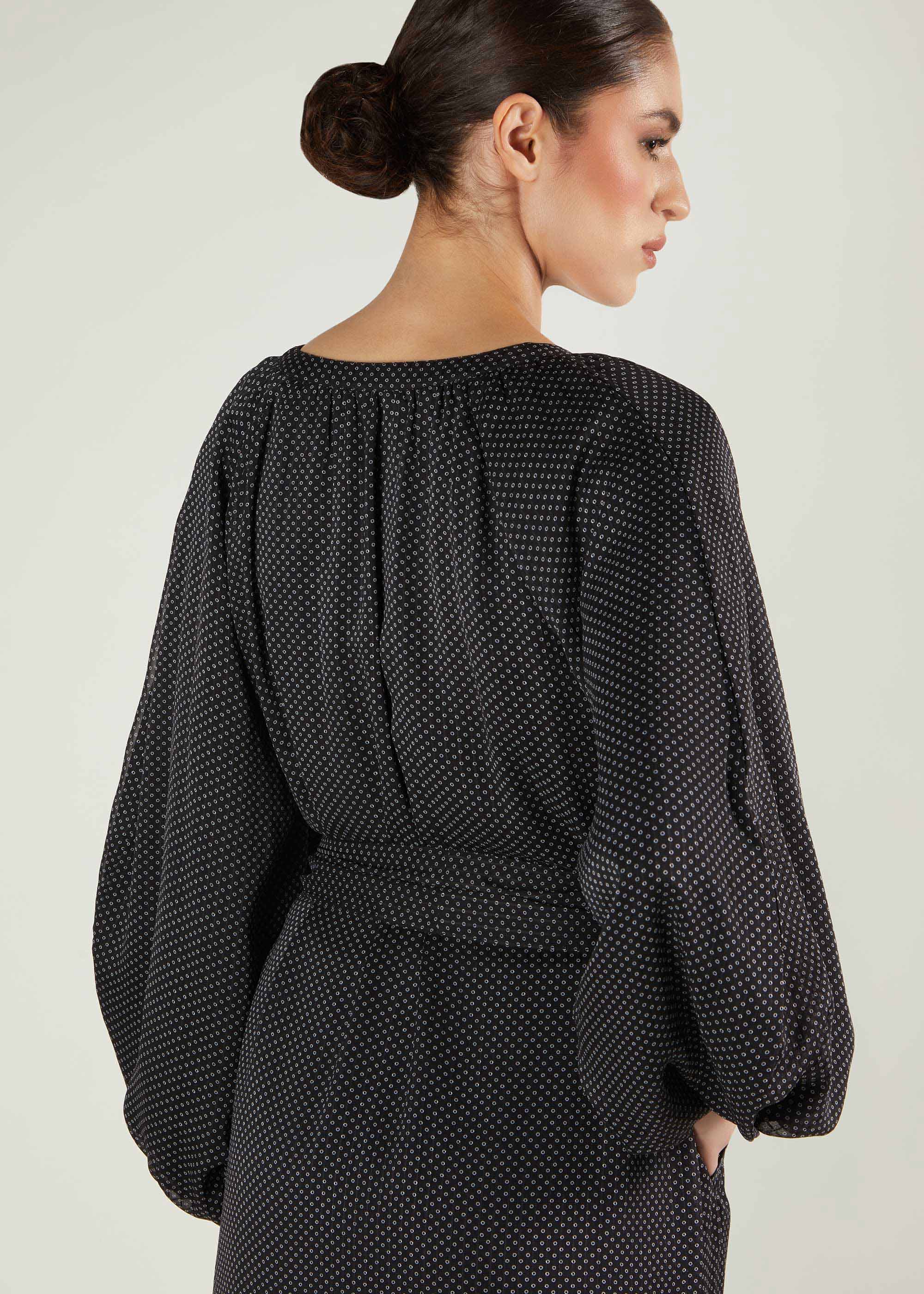 This monochrome maxi dress features dramatic balloon sleeves and a modest V-neckline. Ideal for professional settings or formal events, it can also be dressed down with trainers for a casual look. Made from lightweight chiffon and fully lined, it offers both comfort and a crease-resistant finish throughout the day.