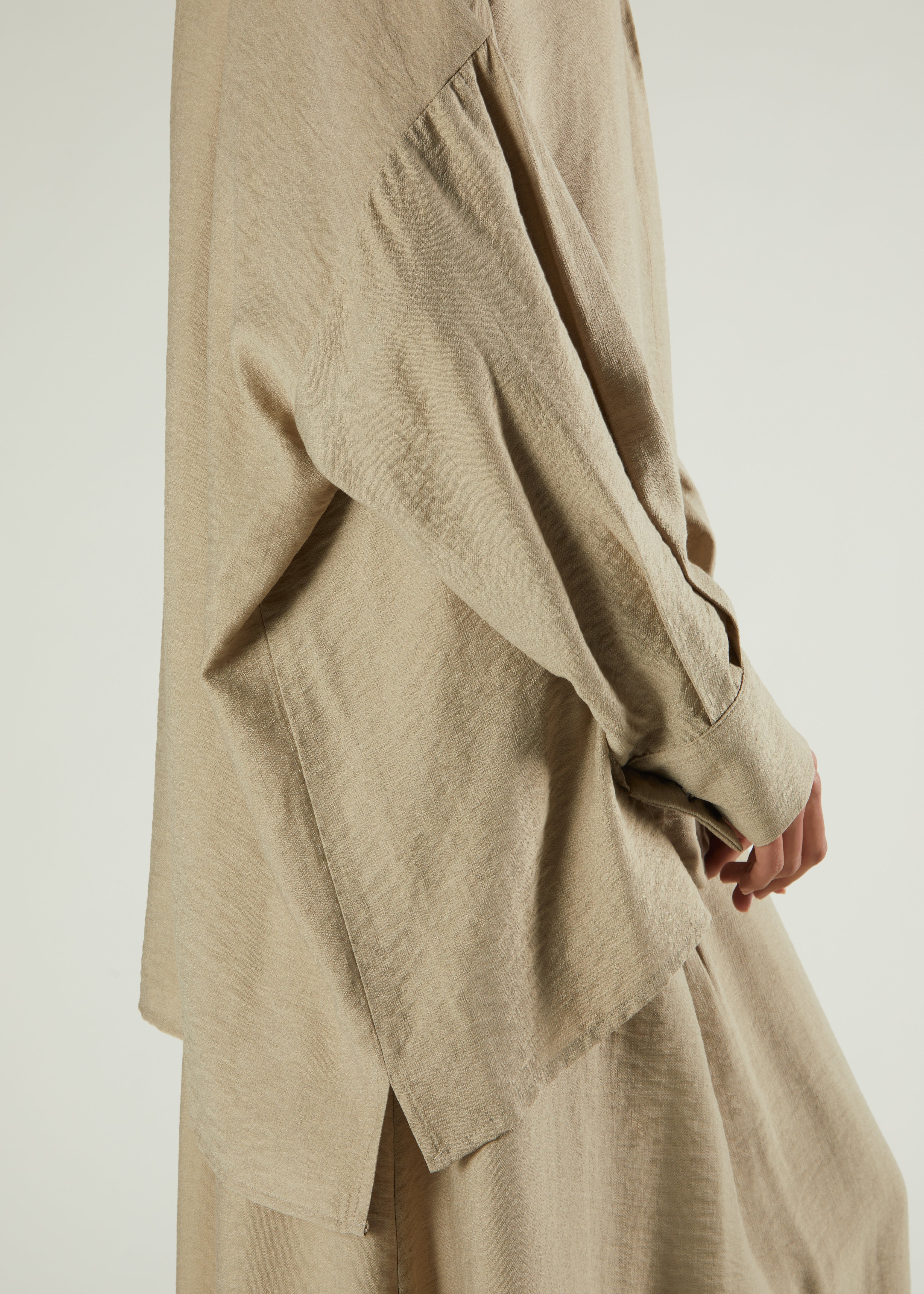 This casual co-ord ensemble includes a skirt and top made from fluid fabric, tailored to offer a subtly oversized silhouette. The top features hidden buttons, while the skirt is designed with a mid-flare shape for a refined finish.