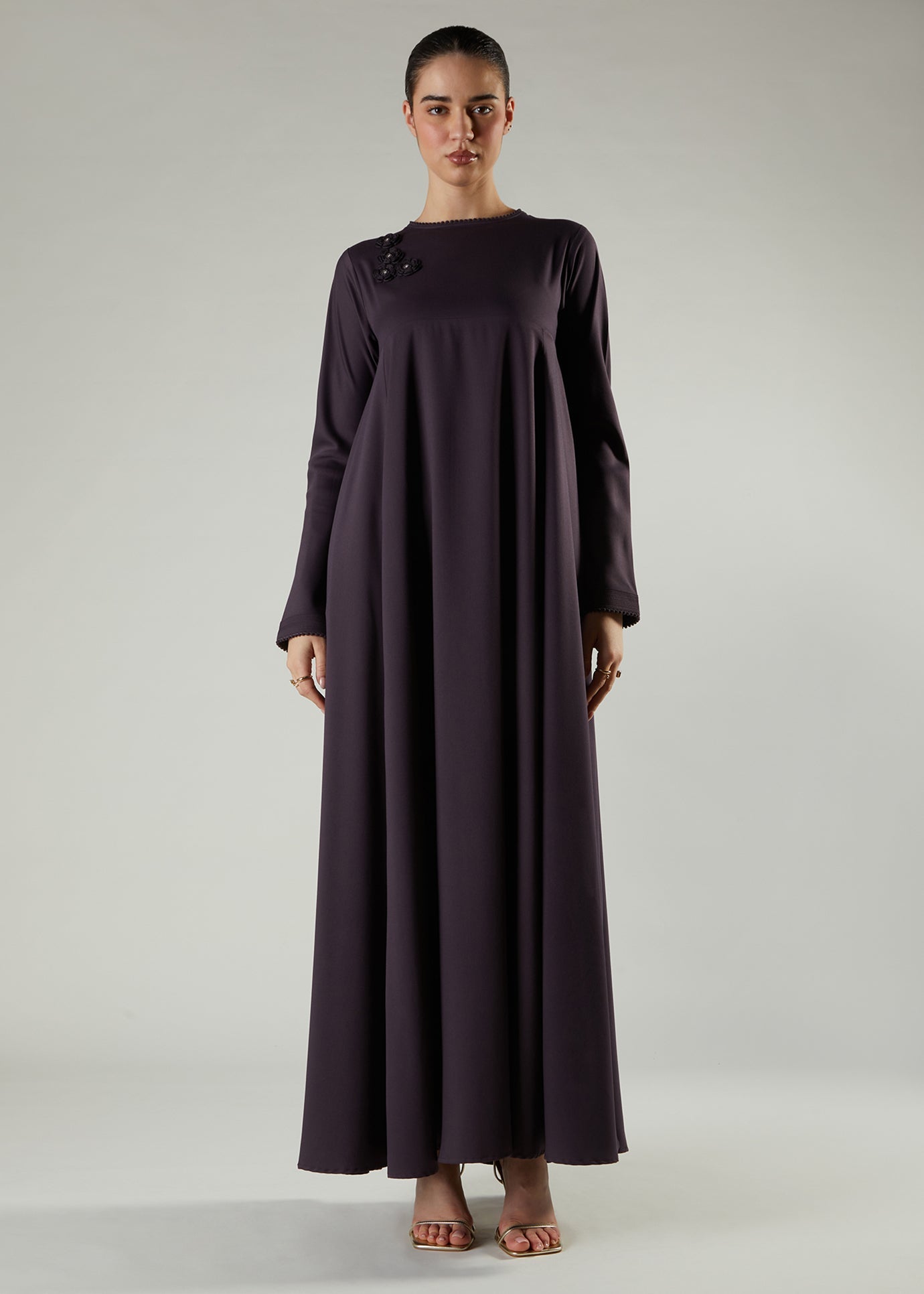 Inspired by classic graceful silhouettes, this abaya features an exquisite handmade corsage for an incredibly refined look, finished with charming bead-like lace detailing on the neckline and cuffs.