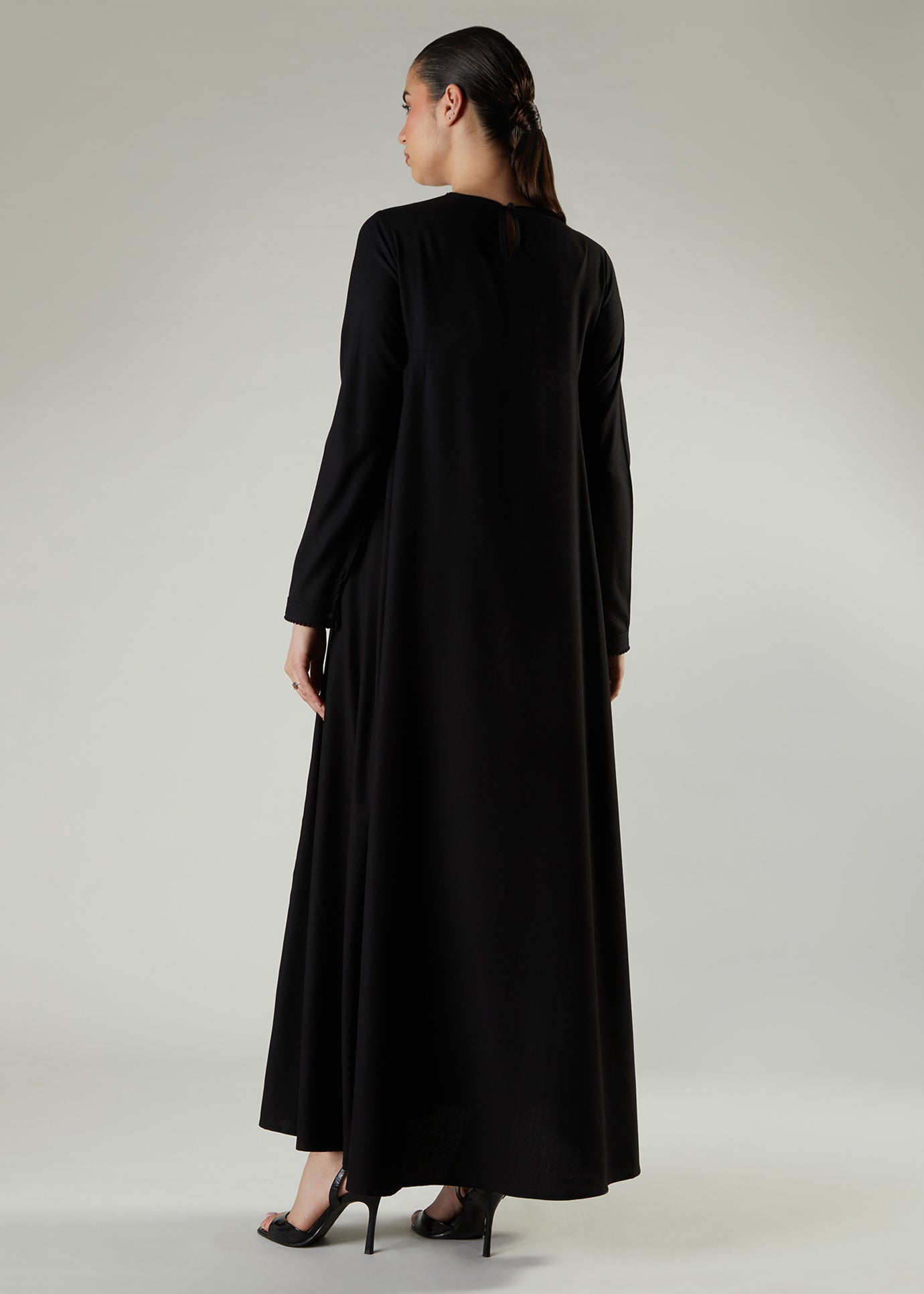 Inspired by classic graceful silhouettes, this abaya features exquisite handmade corsages for an incredibly refined look, finished with charming bead-like lace detailing on the neckline and cuffs.