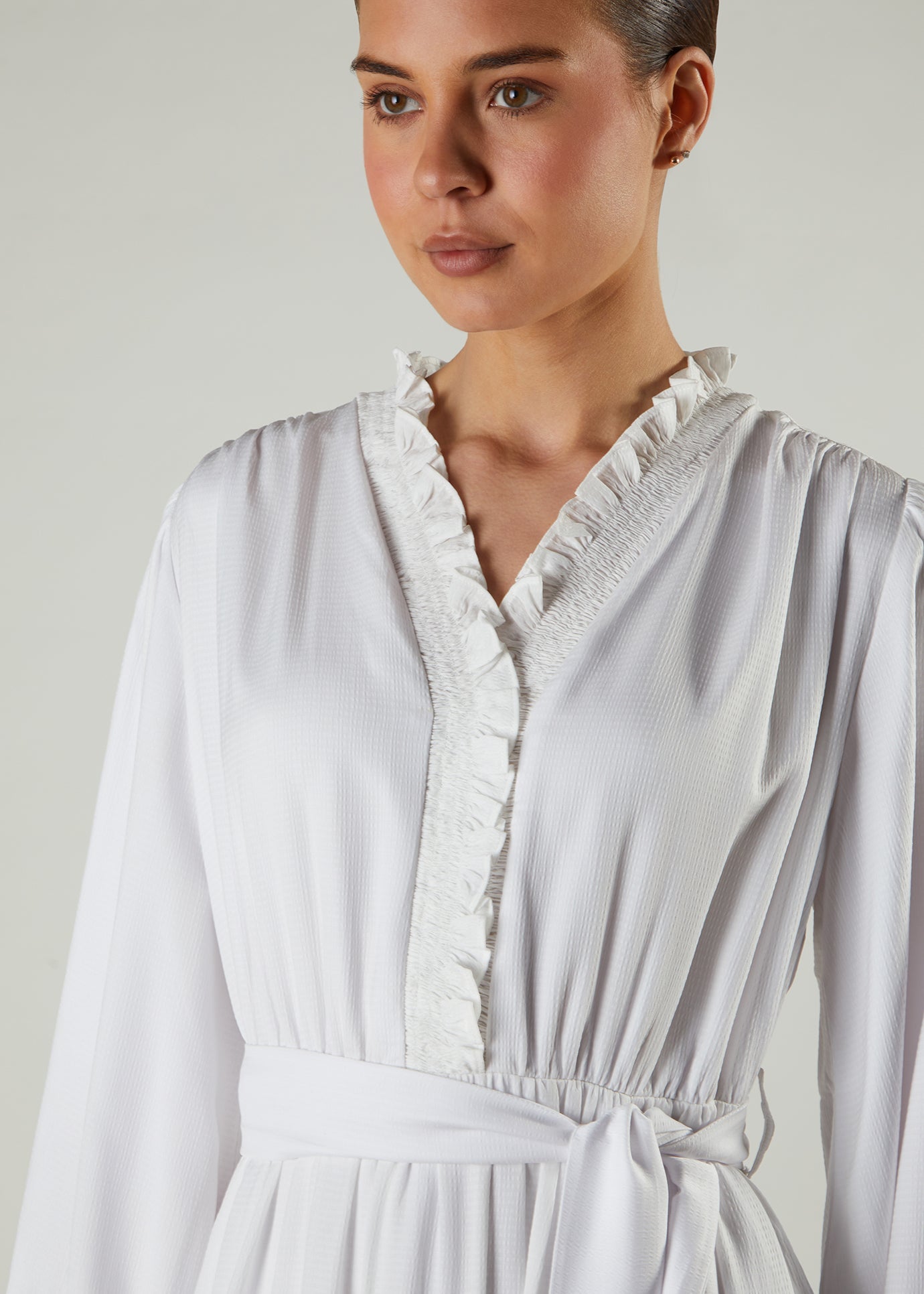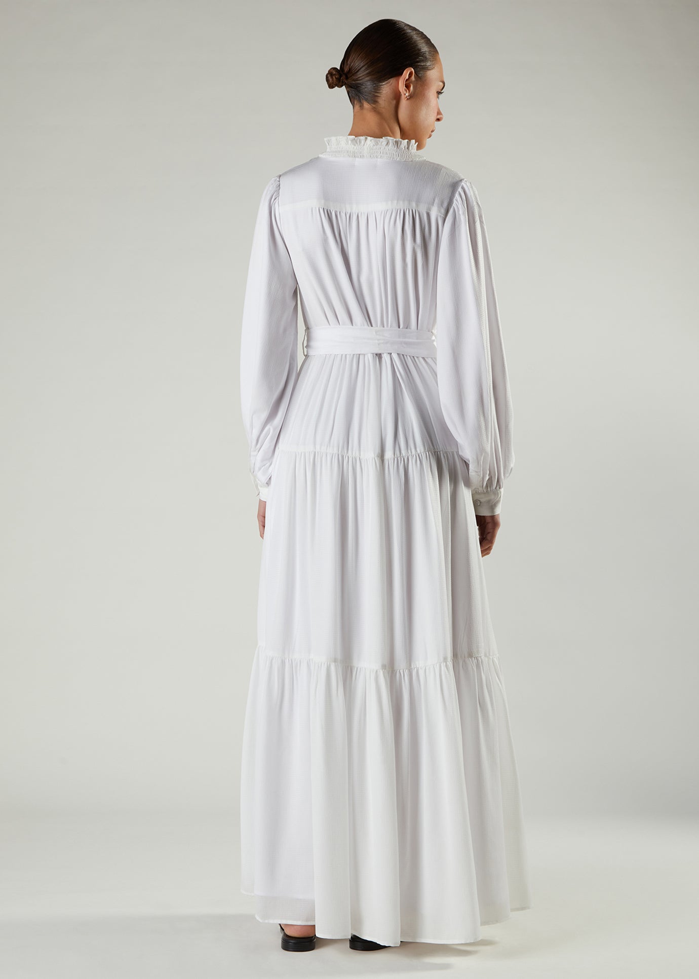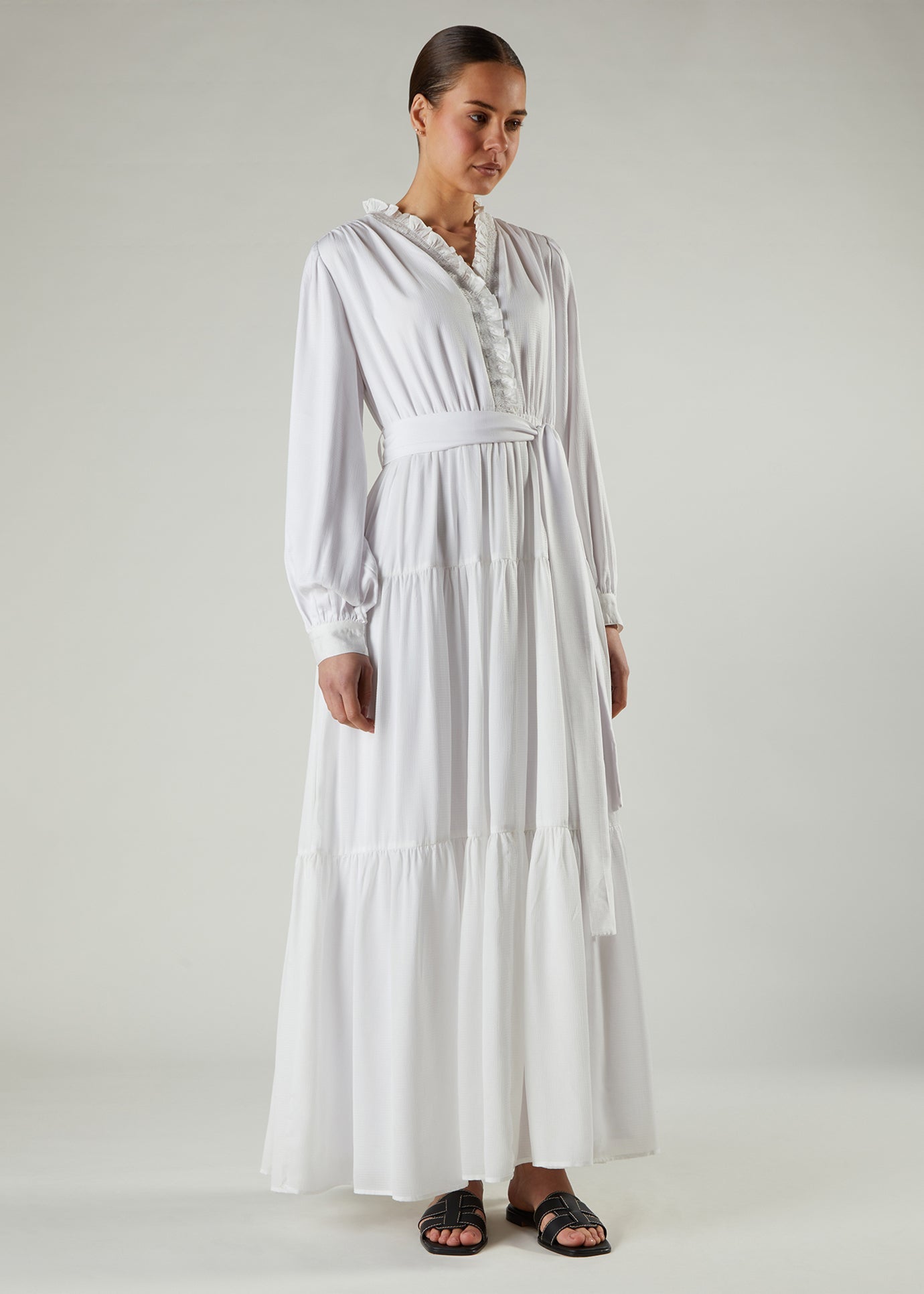 Maxi has a tiered cut, giving it a floaty look and feel. Feminine frill detail on the neckline. It comes with a belt which once cinched at the waist, pulls the maxi in defining your look. If worn without the belt, you may want to size down as the layered tiers make this quite an oversized maxi.