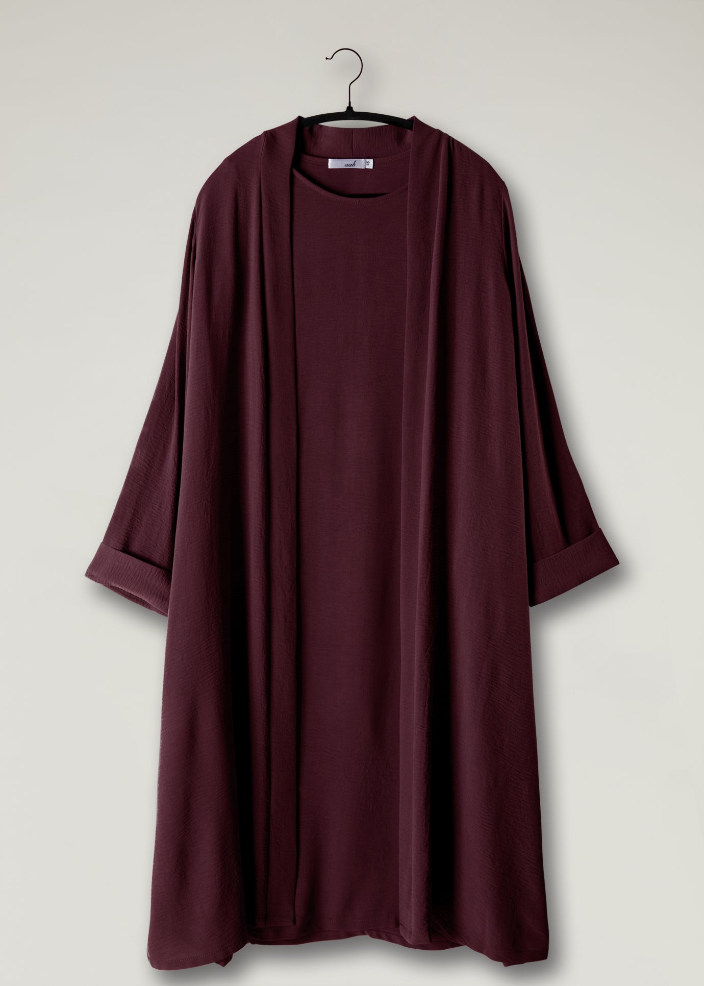 This elegant Two-Piece Open Abaya set includes a Full Sleeve matching slip. Perfect for everyday wear, it can also be dressed up with accessories for an evening look. The full sleeve slip dress can be worn as a maxi dress on its own or paired with the open abaya for a stylish ensemble.