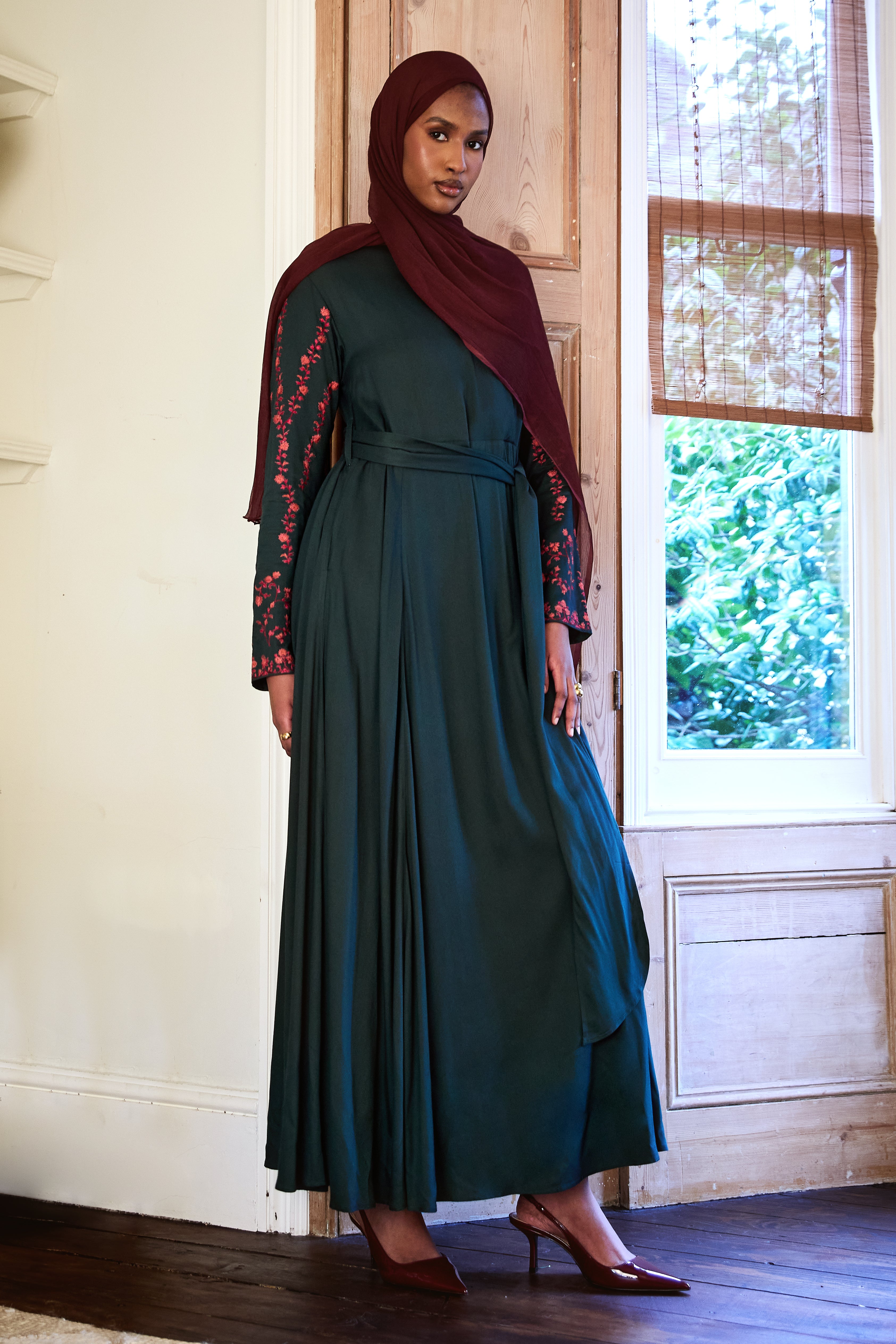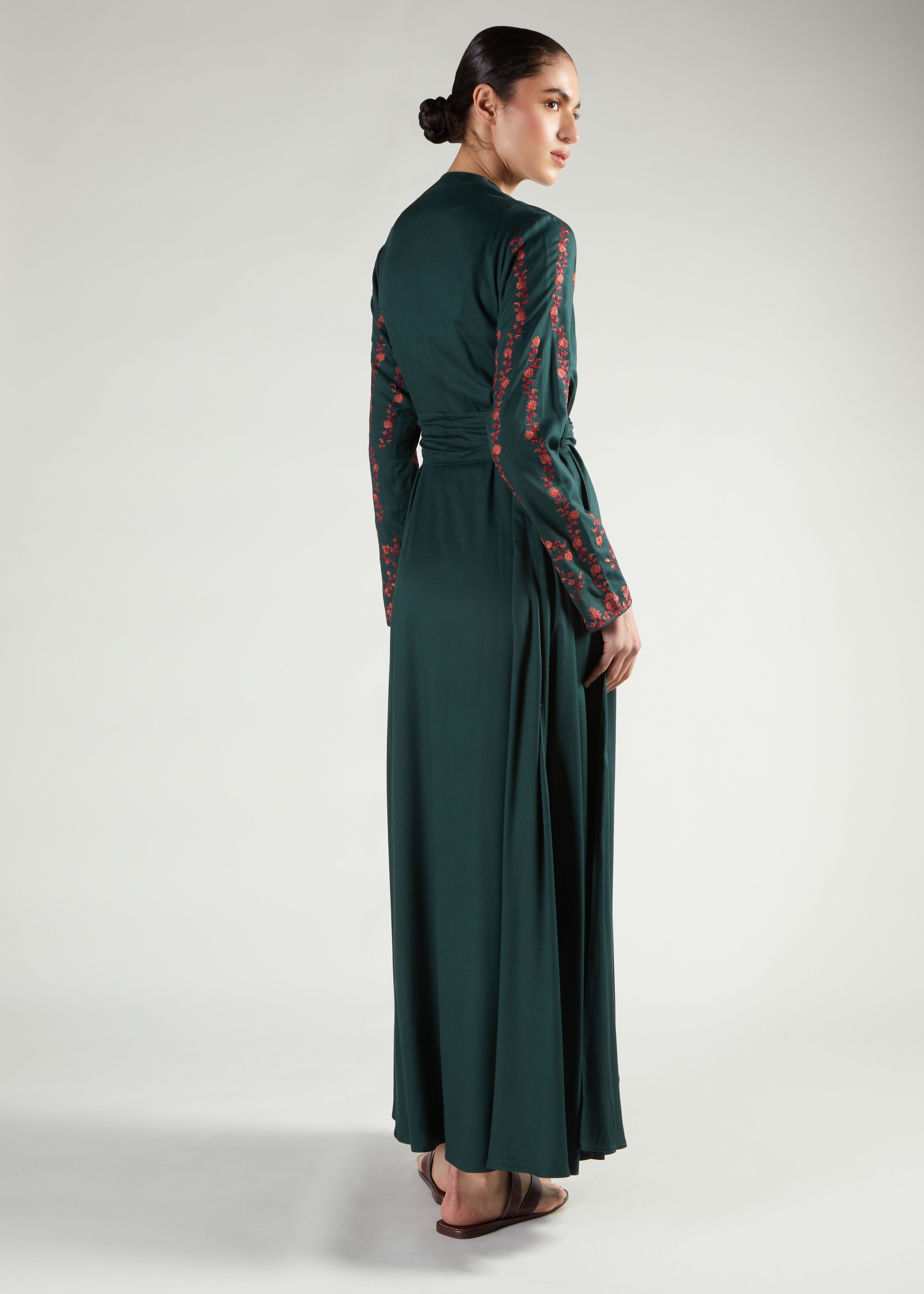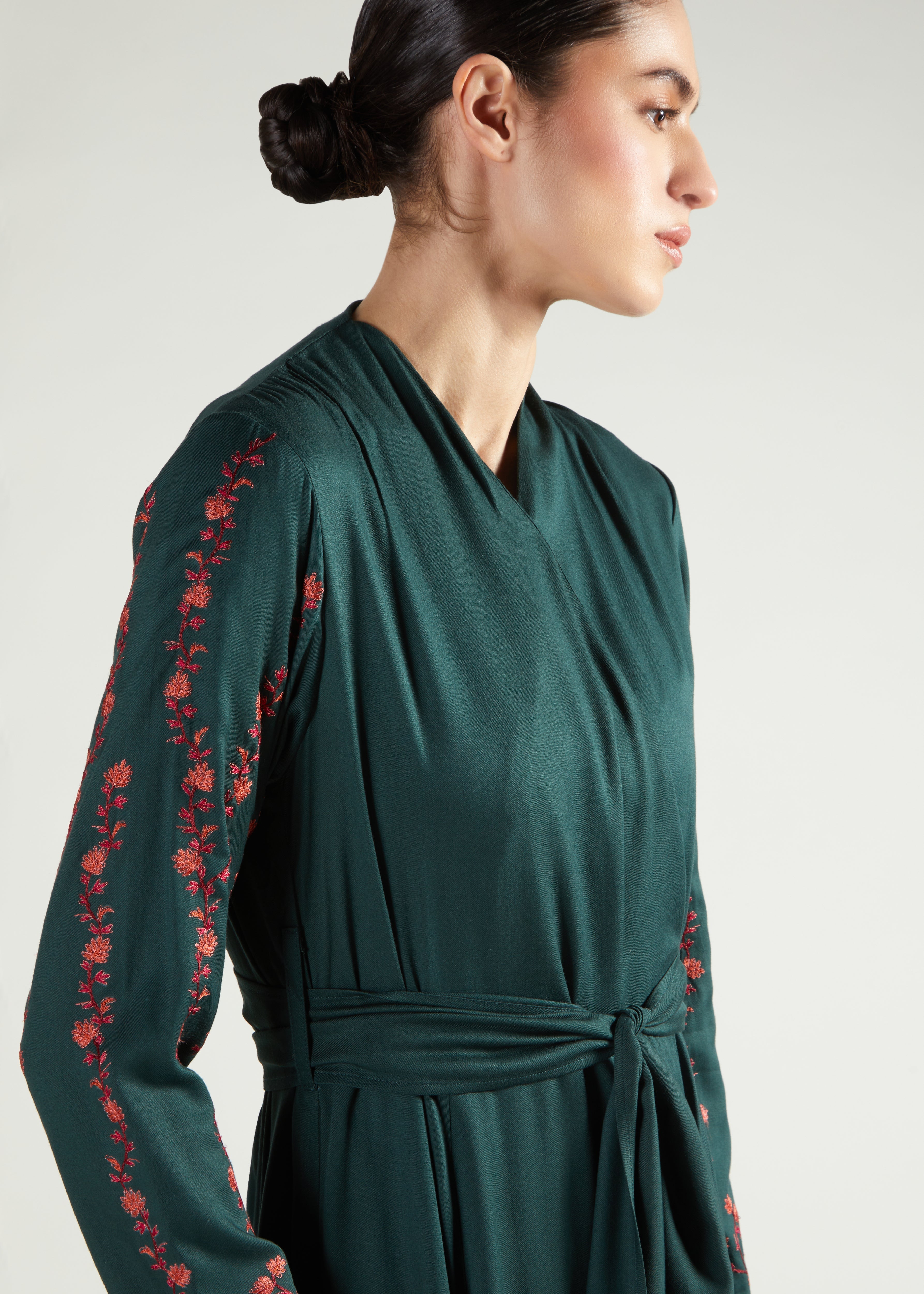 Beautiful wrap style Abaya made from a soft twill fabric in a rich green shade featuring delicate trailing embroidery on the sleeves in an elegant garnet shade. Slightly fitted bodice, the garment then flares out from the waist and comes with a belt.
