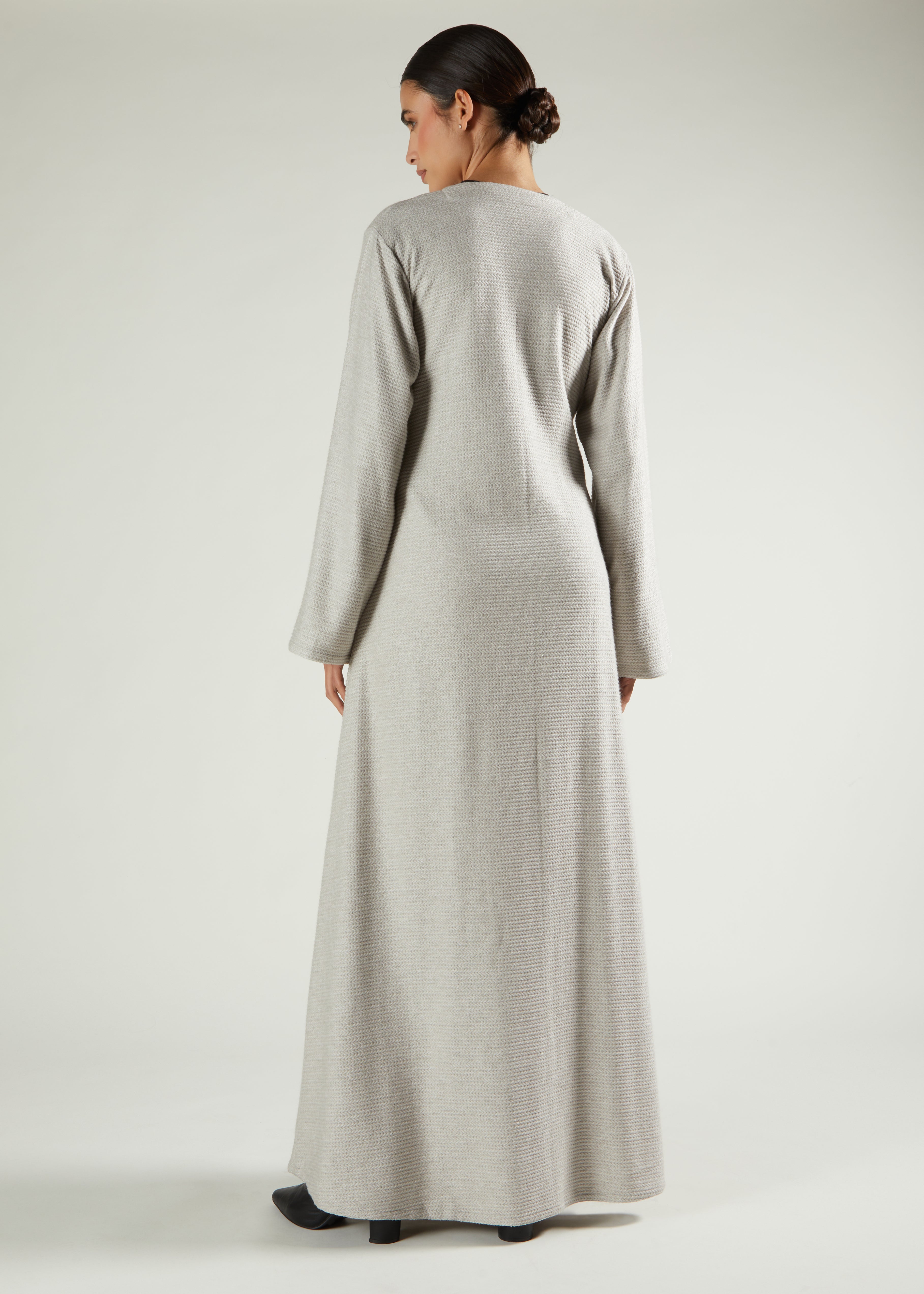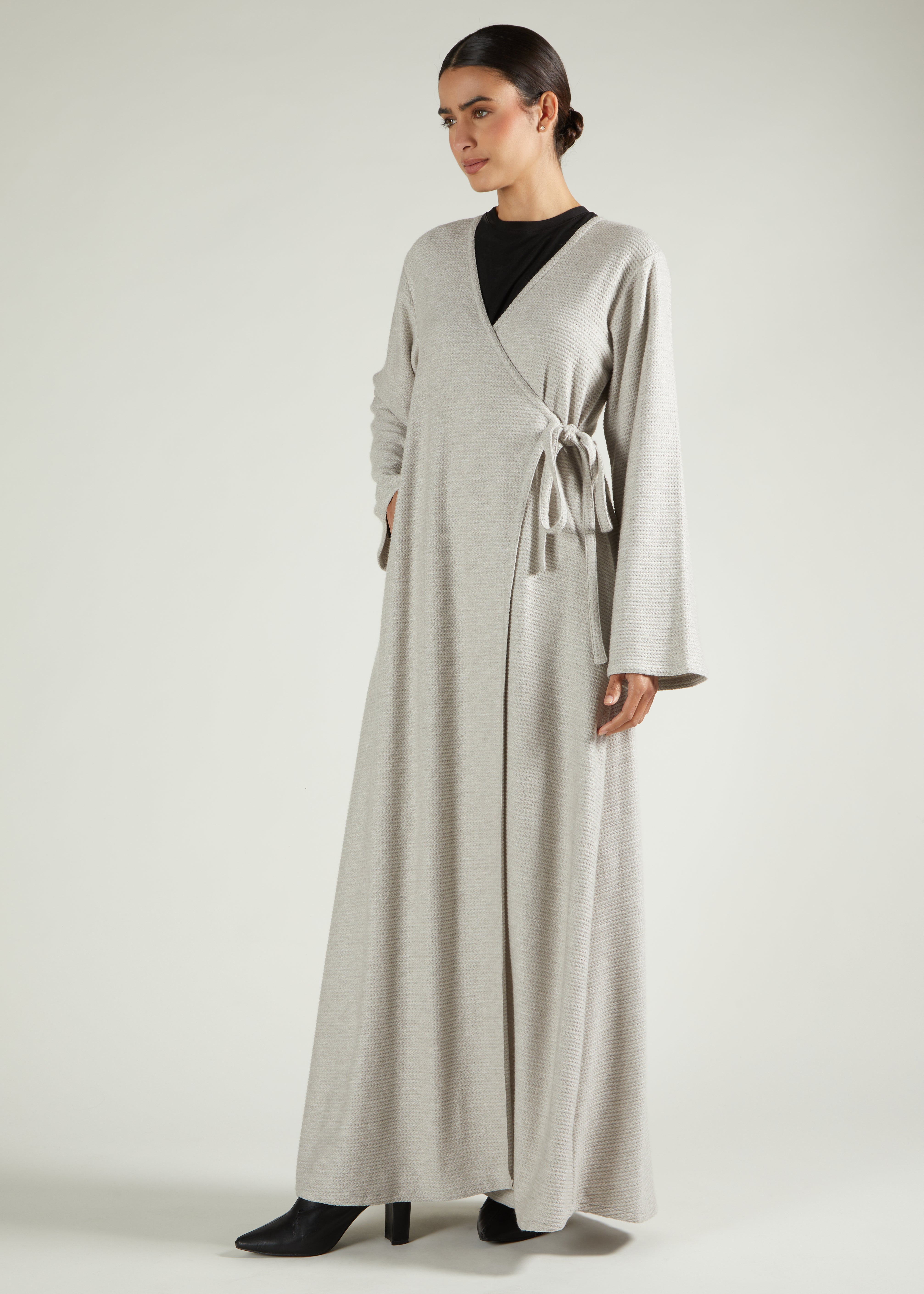 Effortlessly combining comfort with refined simplicity, this wrap abaya is a timeless addition to your wardrobe. Made from a beautifully soft, textured knit, it drapes fluidly to create a flattering and feminine silhouette. The wrap design features a side tie fastening for an adjustable fit, while discreet pockets add a practical touch. Ideal for layering, this versatile piece transitions seamlessly through the seasons - from relaxed daytime wear to understated evening elegance.
