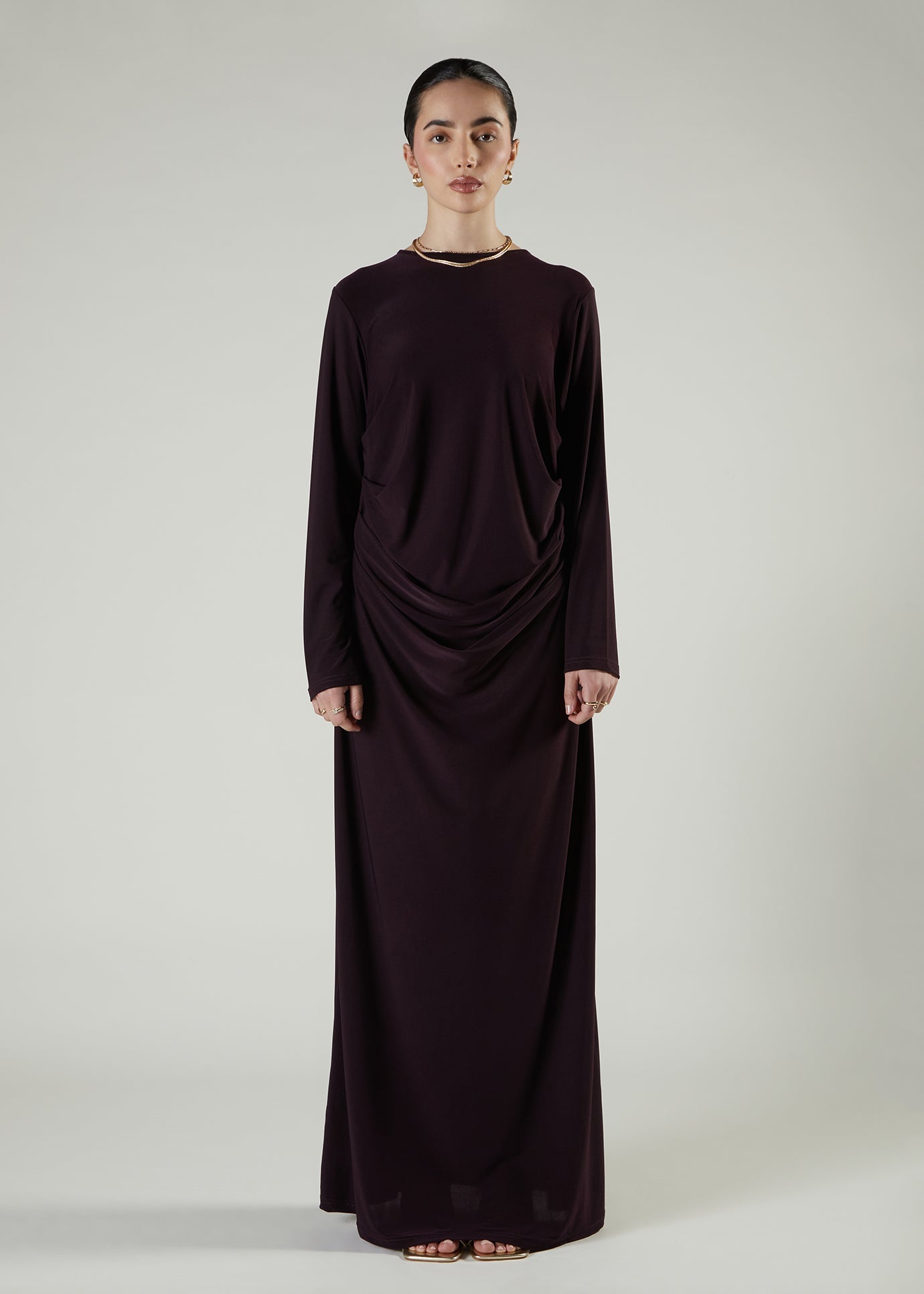 This maxi is made from a fluid stretchy fabric, featuring waterfall gathers down the front of the garment.
