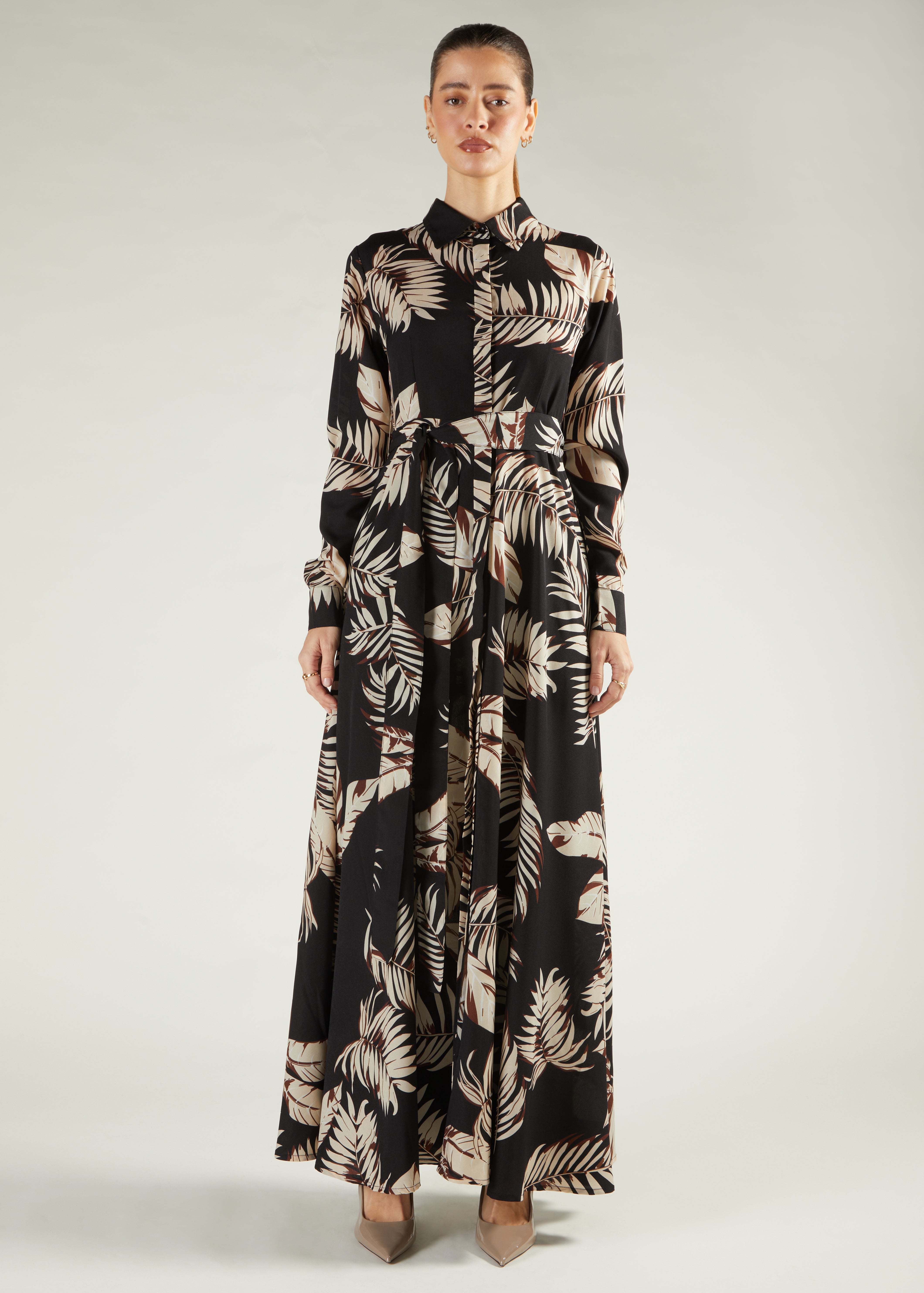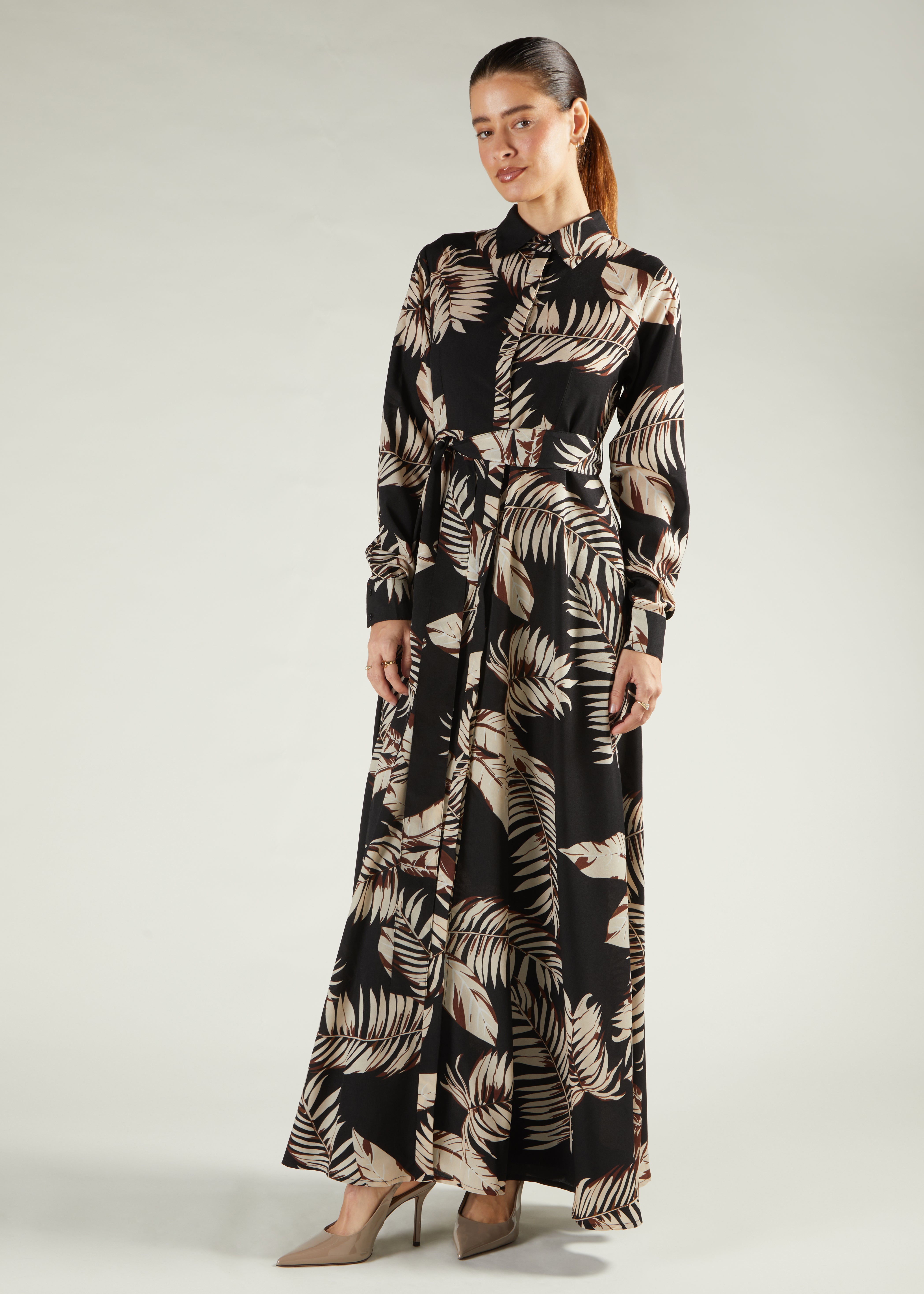 Leaf print maxi dress in rich brown tones. Features a classic shirted maxi style that works beautifully with our range of skin tone hijabs for a complete, elevated look.