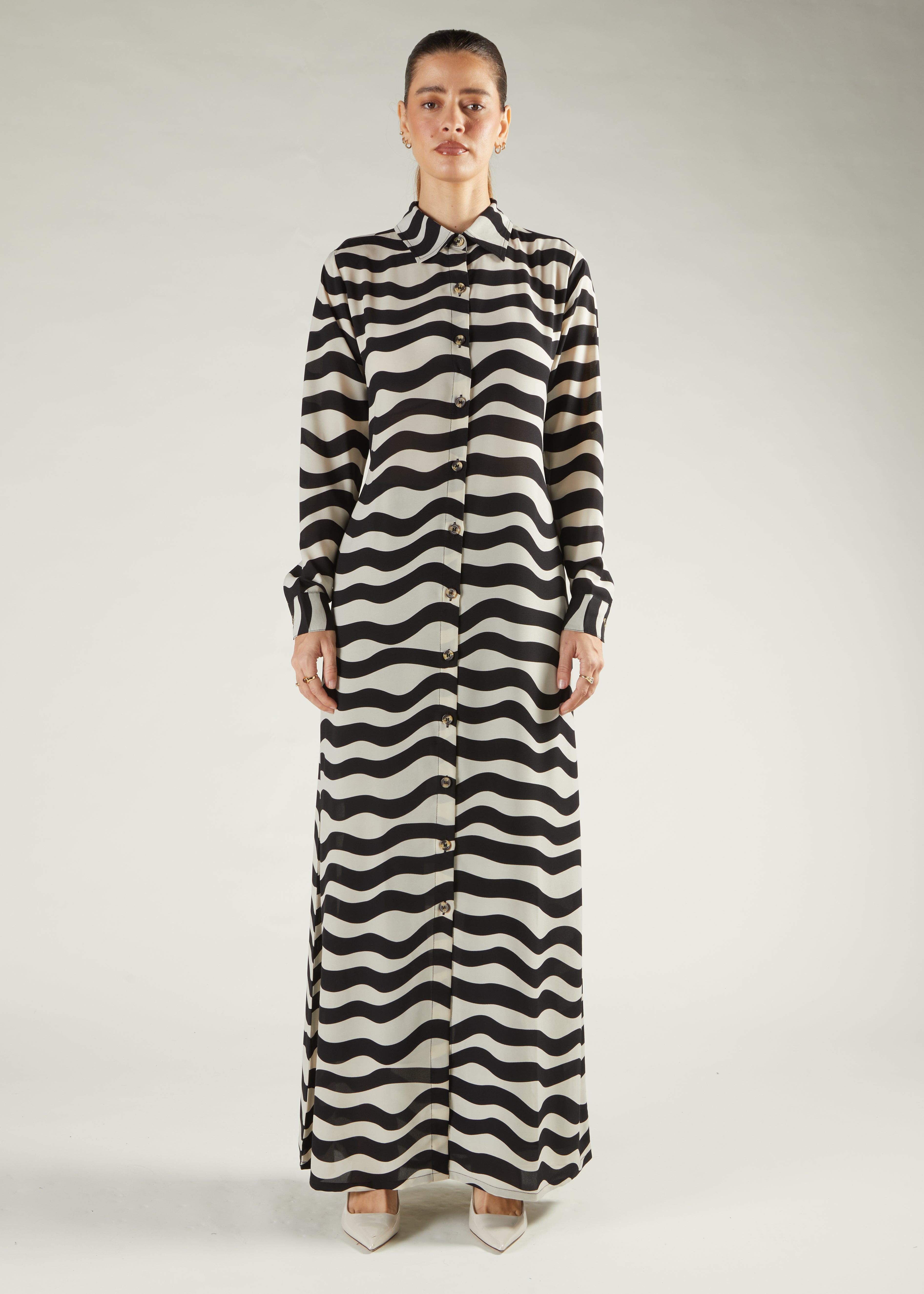 This maxi dress has a monochromatic print made from lightweight fluid fabric. Perfect for formal wear or casual occasions. It features standard collars, discreet side pockets, self-fabric belt and a button opening all the way down. Upper maxi has a fitted silhouette and if you prefer a looser fit you may wish to size up.