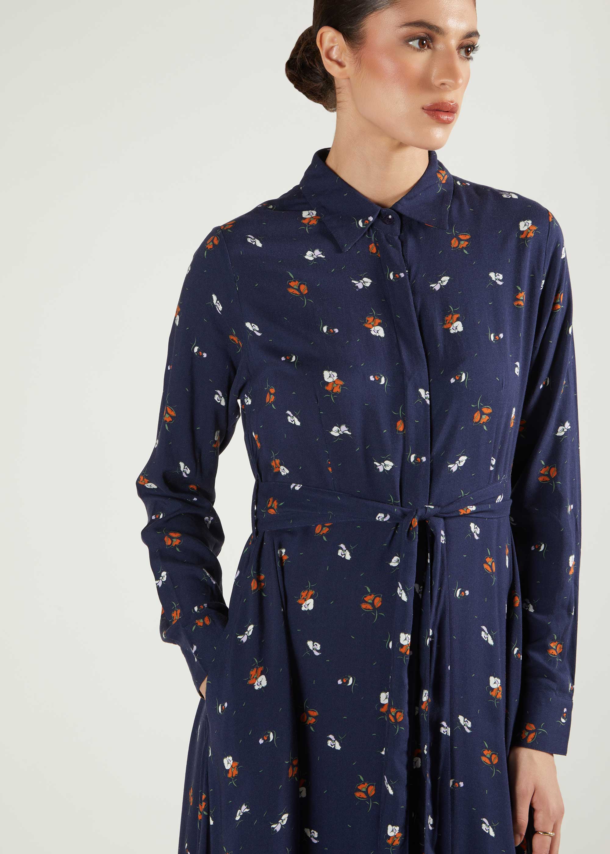 This classic shirted maxi dress features standard collars, a button-through front, shirt cuffs, and a detachable belt to define the waist. Made from a soft marina fabric, it showcases a print ideal for winter wear.