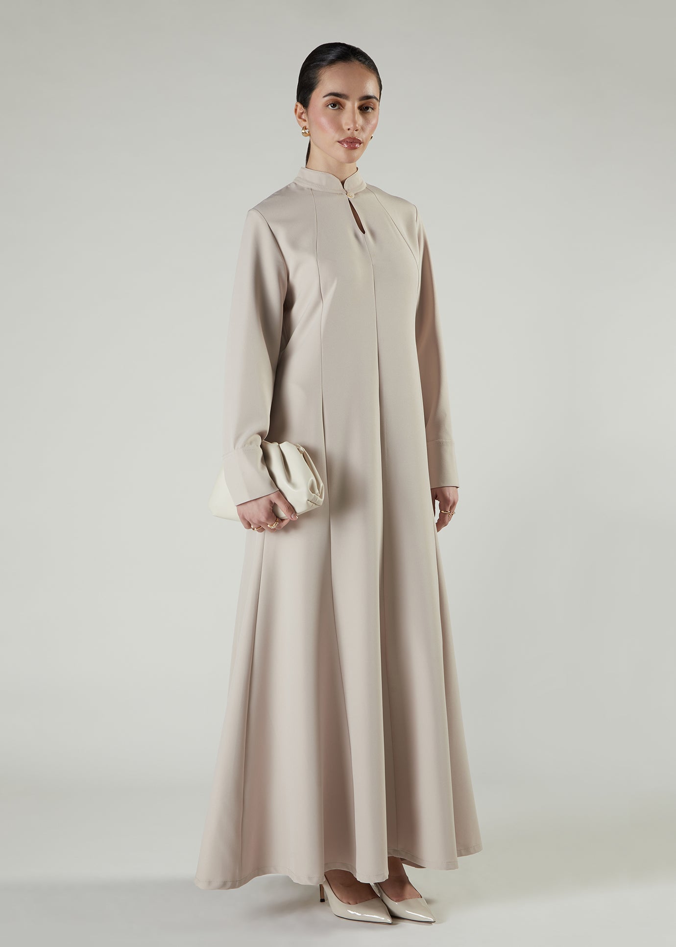 A fit and flare style abaya cut in panels to give a structured but elegant look.
