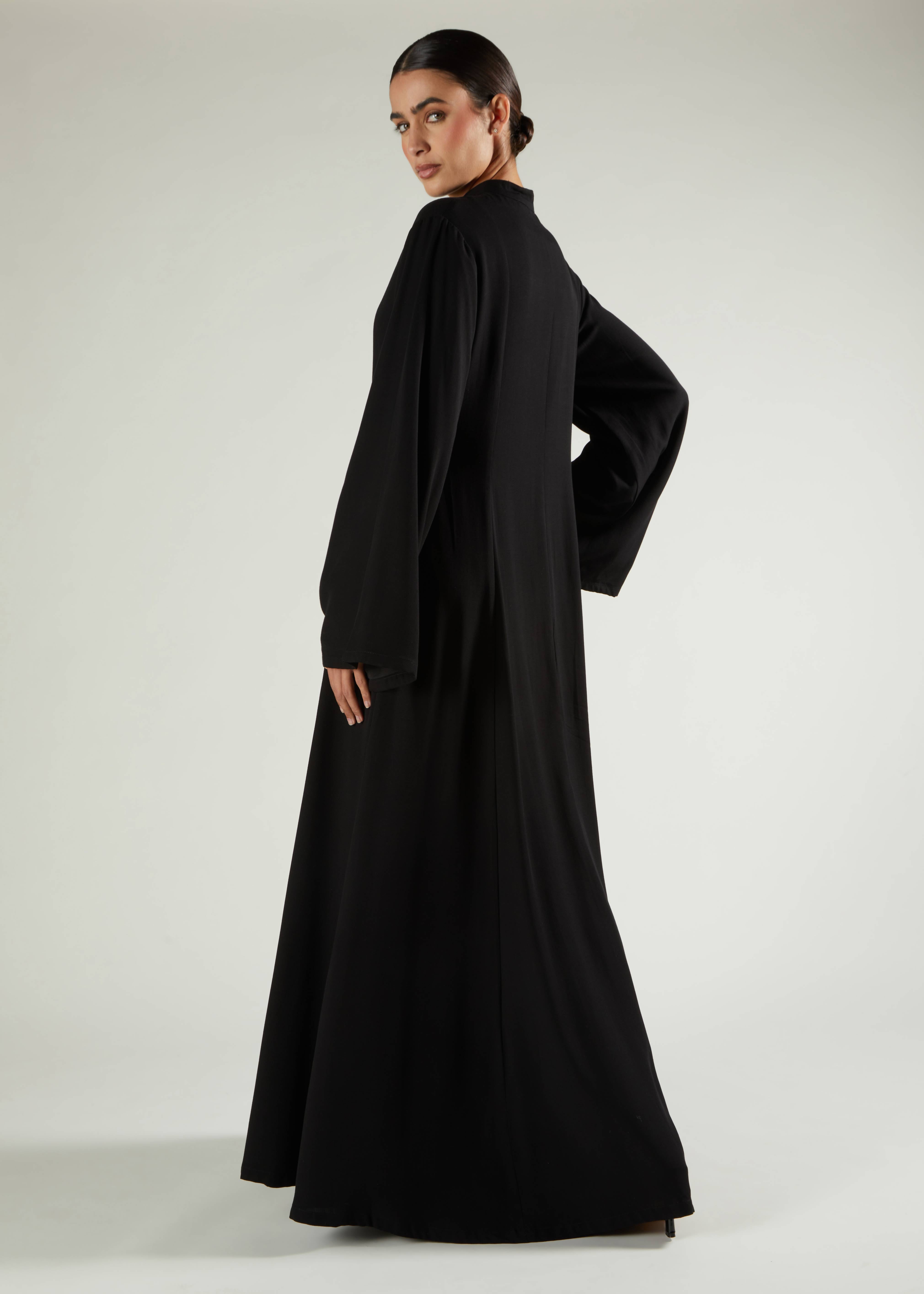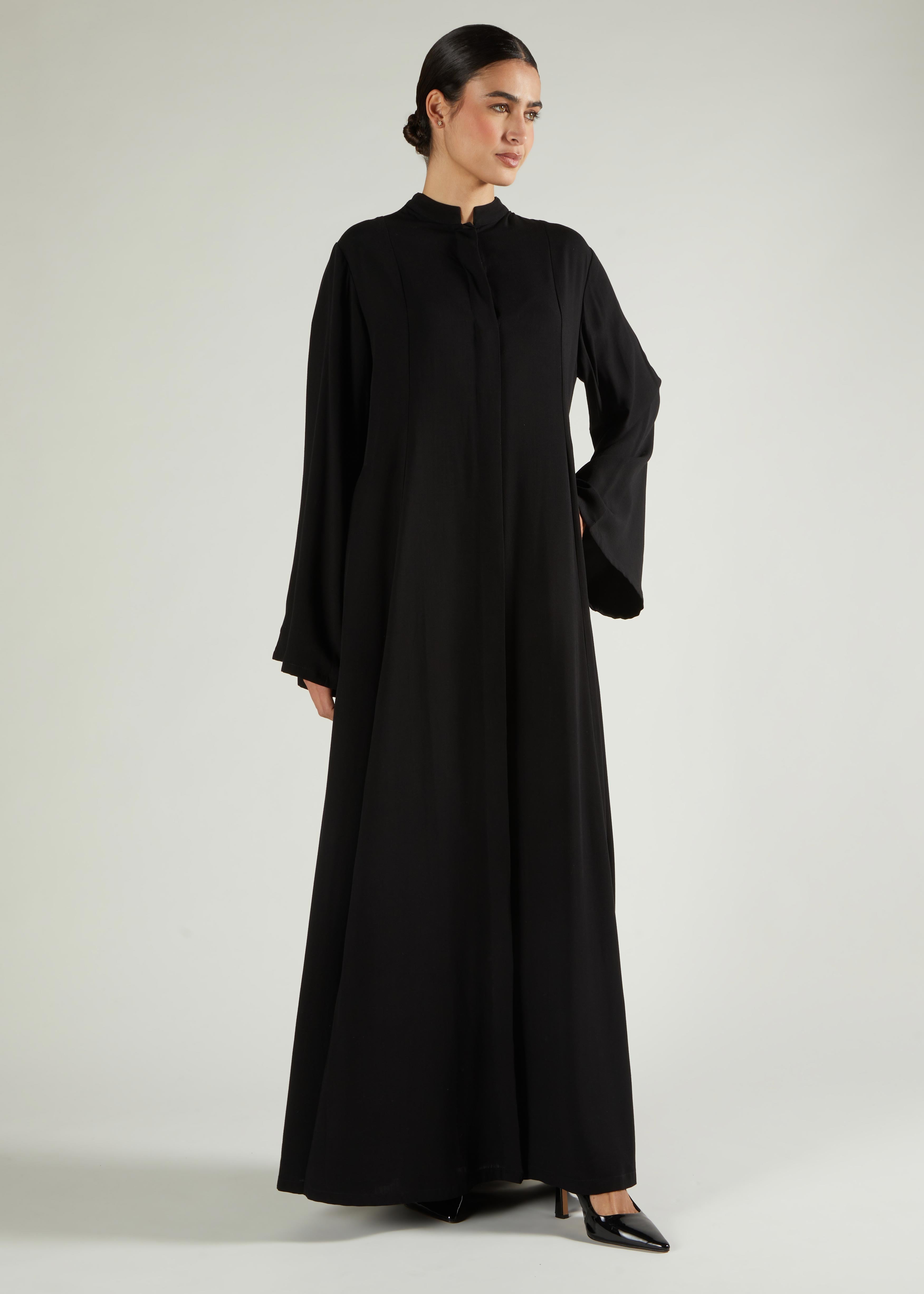 A timeless abaya that blends simplicity with sophistication. Designed with a flowing A-line silhouette and a structured stand collar, this piece offers a refined minimal look while ensuring all-day comfort. The concealed placket keeps the design sleek, and the discreet side pockets add a touch of practicality, making it a versatile staple for both everyday wear and special occasions.