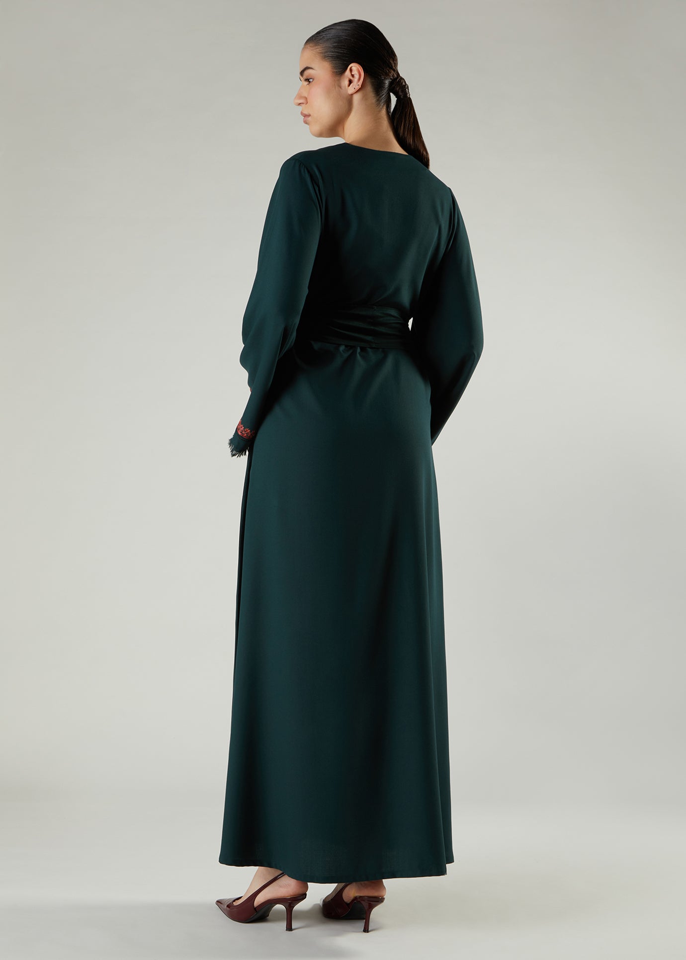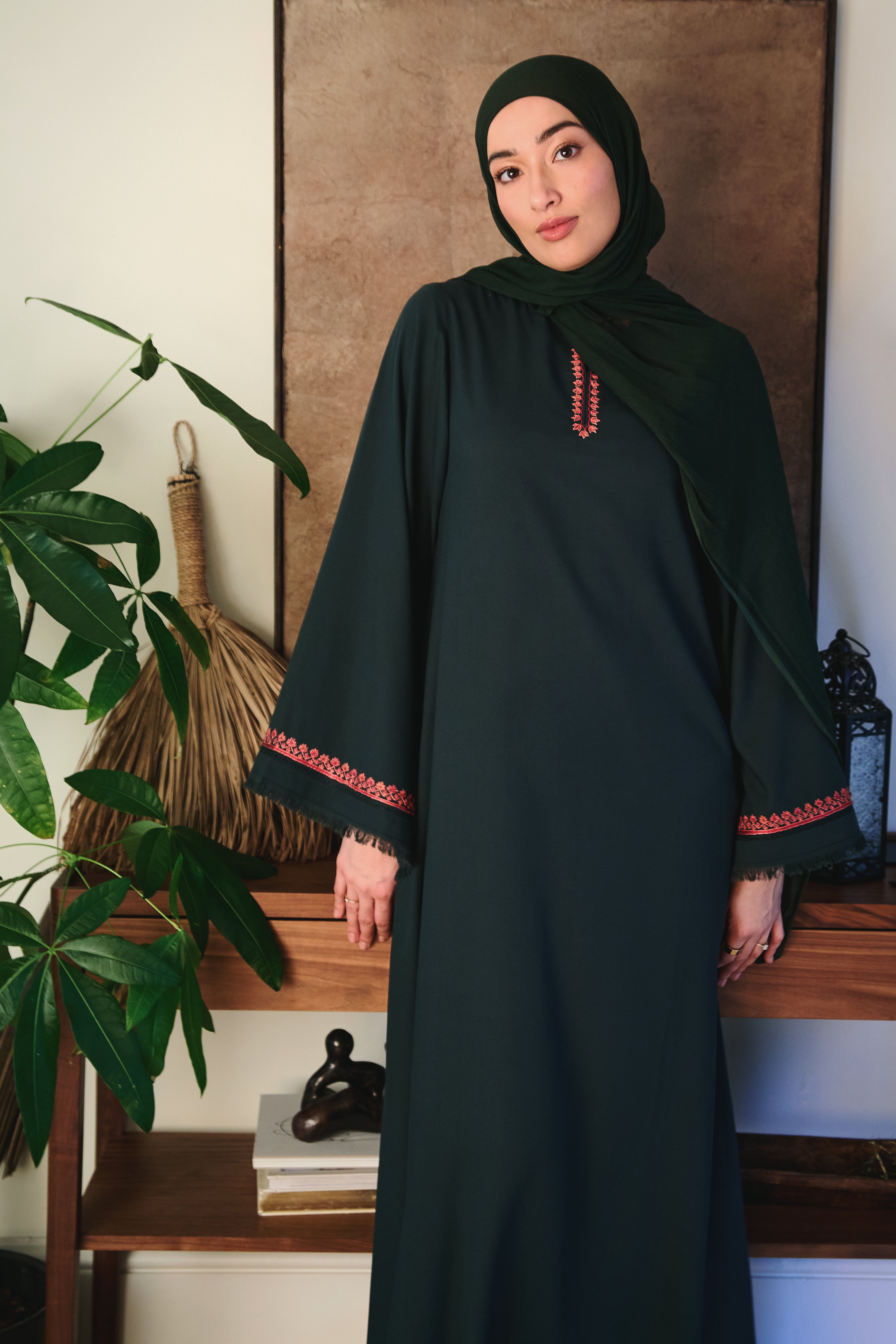 Abaya features floral Kashmiri inspired embroidery on the neckline and sleeves; a delicate row of bright saffron flowers adds a pop of colour against the deep green Abaya. Features flared style sleeves with a fringed edge for a dramatic finish to the garment.