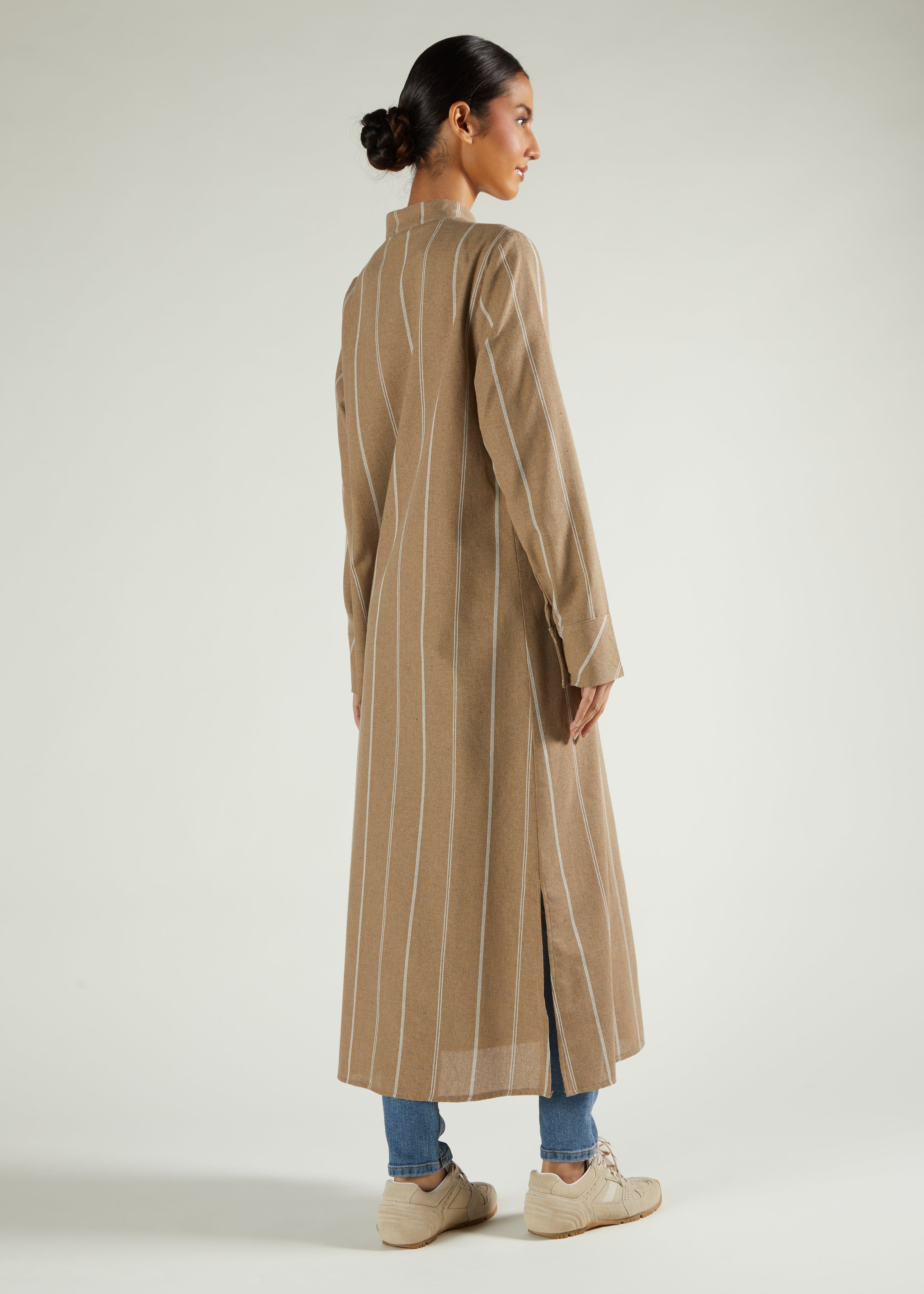 This Coffee pinstriped shirt is a wardrobe essential that works year-round. Made from a lightweight jute linen-like fabric, it's designed to be worn solo or layered over other pieces, making it perfect for holidays. The generous length gives you flexibility - style it as a maxi dress or wear it as a mid-length shirt. Pair it with pieces from our Second Skin range to create your ideal look.