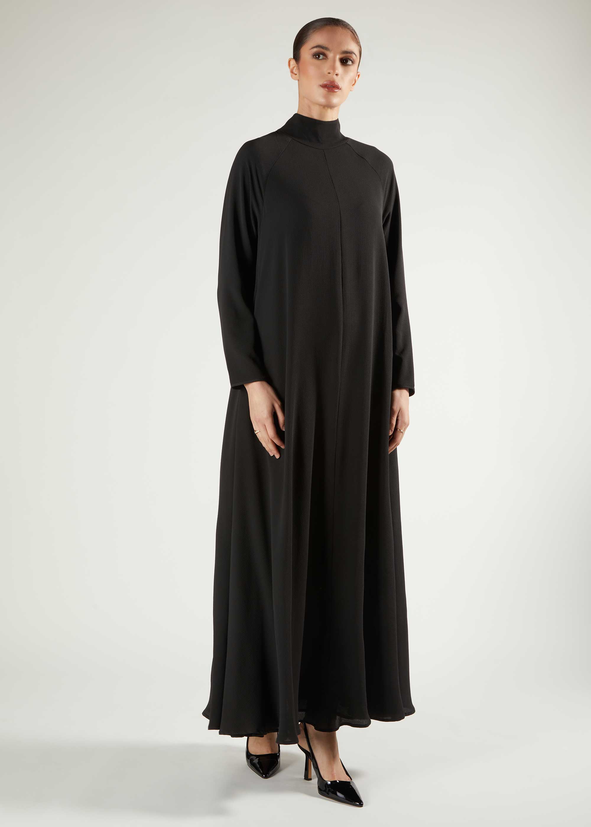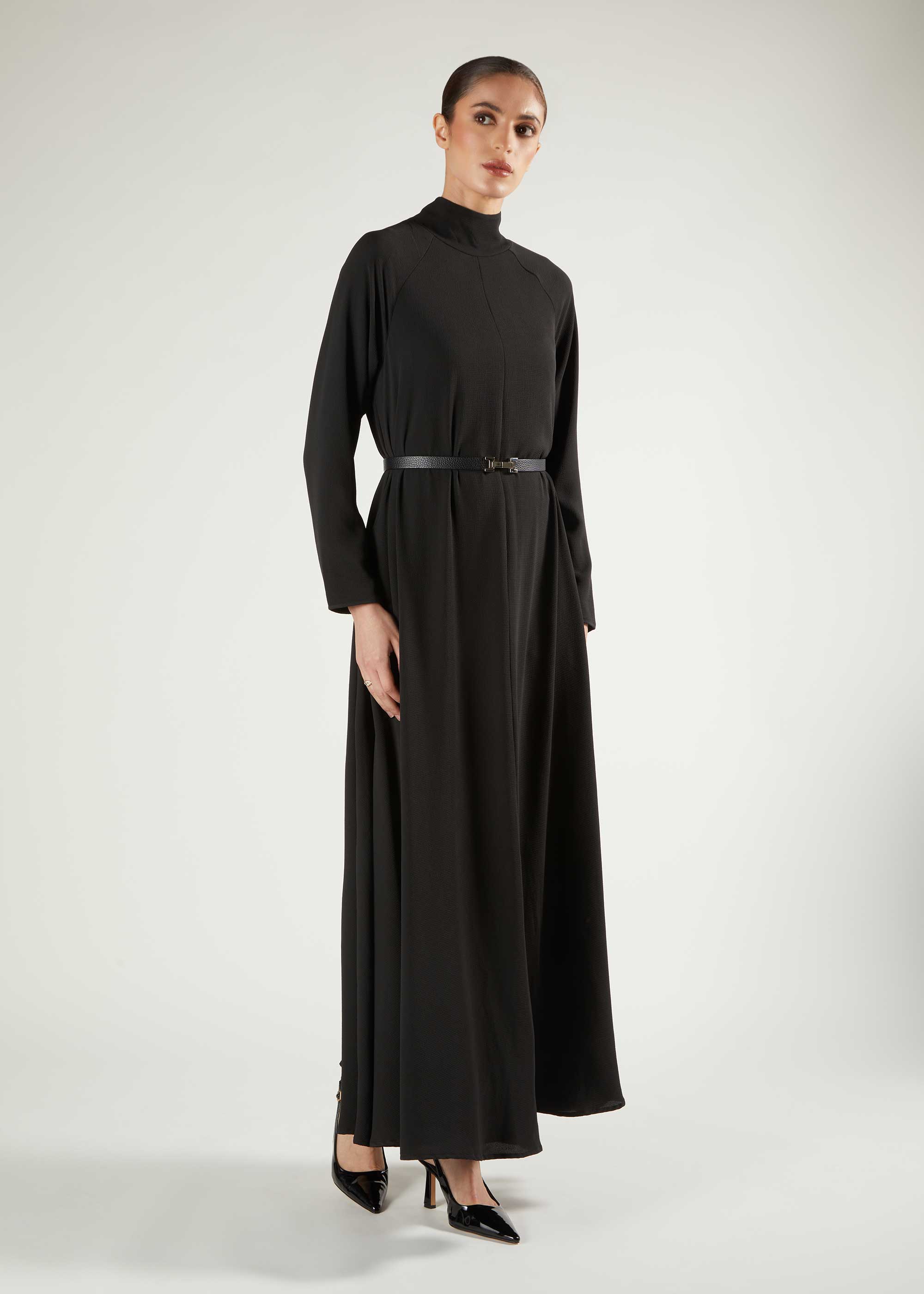 This sophisticated Abaya showcases a high neckline and is made from a self-printed jacquard style fabric that combines fluidity with modesty. Ideal for special occasions and formal settings, it delivers refined elegance. Please note, the belt shown is styled for presentation and is not included with this item.