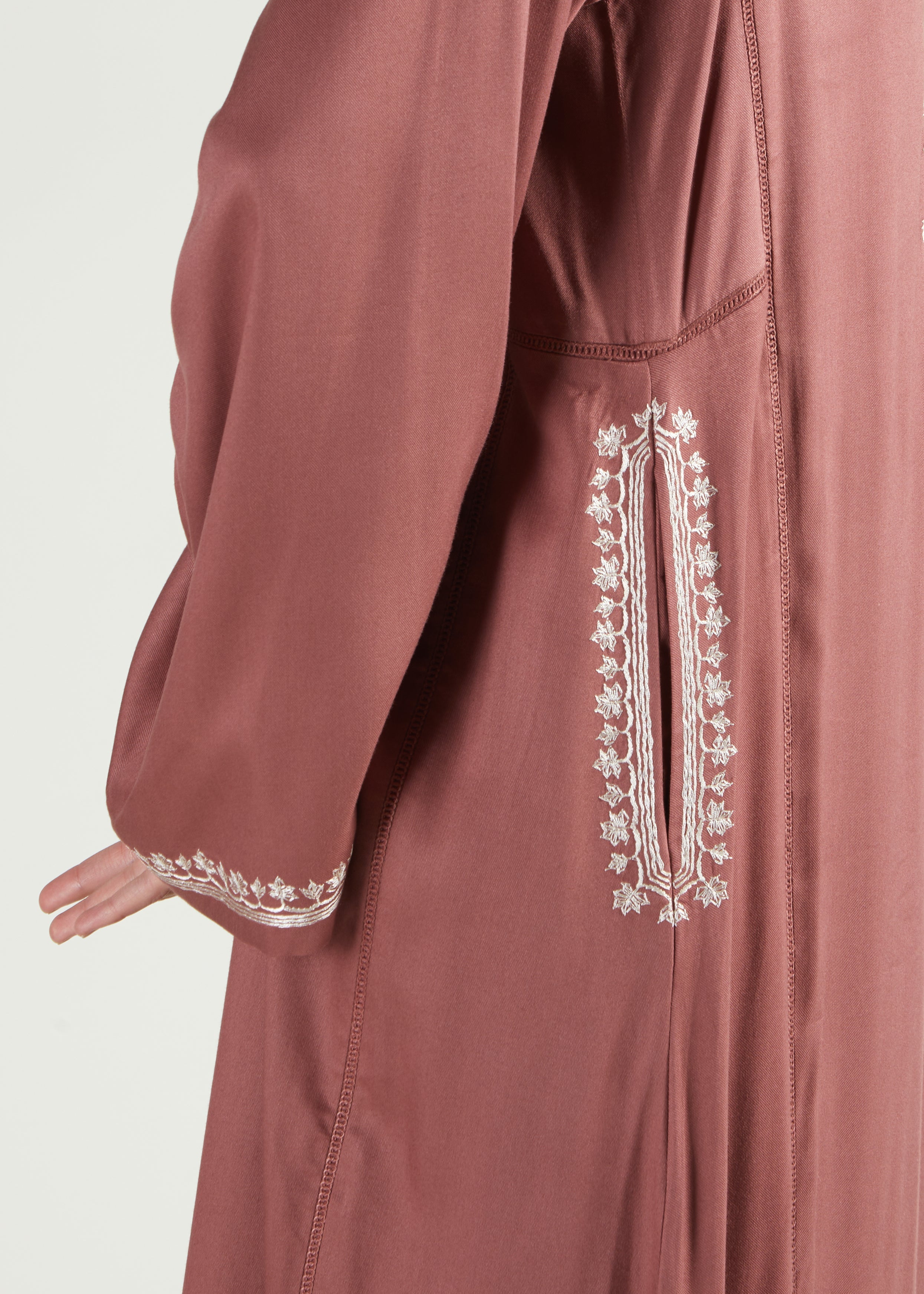 The Rayyan Abaya brings together comfort and beauty in one piece. Designed with intricate ivory embroidery across the bodice, sleeves, and pocket details, it pairs perfectly with the soft, muted rose twill fabric. The relaxed A-line shape ensures ease of movement, while functional pockets add practicality to this timeless design.