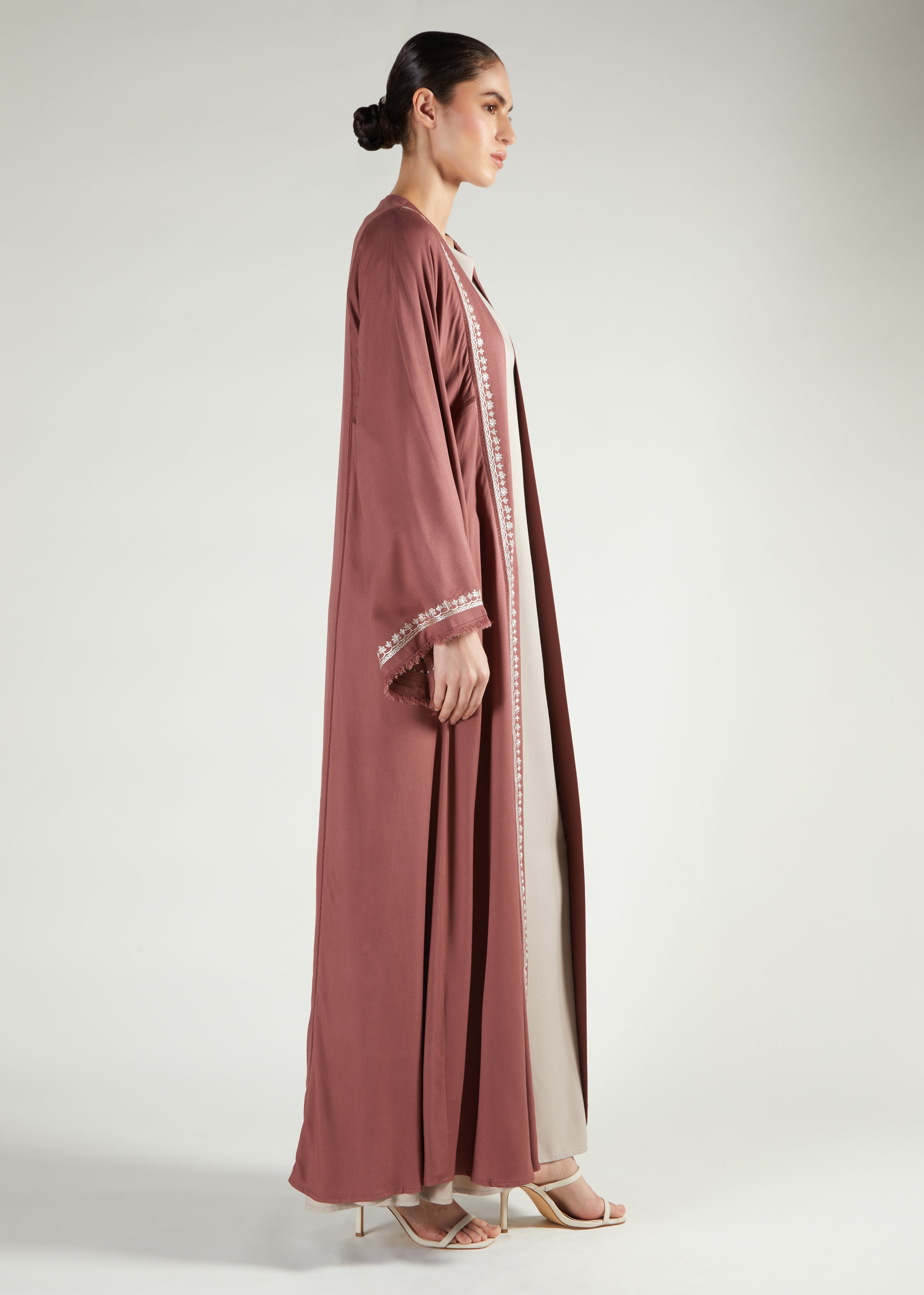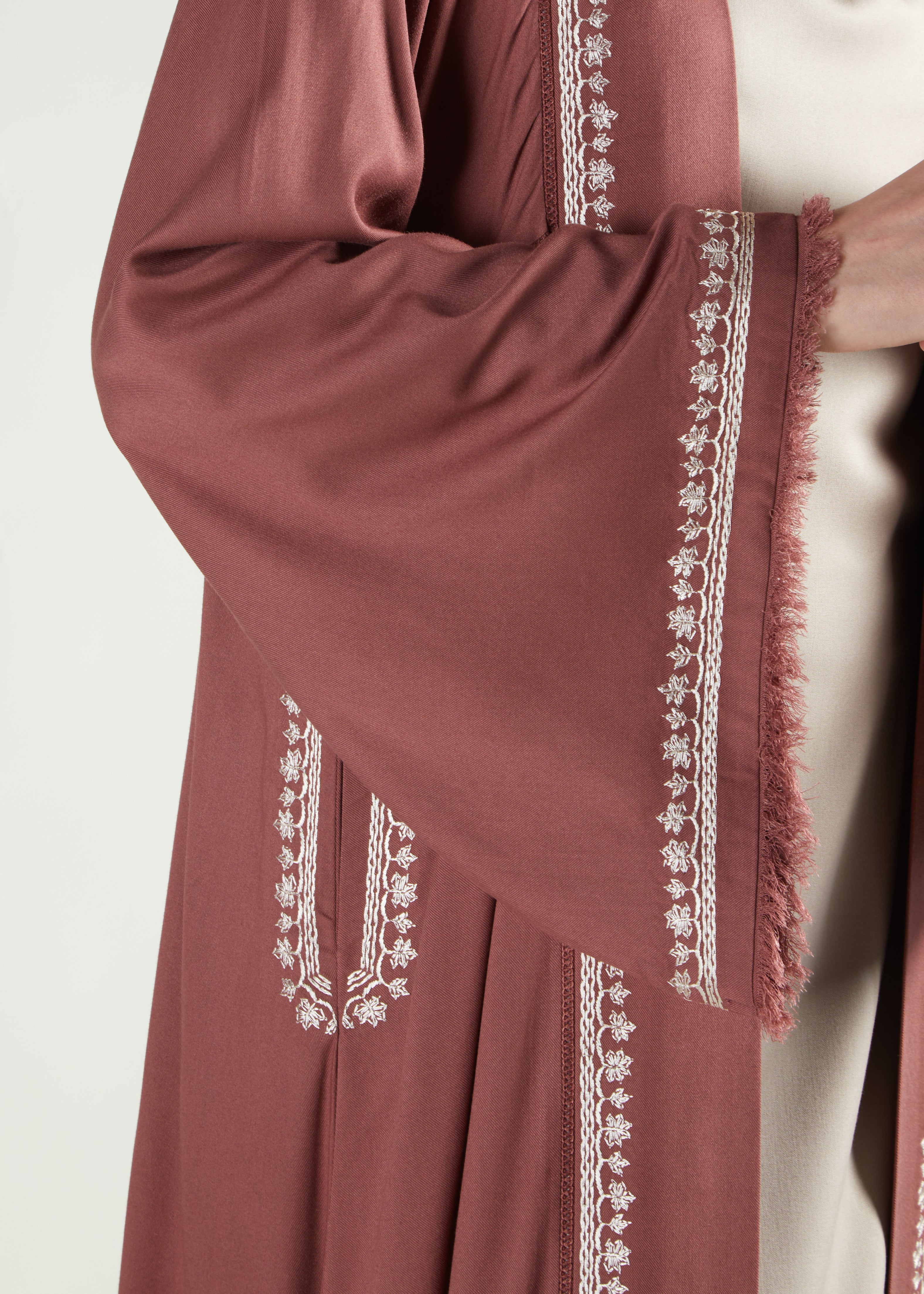 Featuring intricate ivory toned embroidery on the placket, sleeves and side pocket area. The embroidery is a beautiful contrast of light on the black soft twill fabric. Abaya features functional side pockets as well as soft fringed sleeves and elegant embroidery make this a timeless addition to your wardrobe.