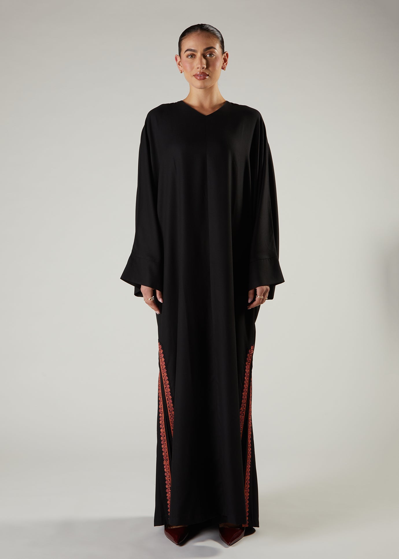 Saffron Kaftan is designed with a modest silhouette. A plain black canvas featuring beautiful saffron coloured intricate embroidery on the side slits. Features side pockets and a subtle V neckline and has a seam running down the front