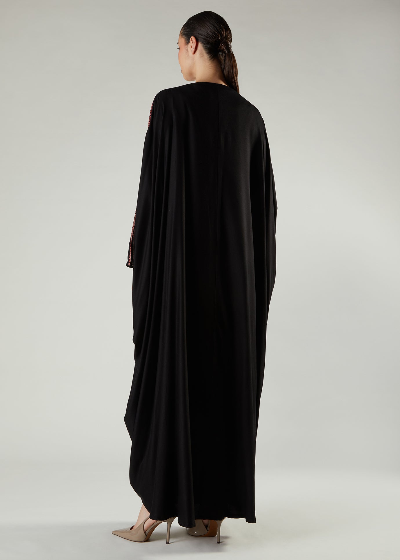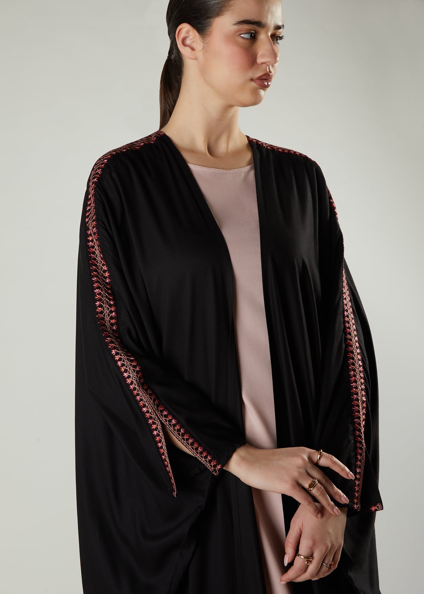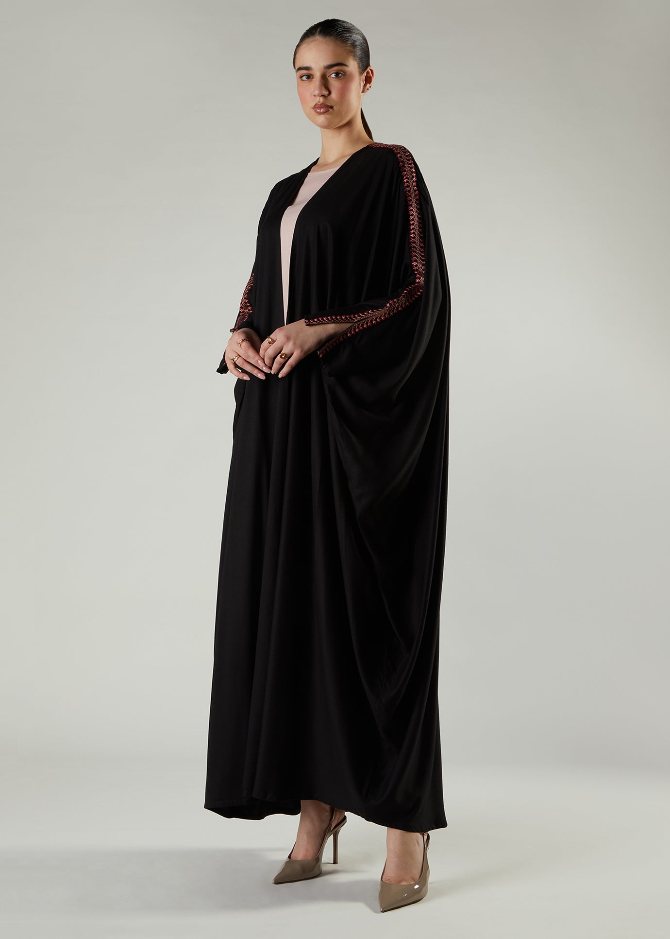 Saffron Open Abaya features beautiful saffron coloured intricate floral embroidery on the shoulder and sleeves. The Abaya has a loose fit silhouette, and the fabric has a fluid look and feel. Pair with one of our full slip dresses to complete your look