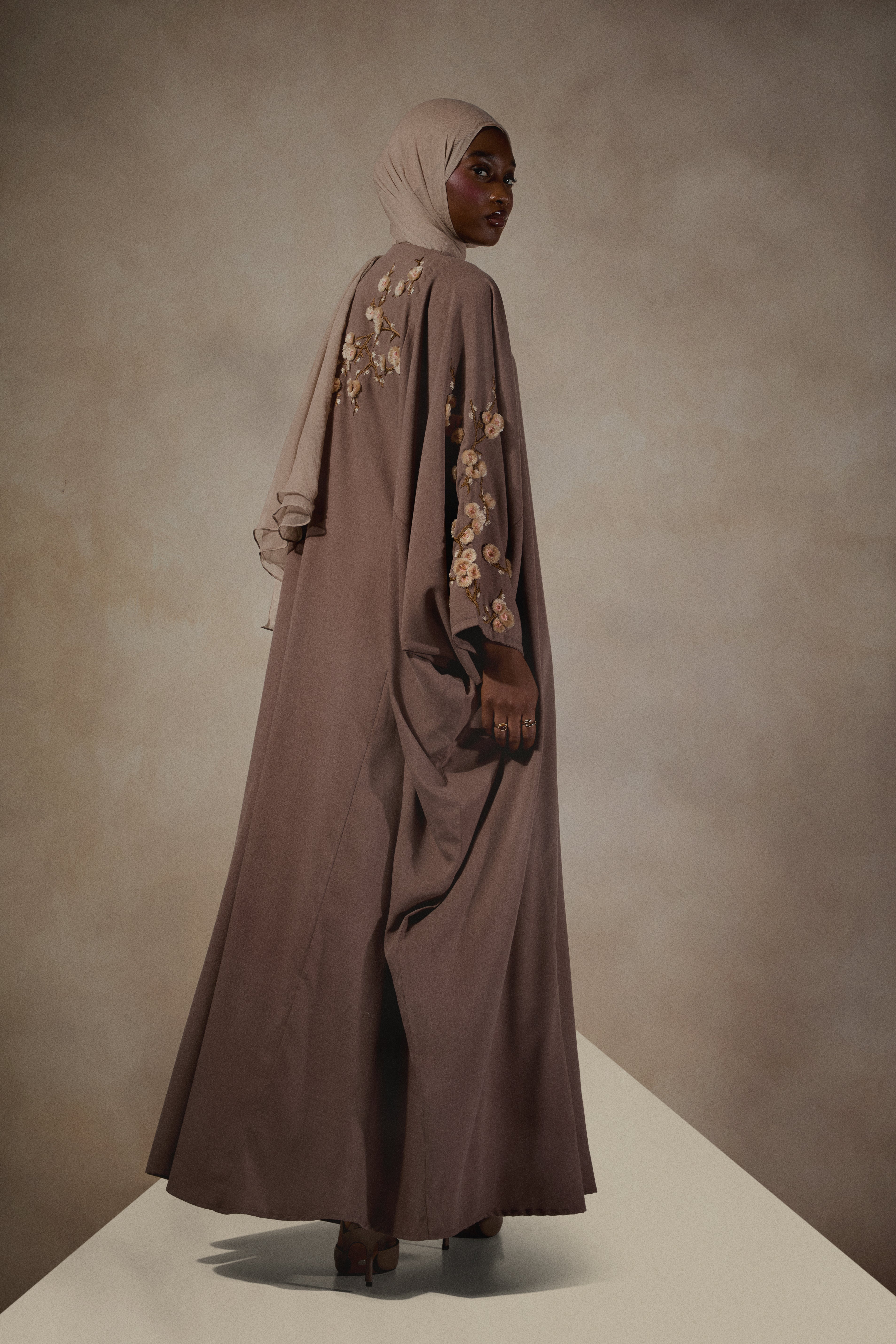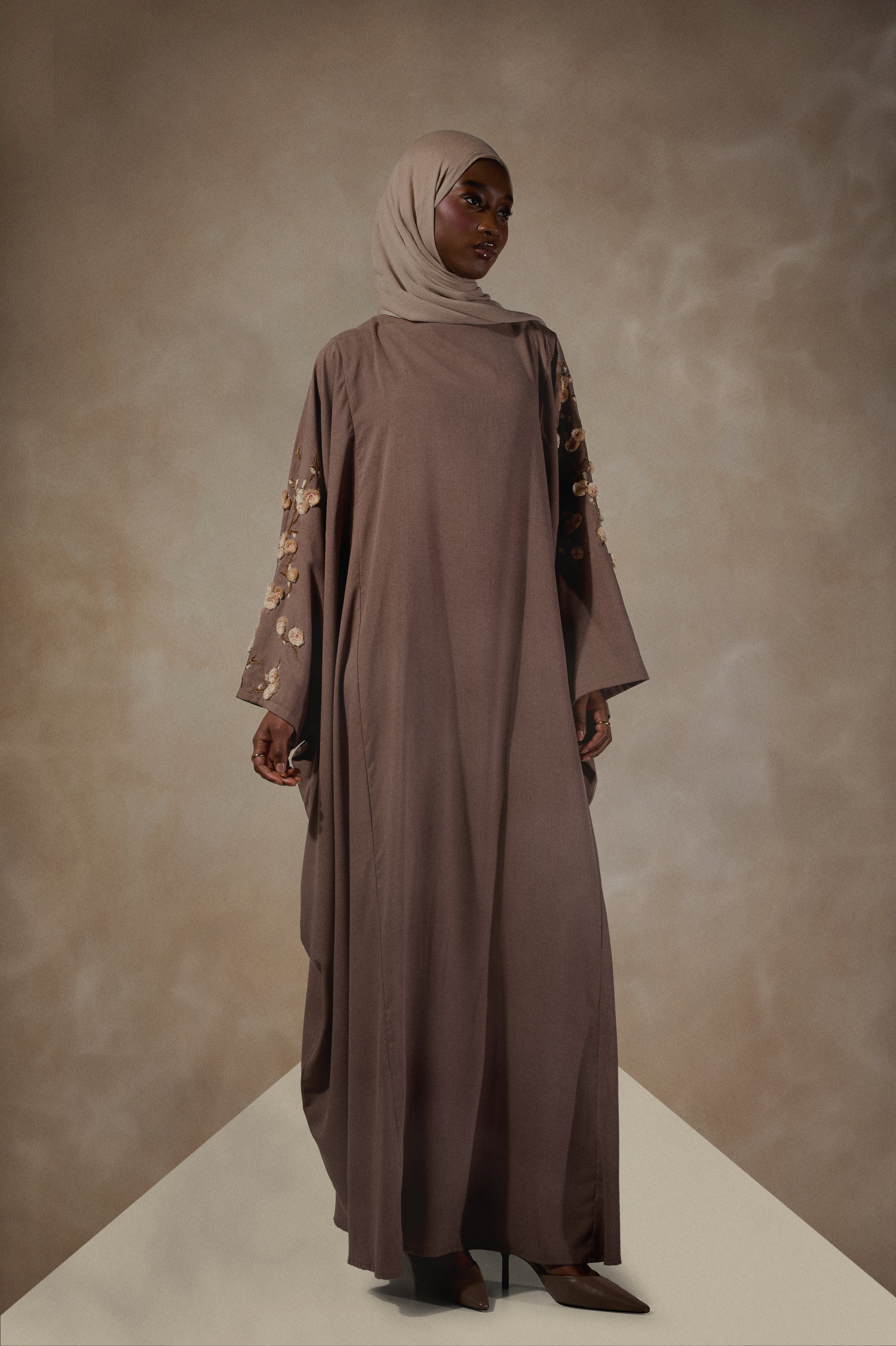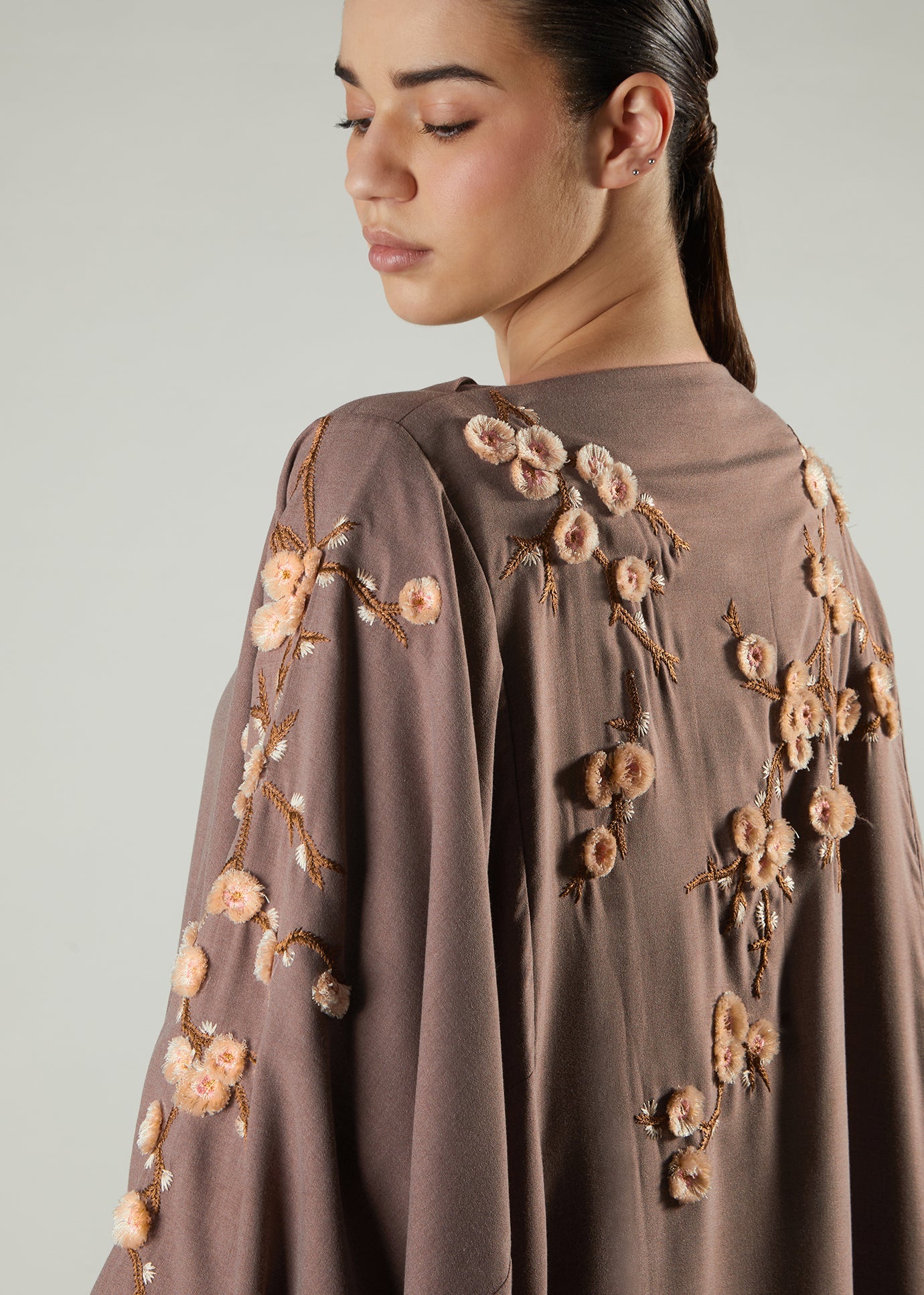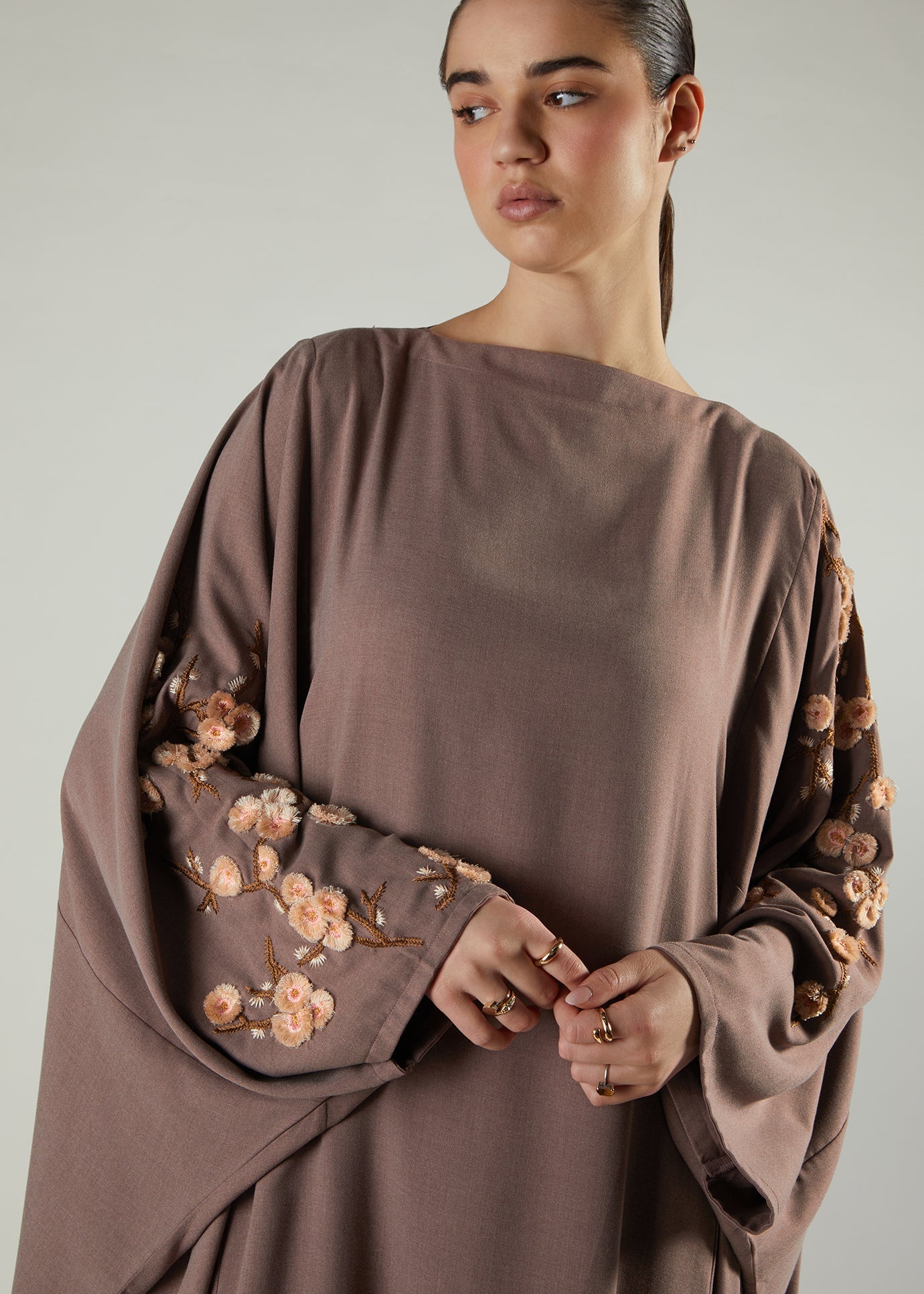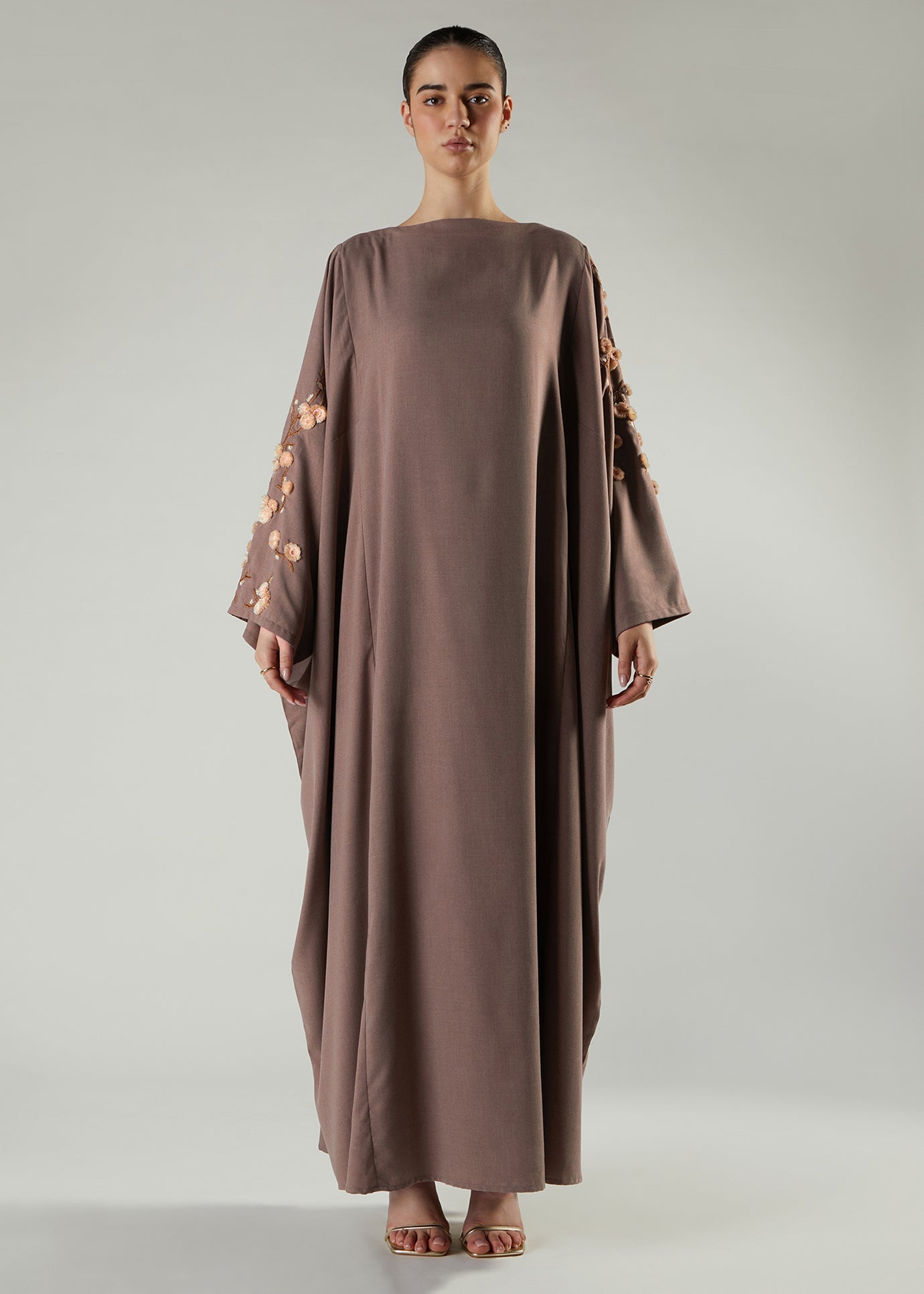 Cut in a timeless silhouette with dramatic elegance, Our Sakura Kaftan features embroidered flowers with a 3D effect lifting off the garment. The garment is in a bisque toned soft fabric with complimentary tonal flowers. Loose fitting yet elegant.