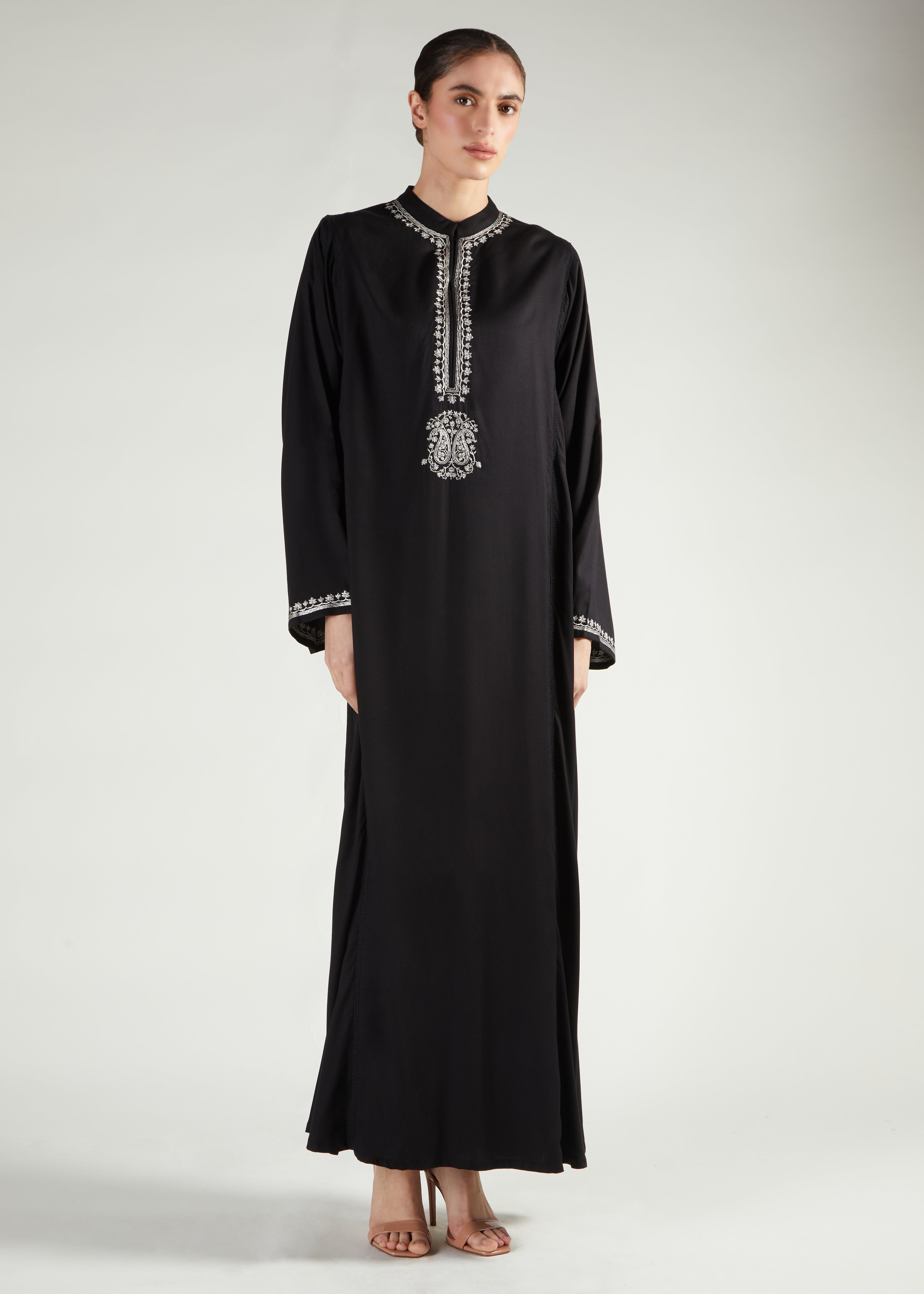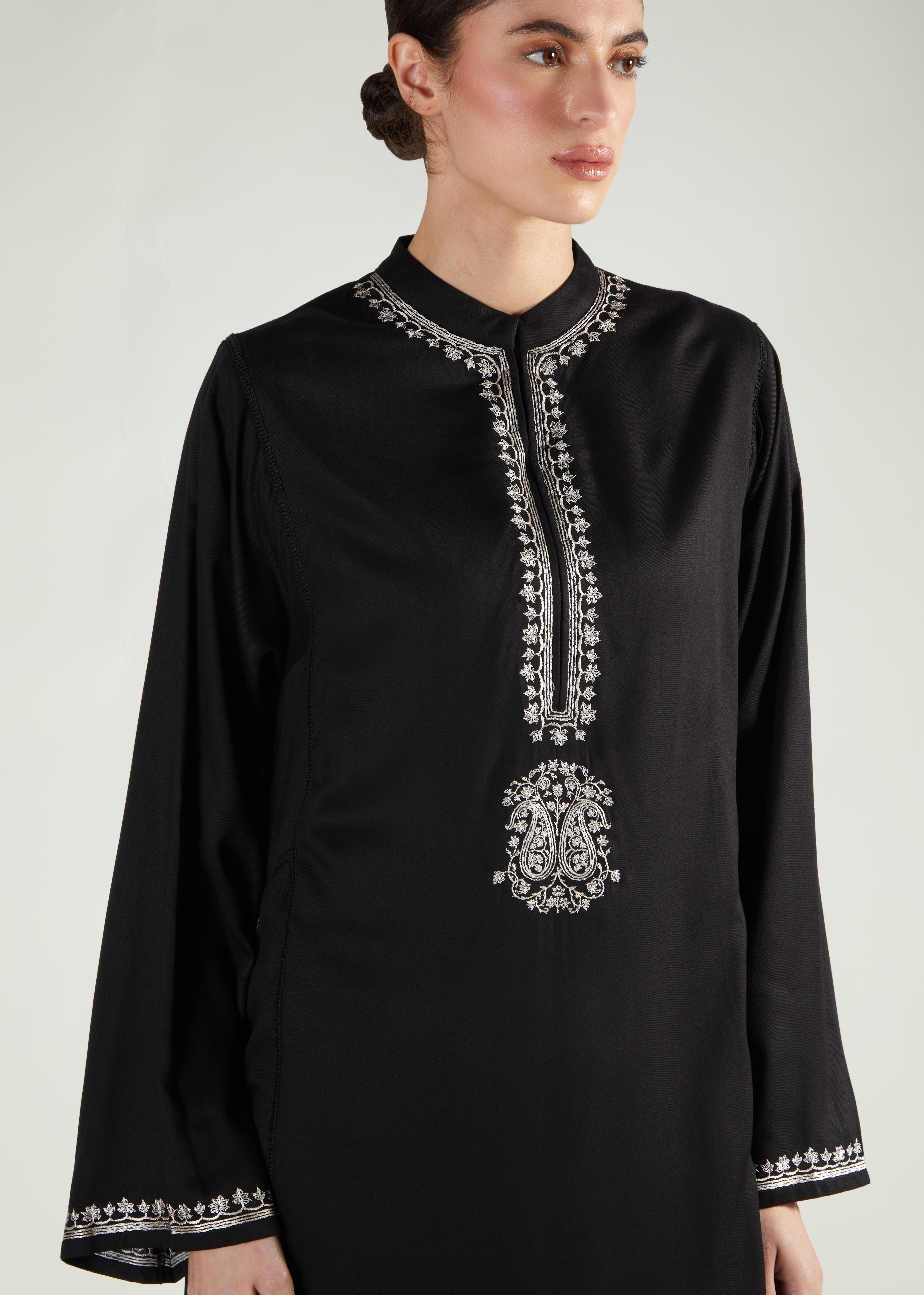 Featuring intricate ivory toned embroidery on the bodice, sleeves and side pocket area. The embroidery is a beautiful contrast of light on the black soft twill fabric. A line silhouette, functional side pockets and elegant embroidery make this a timeless addition to your wardrobe.