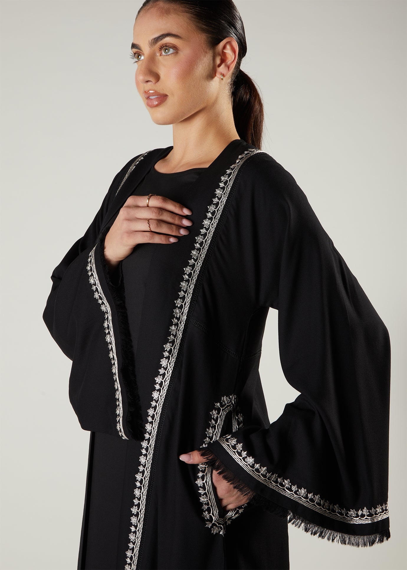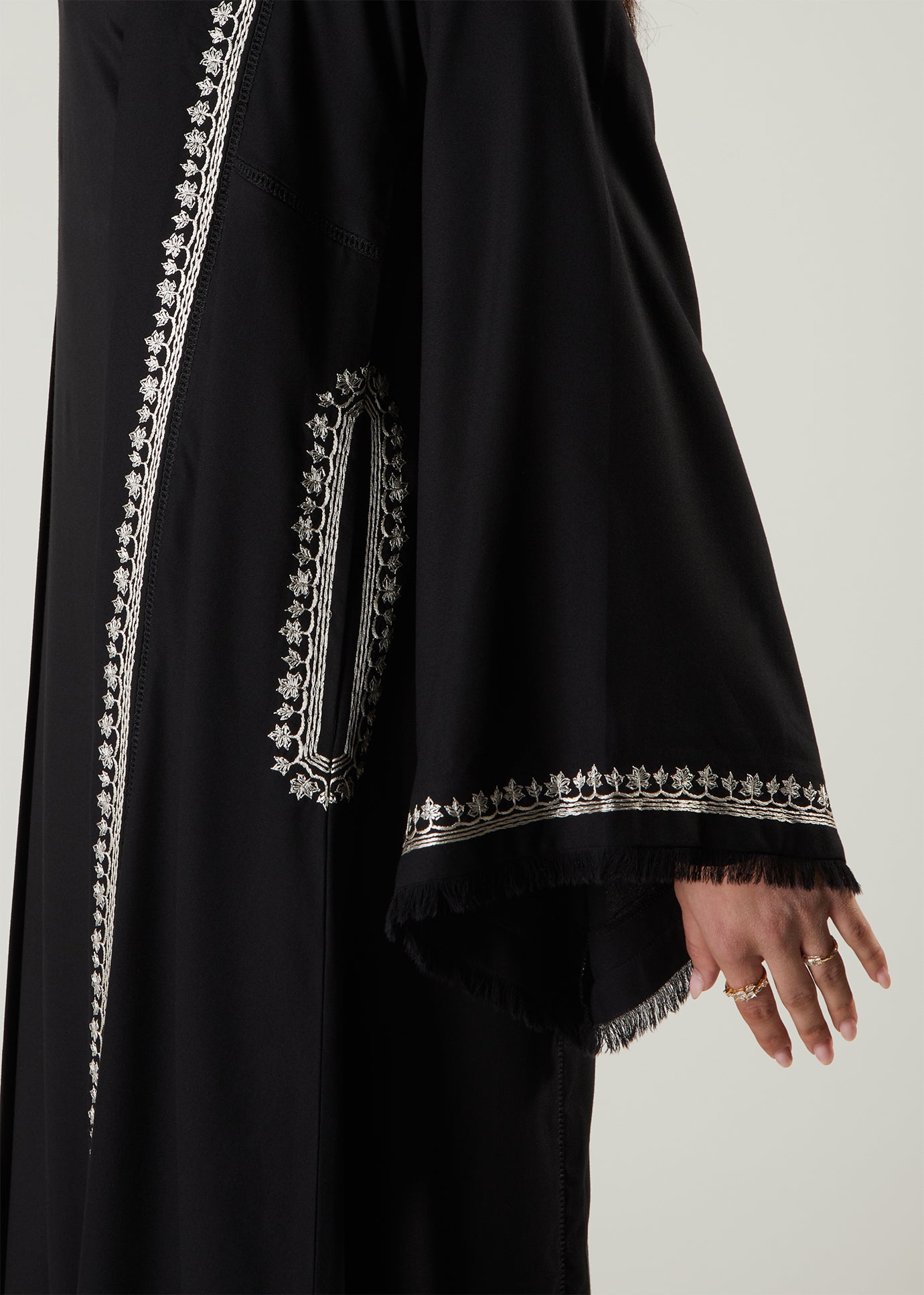 Featuring intricate ivory toned embroidery on the placket, sleeves and side pocket area. The embroidery is a beautiful contrast of light on the black soft twill fabric. Abaya features functional side pockets as well as soft fringed sleeves and elegant embroidery make this a timeless addition to your wardrobe.