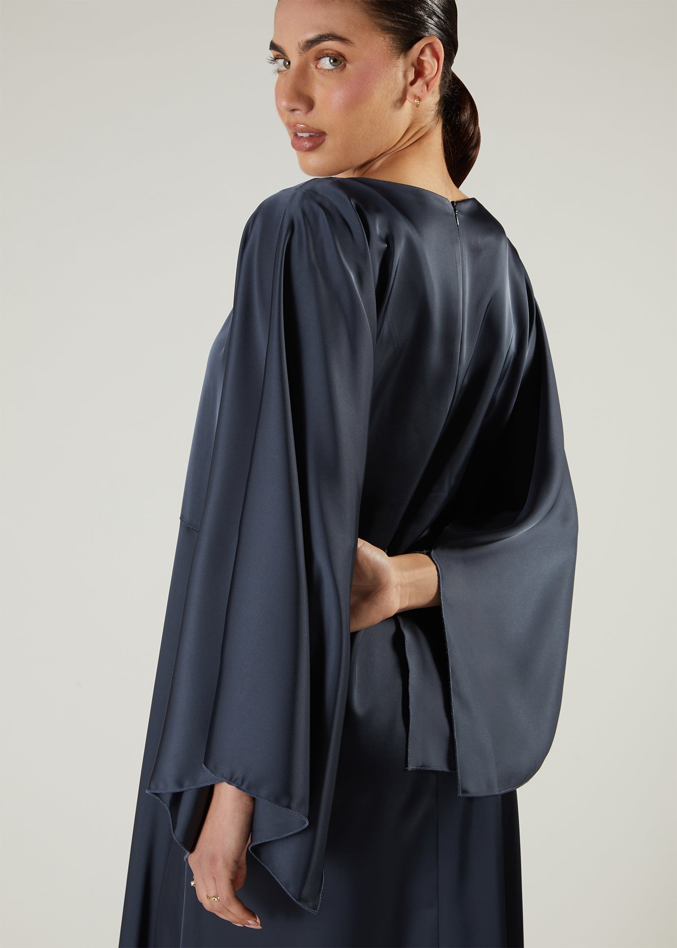 A fluid satin Abaya in a rich regal green shade, has loose fitting sleeves and a floaty modest silhouette.