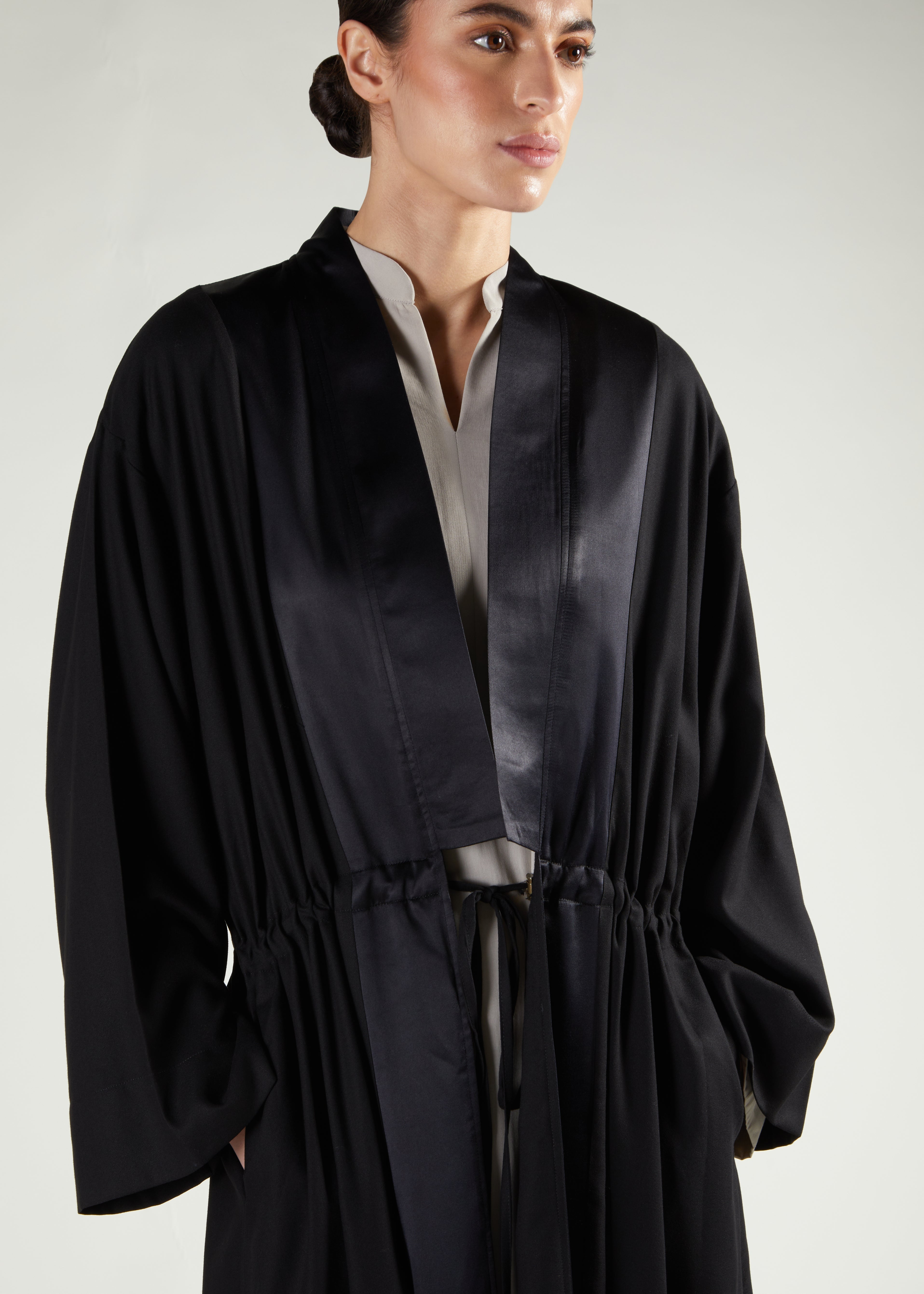This kimono has a modest silhouette and features a satin strip panel accentuating the garment, pair over our range of slips or your everyday outfits for an elegant cover up that's easy to style.