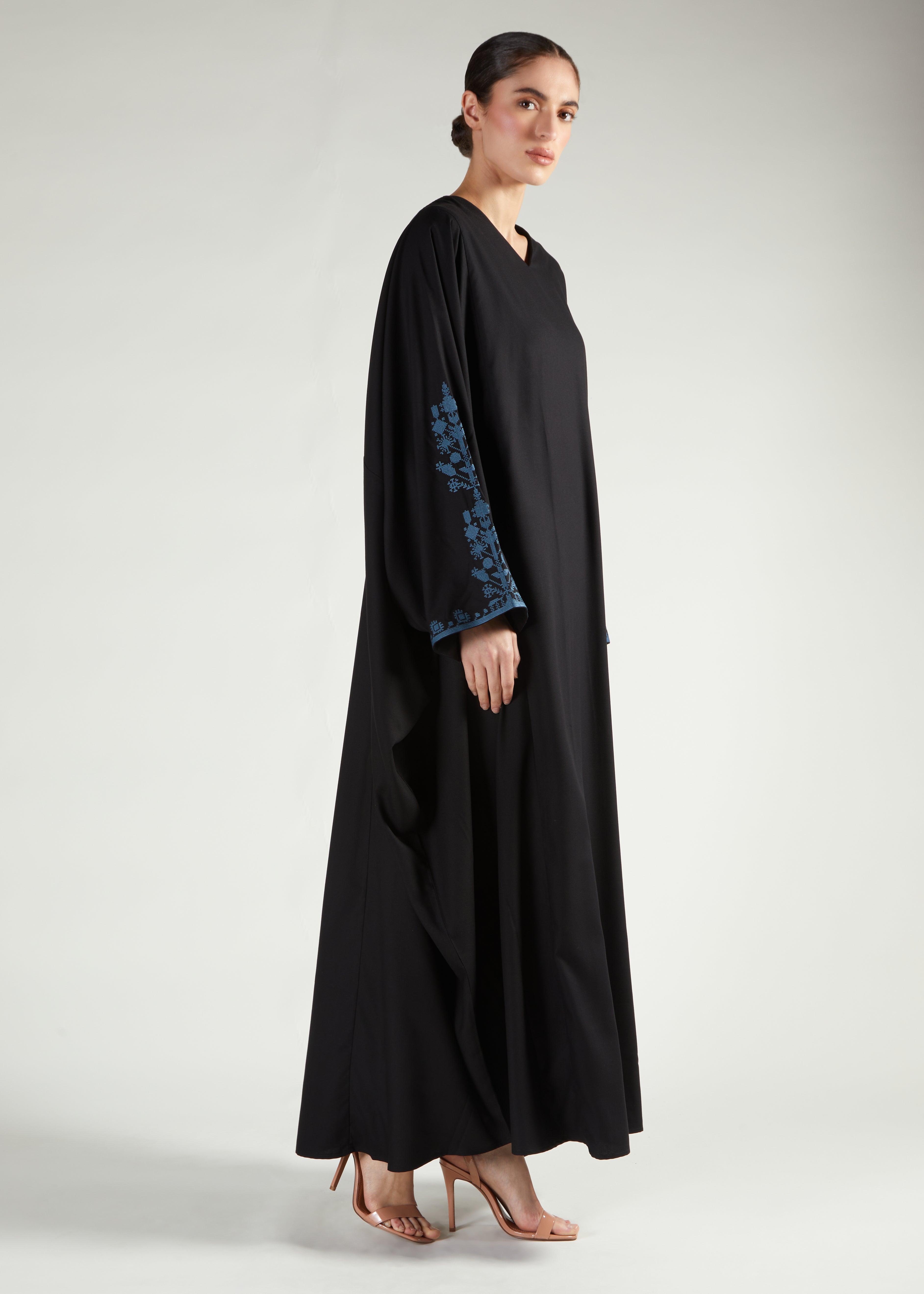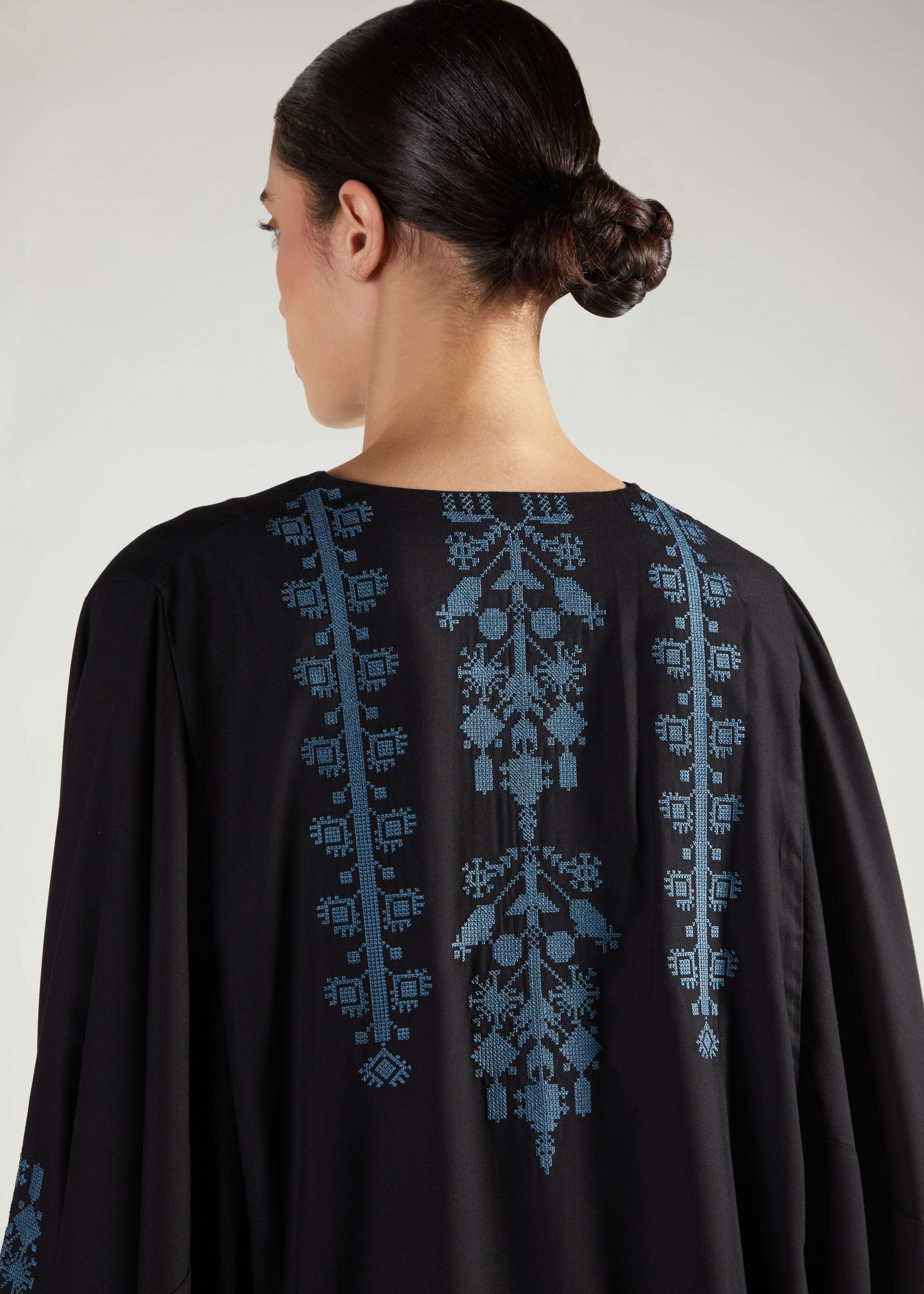 This black kaftan has beautiful Tatreez style royal blue embroidery that stands out against the black fabric. With its relaxed, modest fit, it's an ideal choice for Ramadan celebrations and everyday occasions.