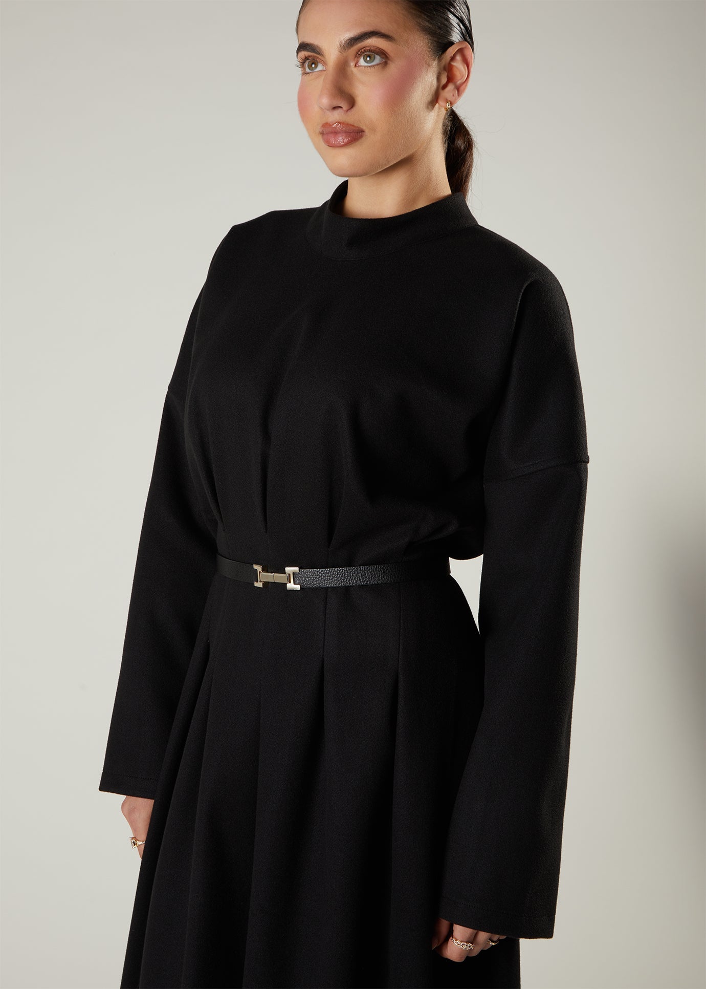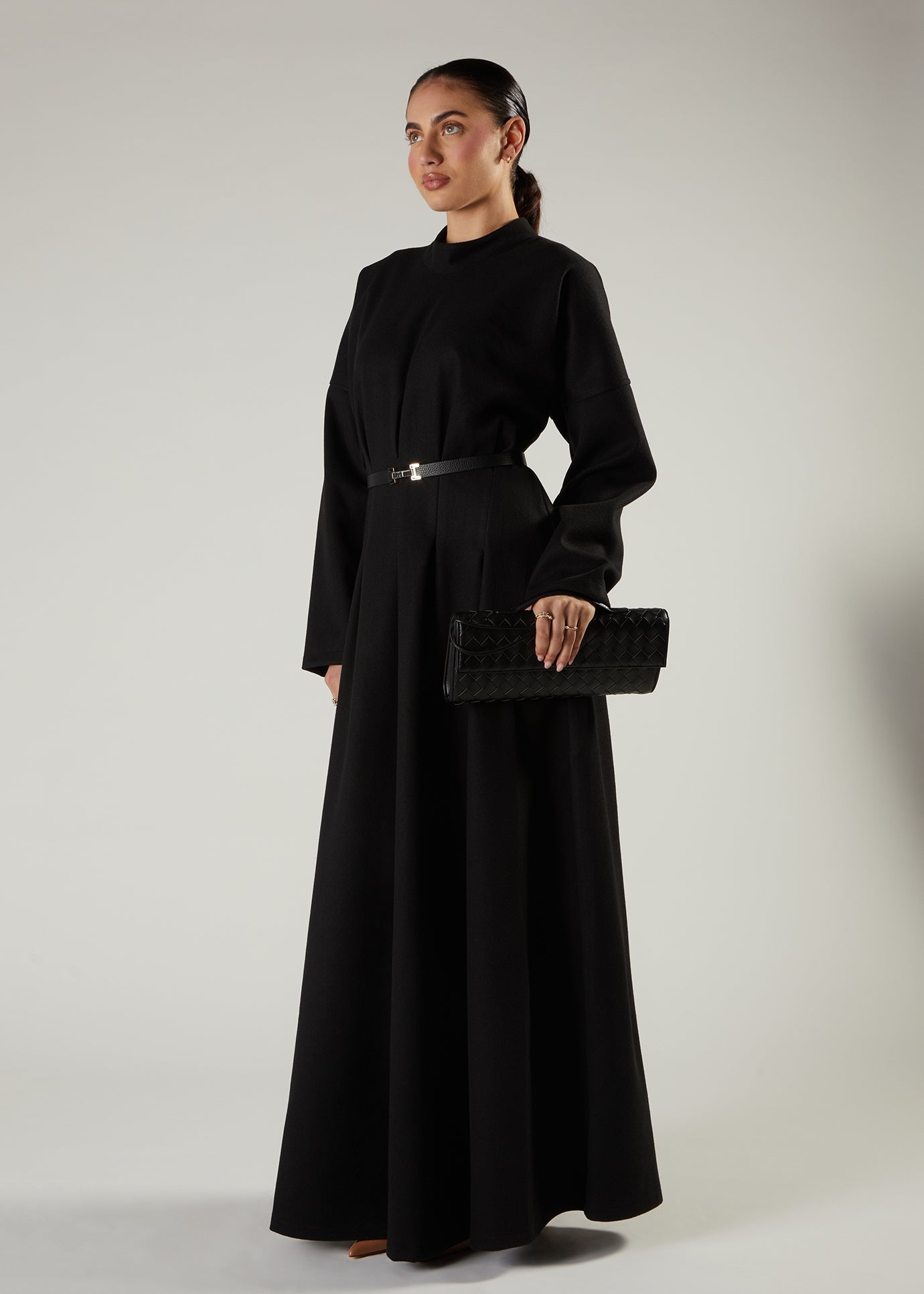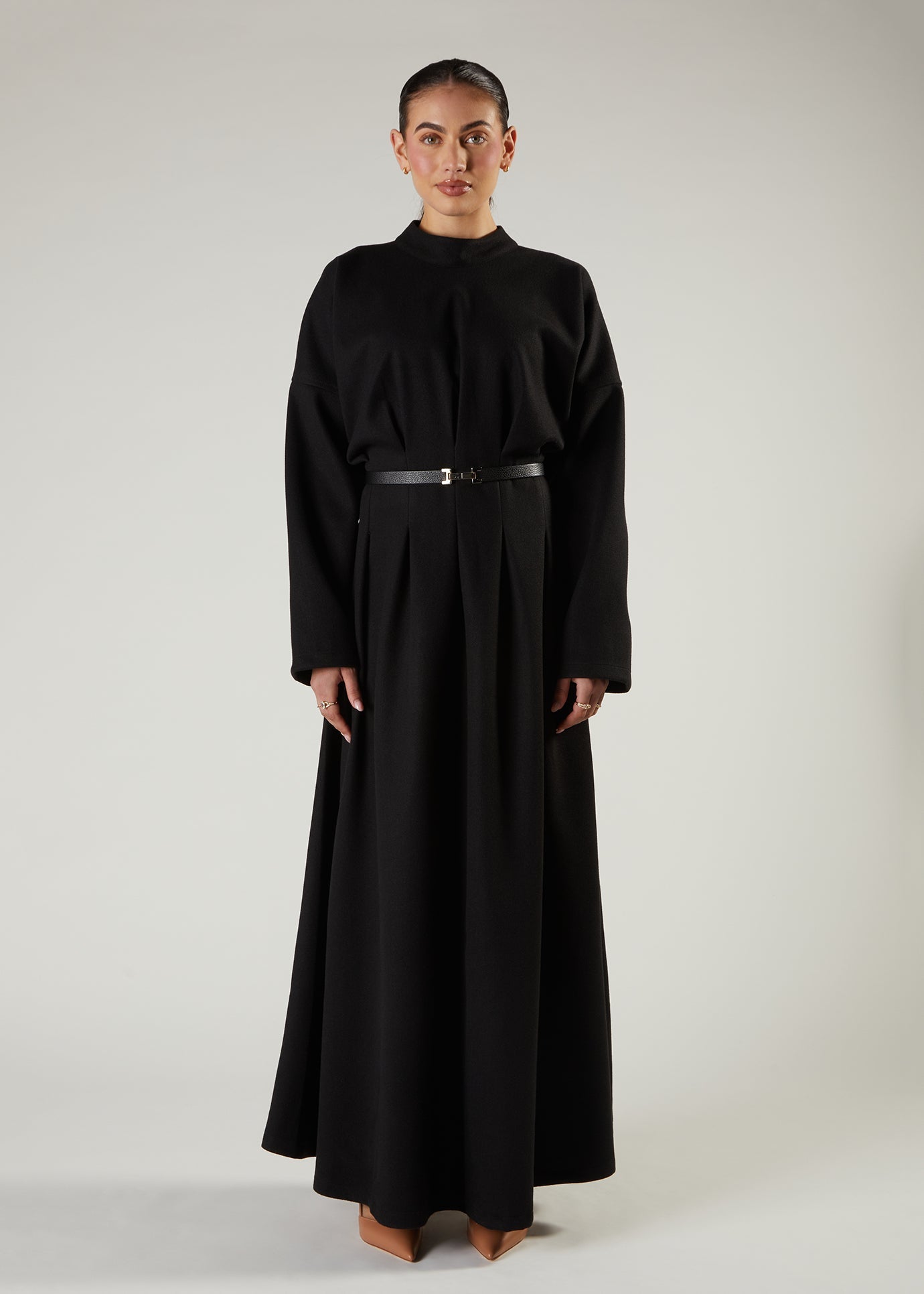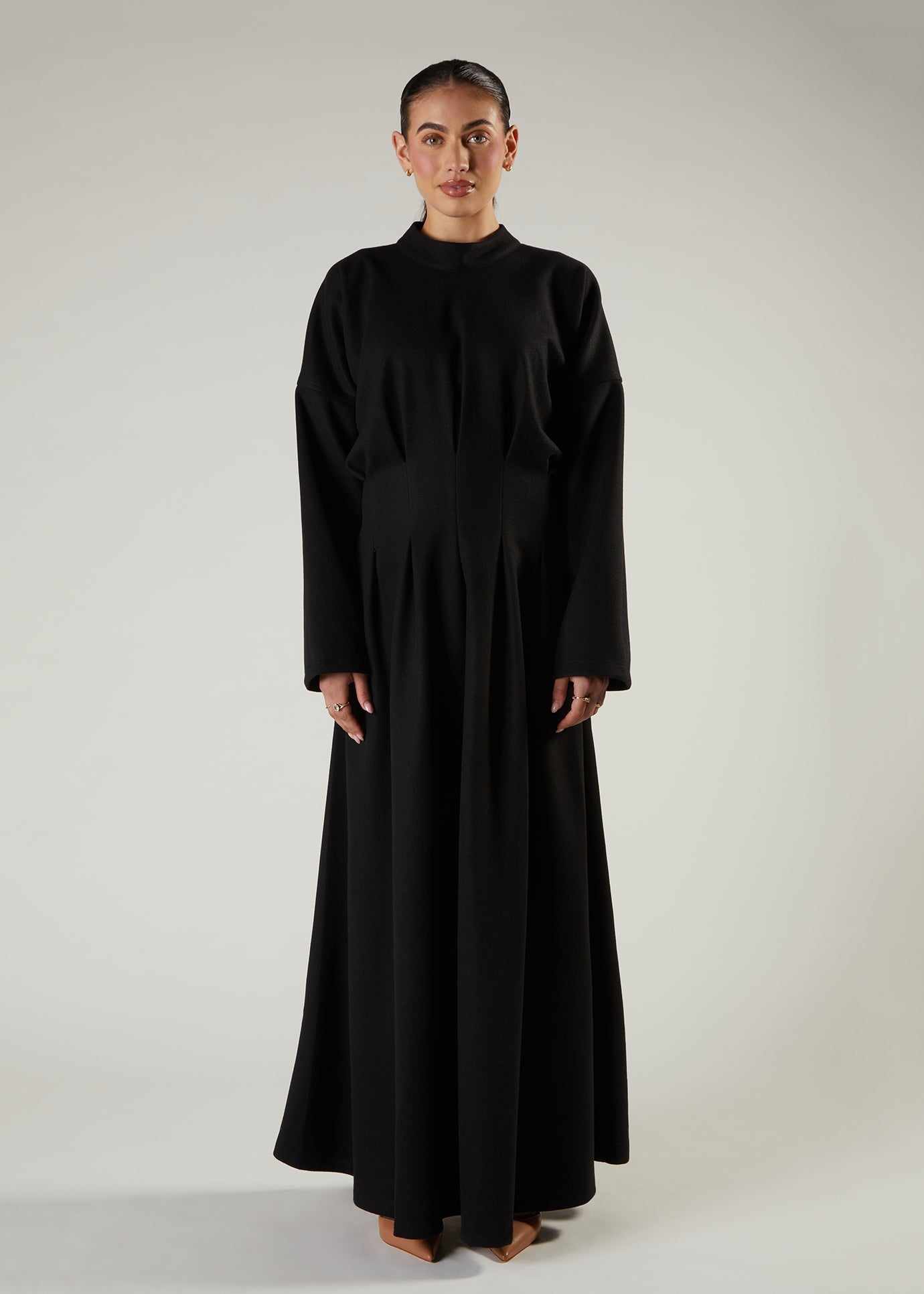 Elegant abaya made with distinctive front pleating that creates a refined, fan-like drape. Cut to a classic, comfortable silhouette that flatters without compromise.