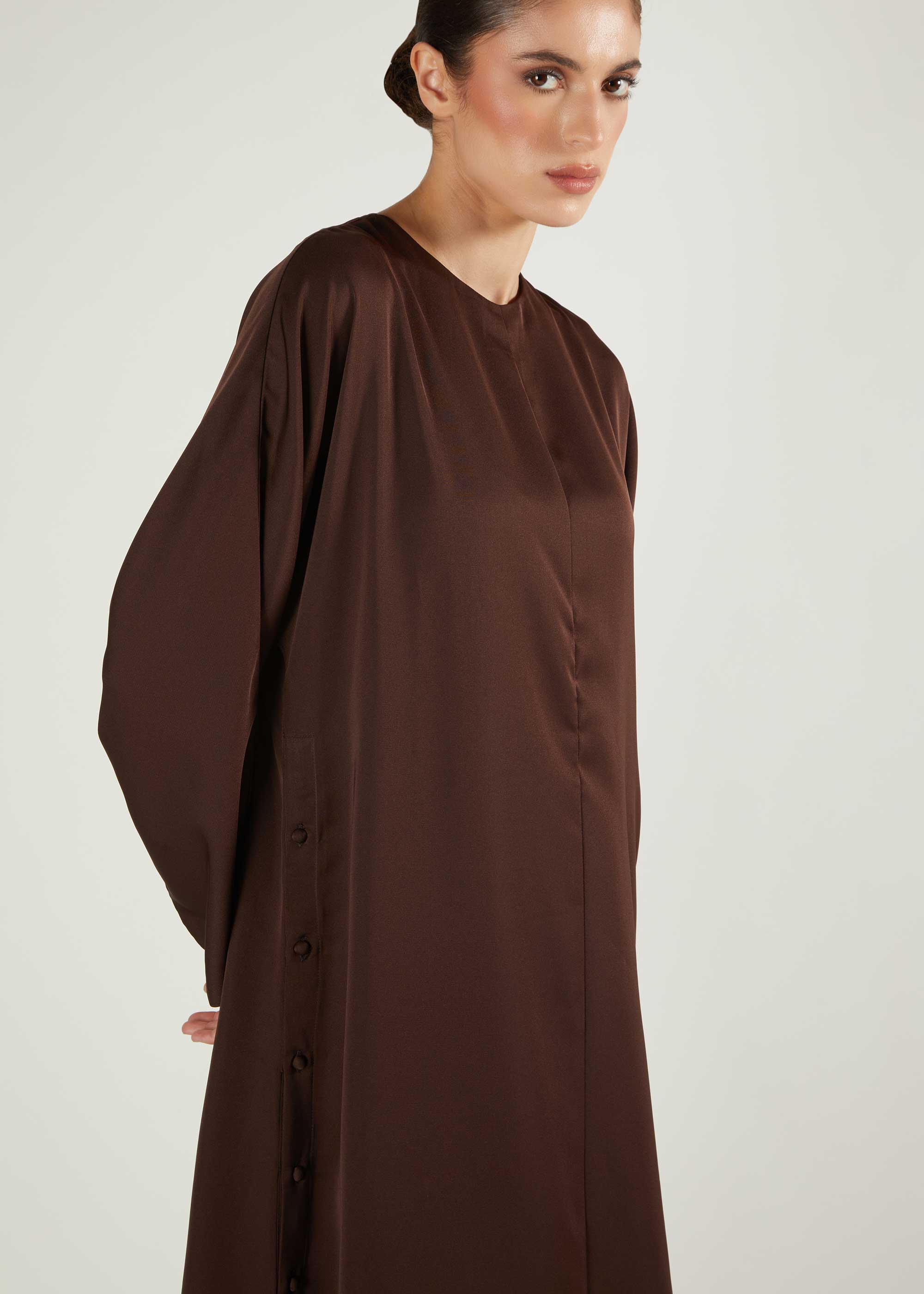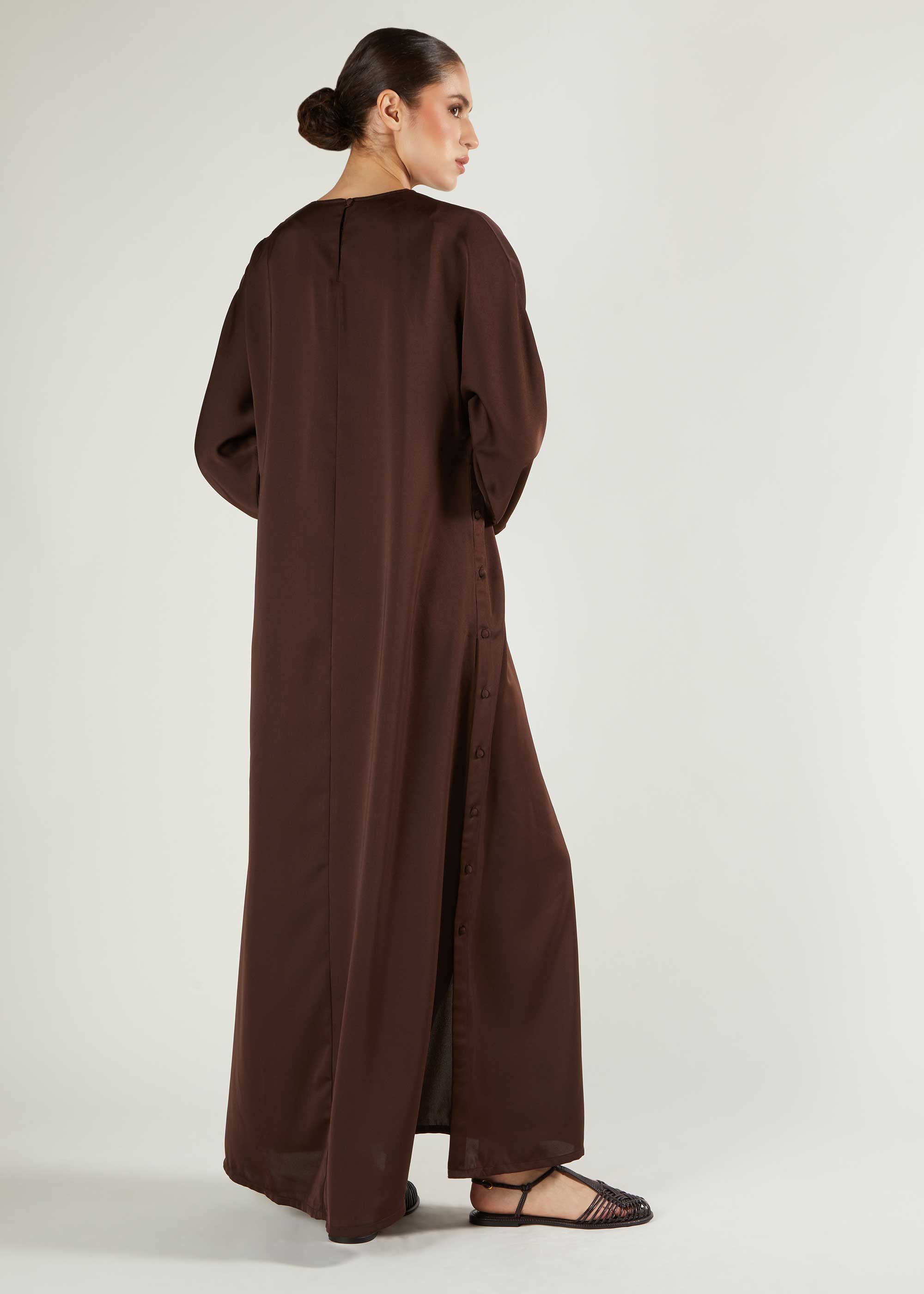 This straight-cut maxi is made from a smooth, flowing Nida fabric, offering a sleek and slimming fit. It is detailed with buttons along both sides, finished in a rich dark brown shade ideal for the season.