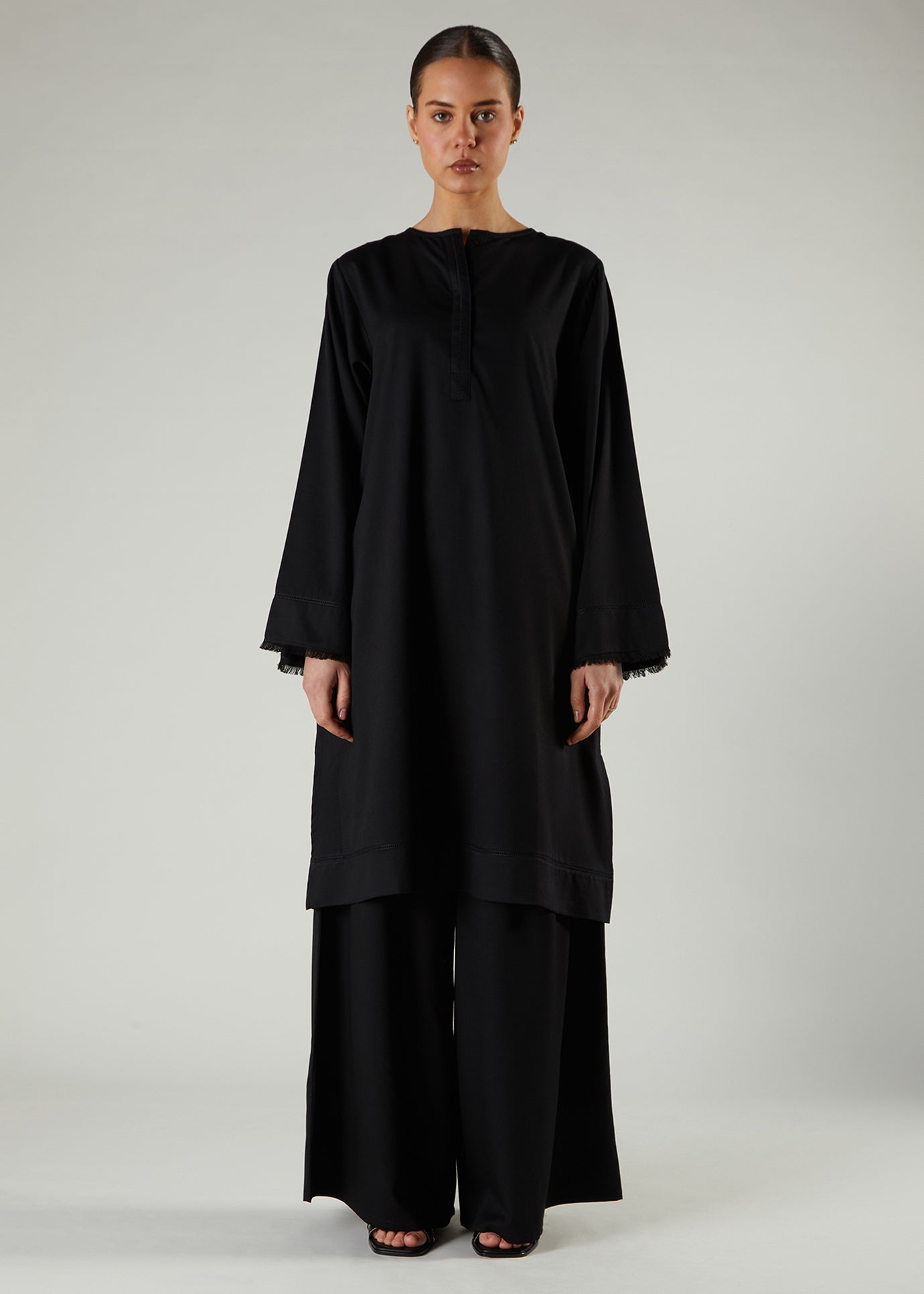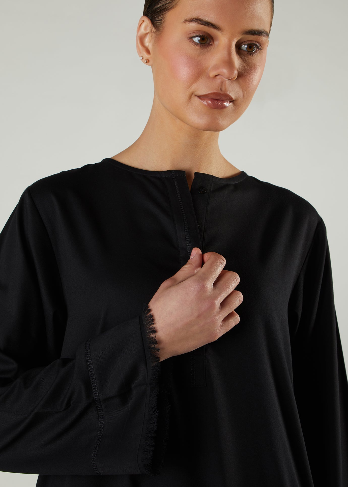 This Midi has a looser silhouette, but we recommend your regular size. It features ladder lace on the neckline and sleeves with subtle frayed edging detail on the sleeves