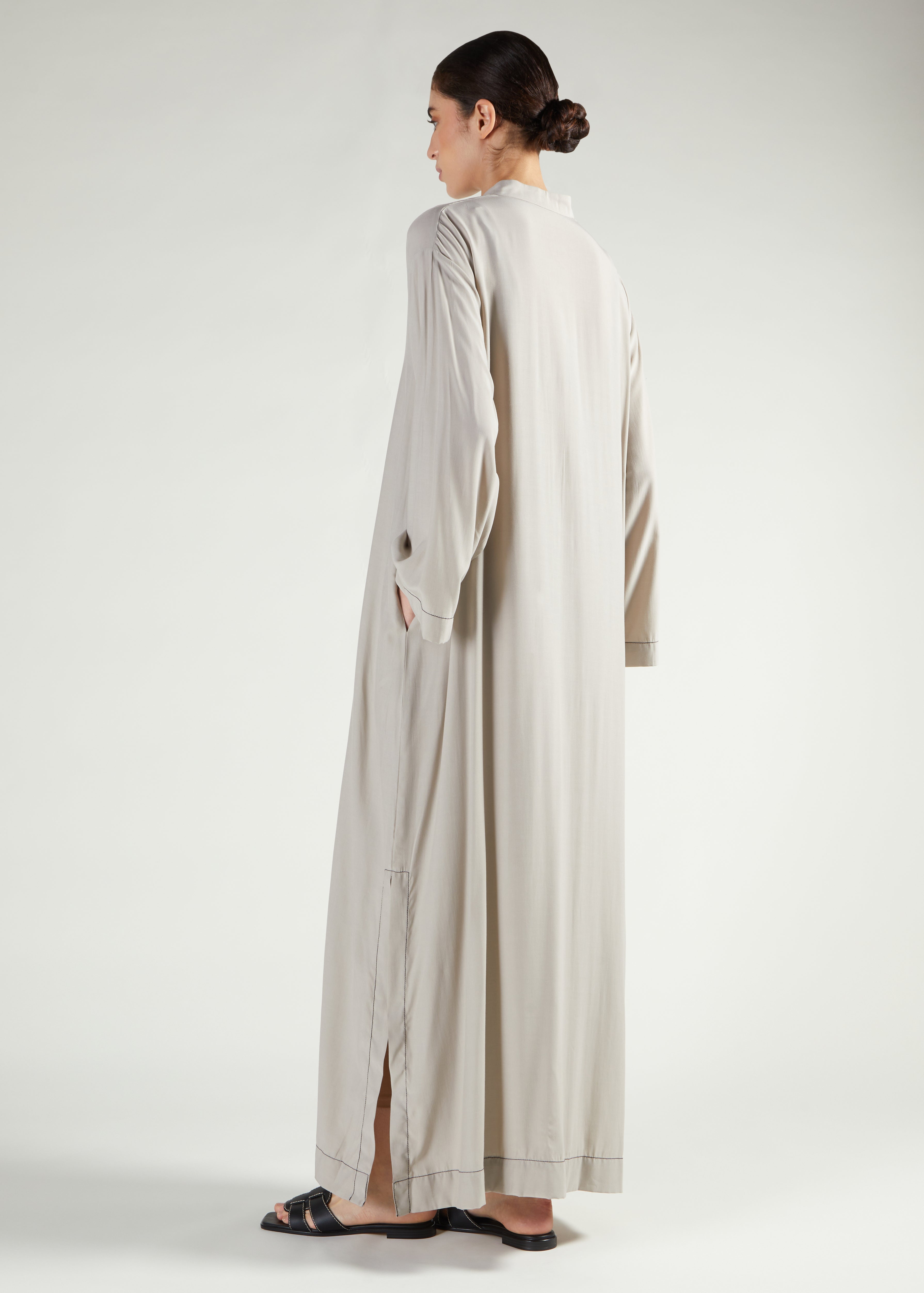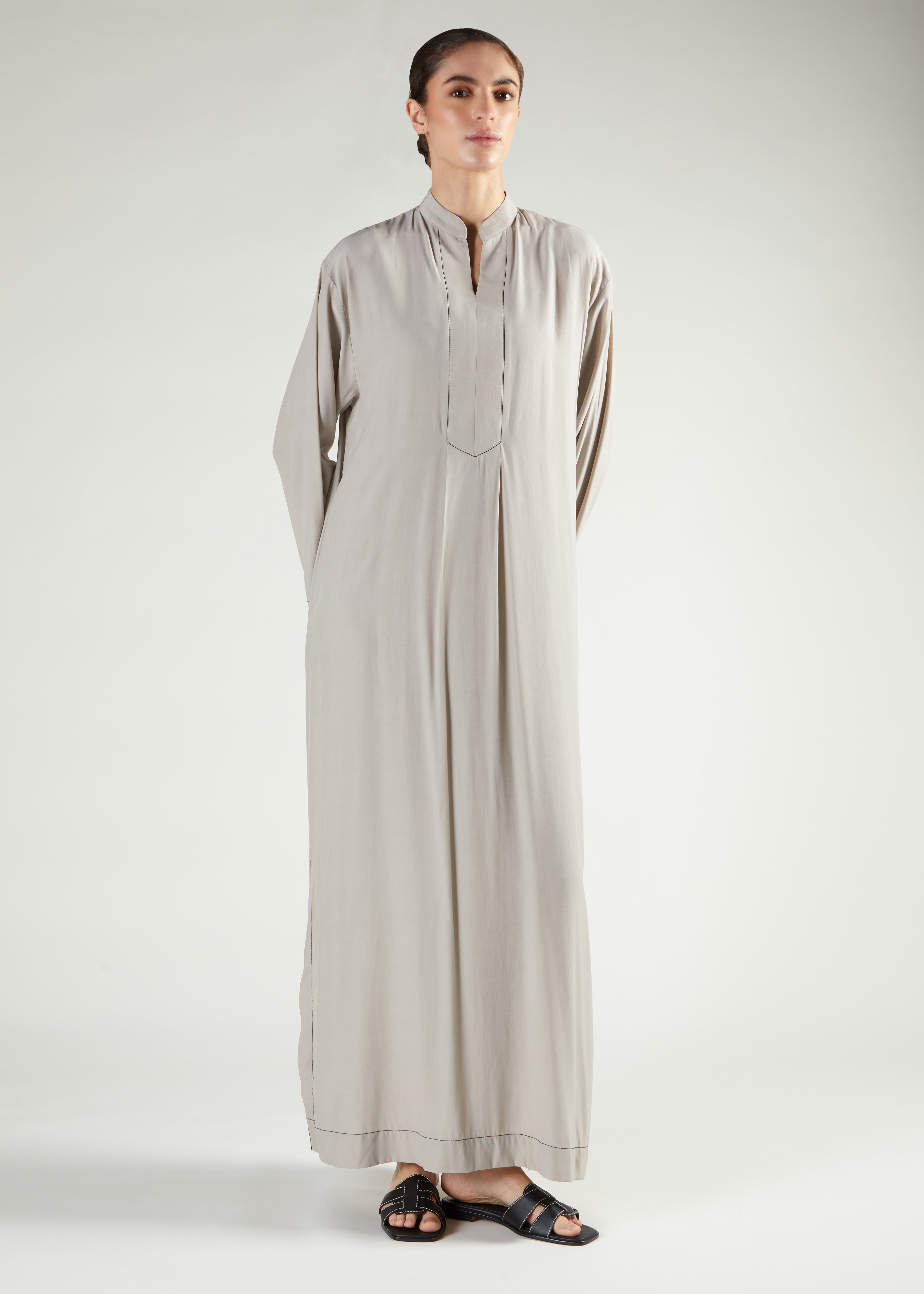 Inspired by loose fitting kaftans, this abaya features a single embroidered stitch around the neckline and cuffs and the hem. Simple yet elegant, it is comfortable to wear and has a loose fit silhouette designed for elevated lounge wear.