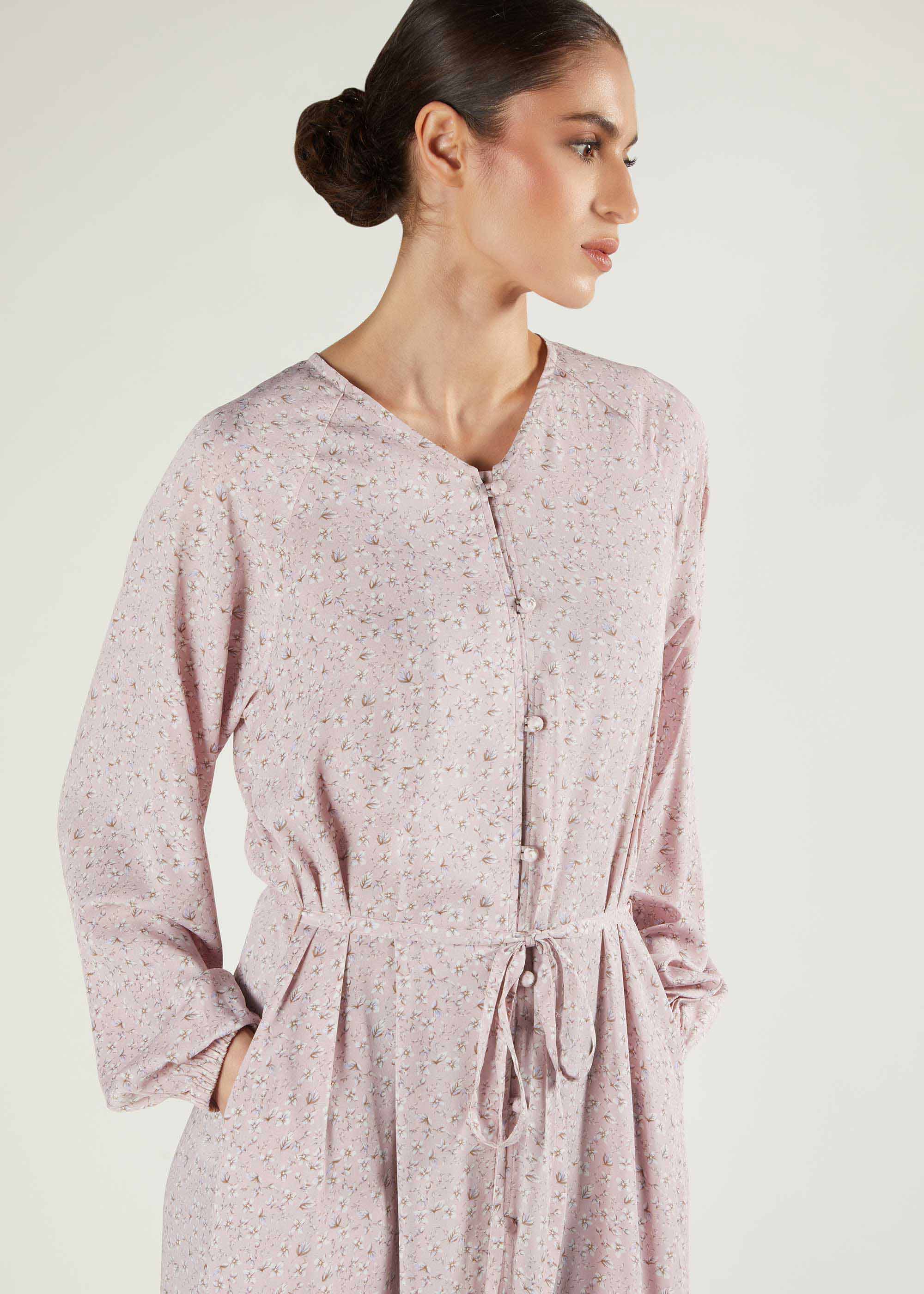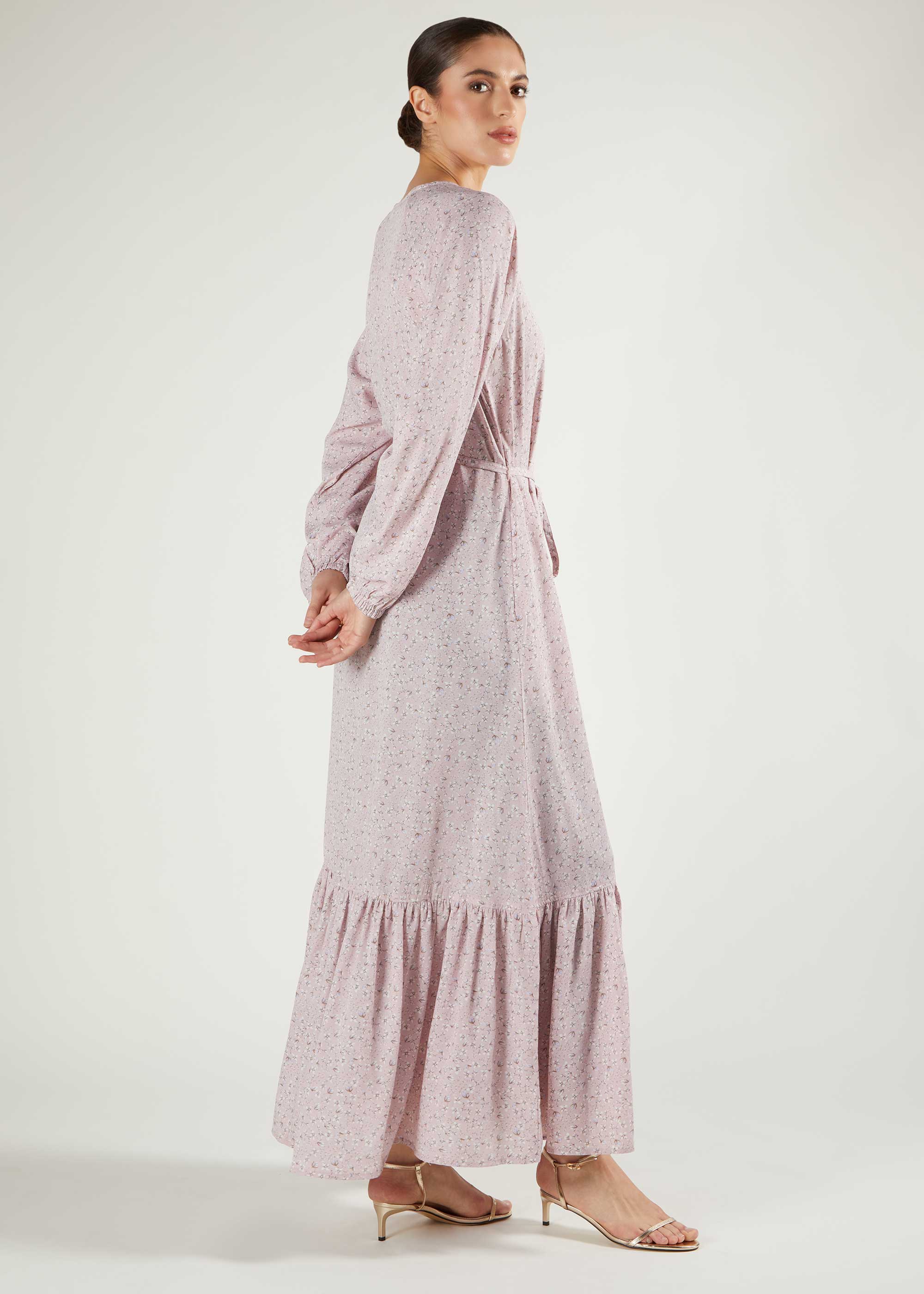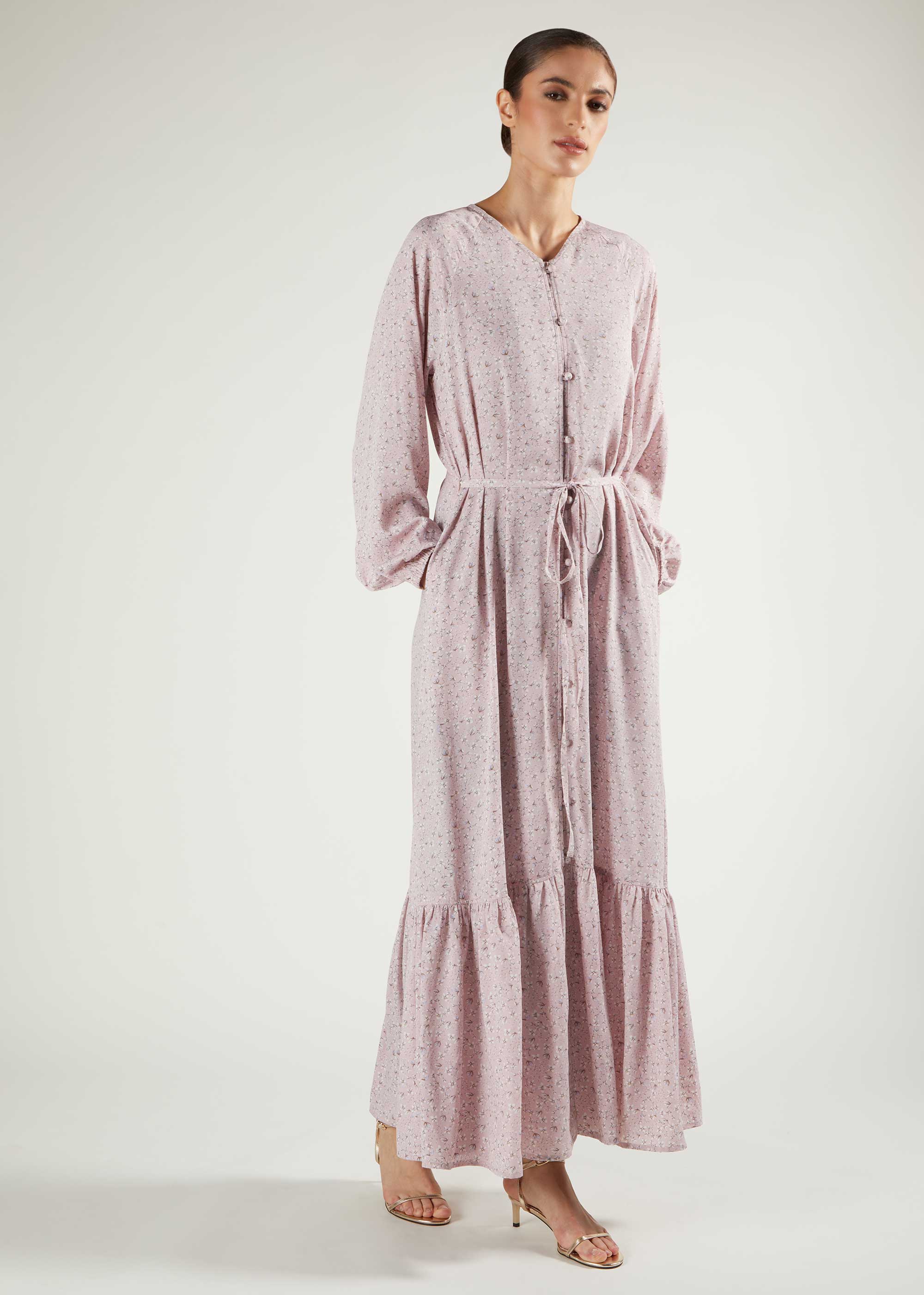 Elegant print maxi in a soft pink tone, it features a subtle floral print, has a simple A line silhouette with a tiered bottom and self-fabric buttons to accentuate the maxi. Cinch in at the waist with the thin self-fabric belt.