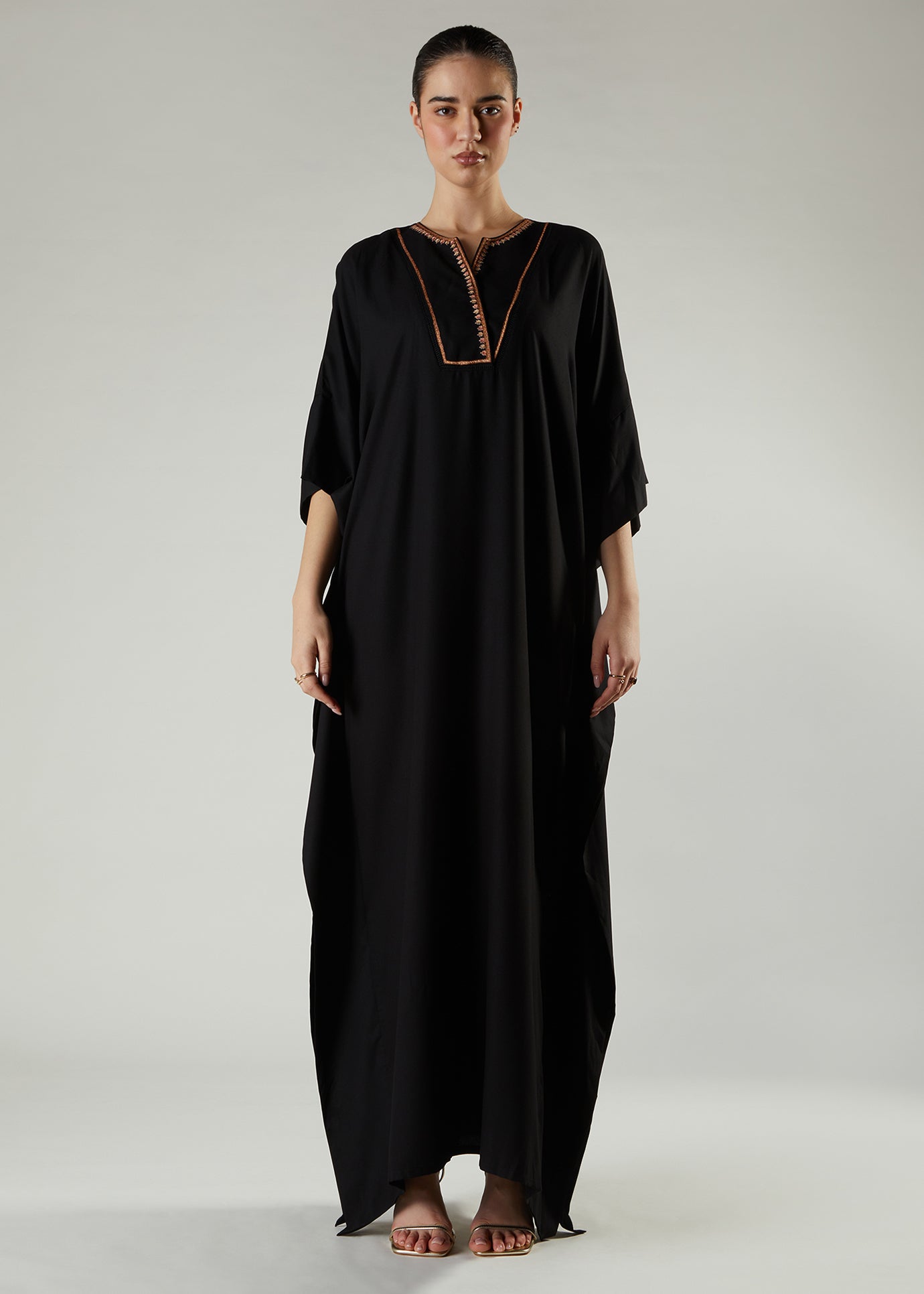Kaftan has a cross over V neckline featuring a delicate line of embroidery. This Kaftan has an A line cut with mini side slits and 3/4 length sleeves; it is elegantly cut with a fluid look. For full coverage of your arms, you can pair with our second skin top in black.