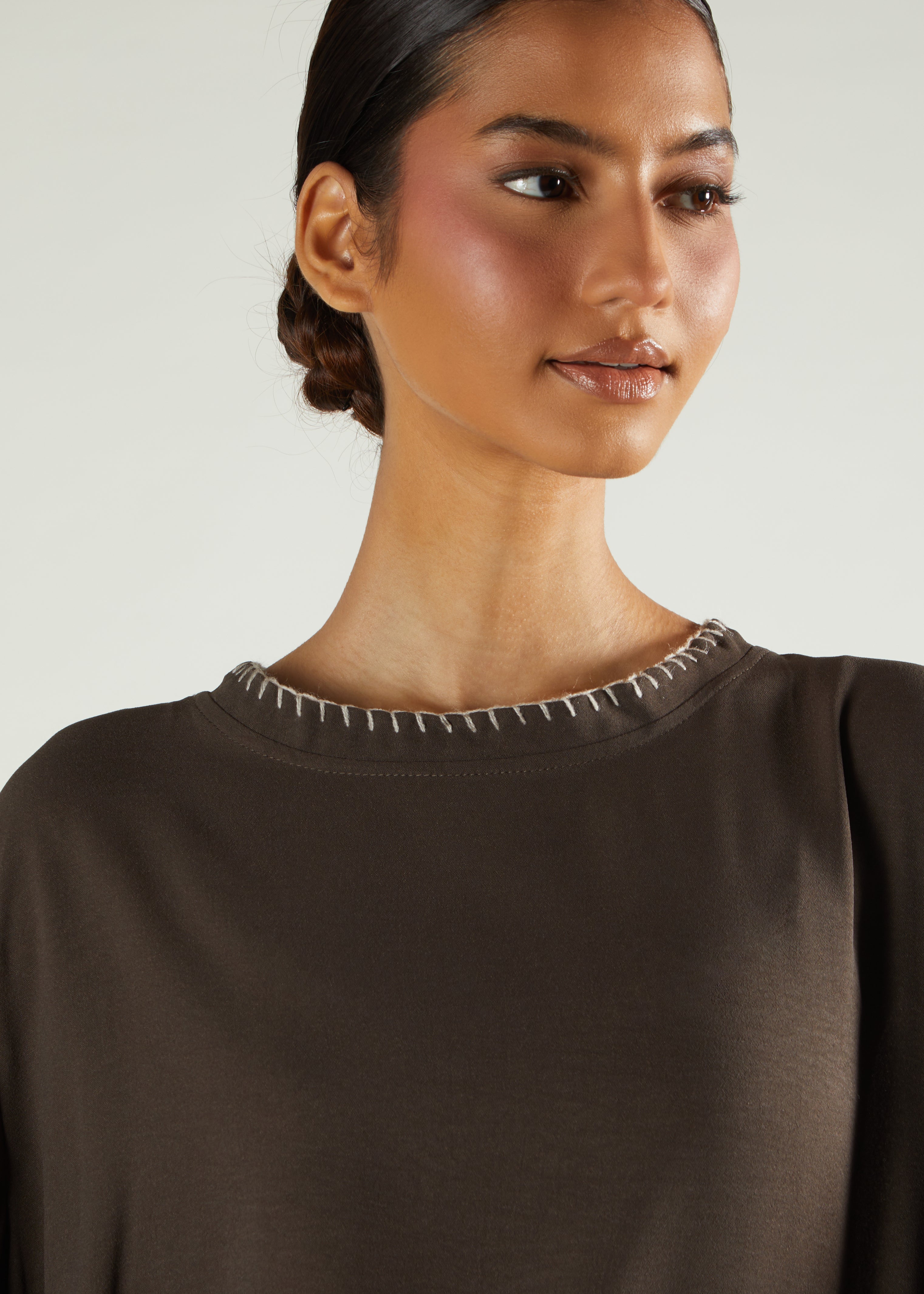 This everyday Abaya is designed with tote stitching on the sleeves and neckline for a distinctive look. The classic A-line cut gives it a relaxed, flowing silhouette that feels comfortable. Perfect for daily wear with an effortless, elegant style.