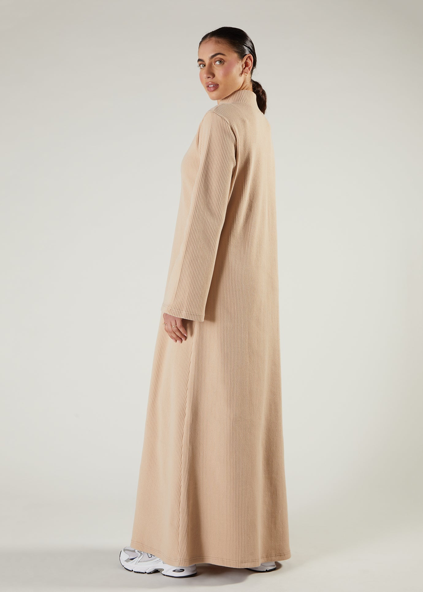 Discover versatility in our Turtle Neck Abaya, expertly designed in soft ribbed fabric that adapts beautifully to changing seasons. The elevated high neckline delivers timeless sophistication, while the gentle texture ensures all-day comfort without compromise. Perfect for transitional weather, this piece becomes even more striking when layered with our curated casual cover-ups, creating endless styling possibilities that elevate your modest wardrobe.