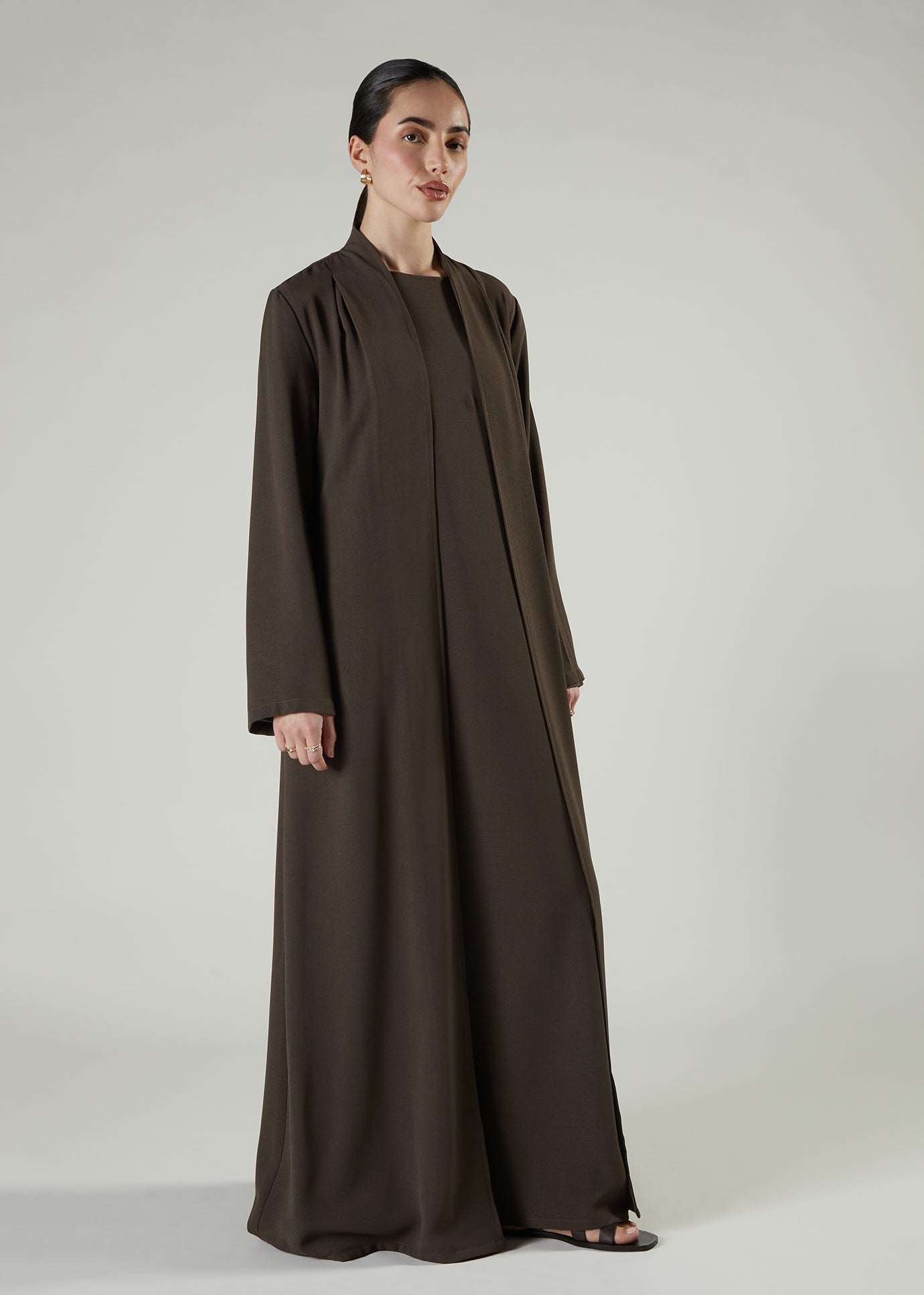 This elegant Two-Piece Open Abaya set includes a Full Sleeve matching slip. Perfect for everyday wear, it can also be dressed up with accessories for an evening look. The full sleeve slip dress can be worn as a maxi dress on its own or paired with the open abaya for a stylish ensemble.