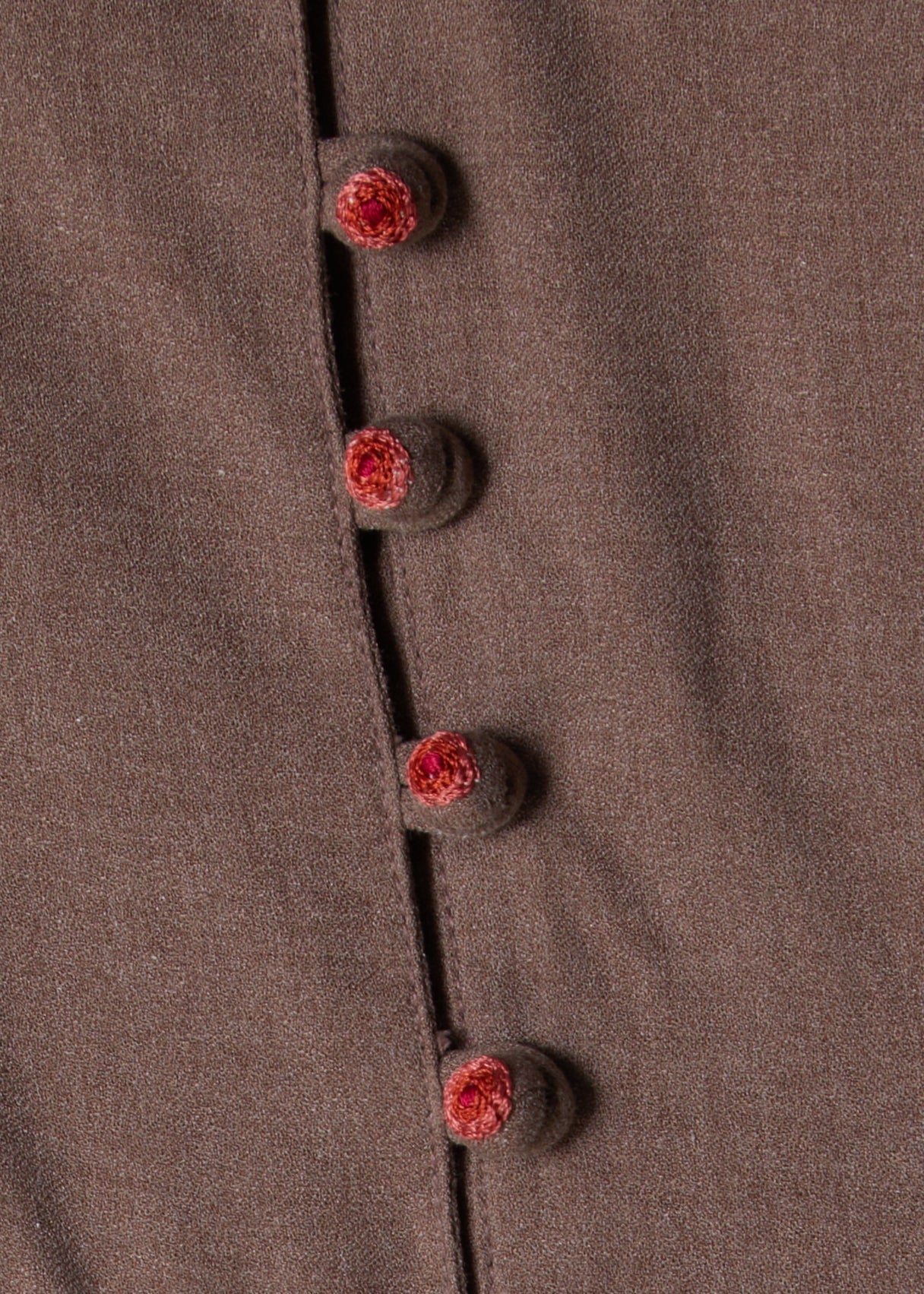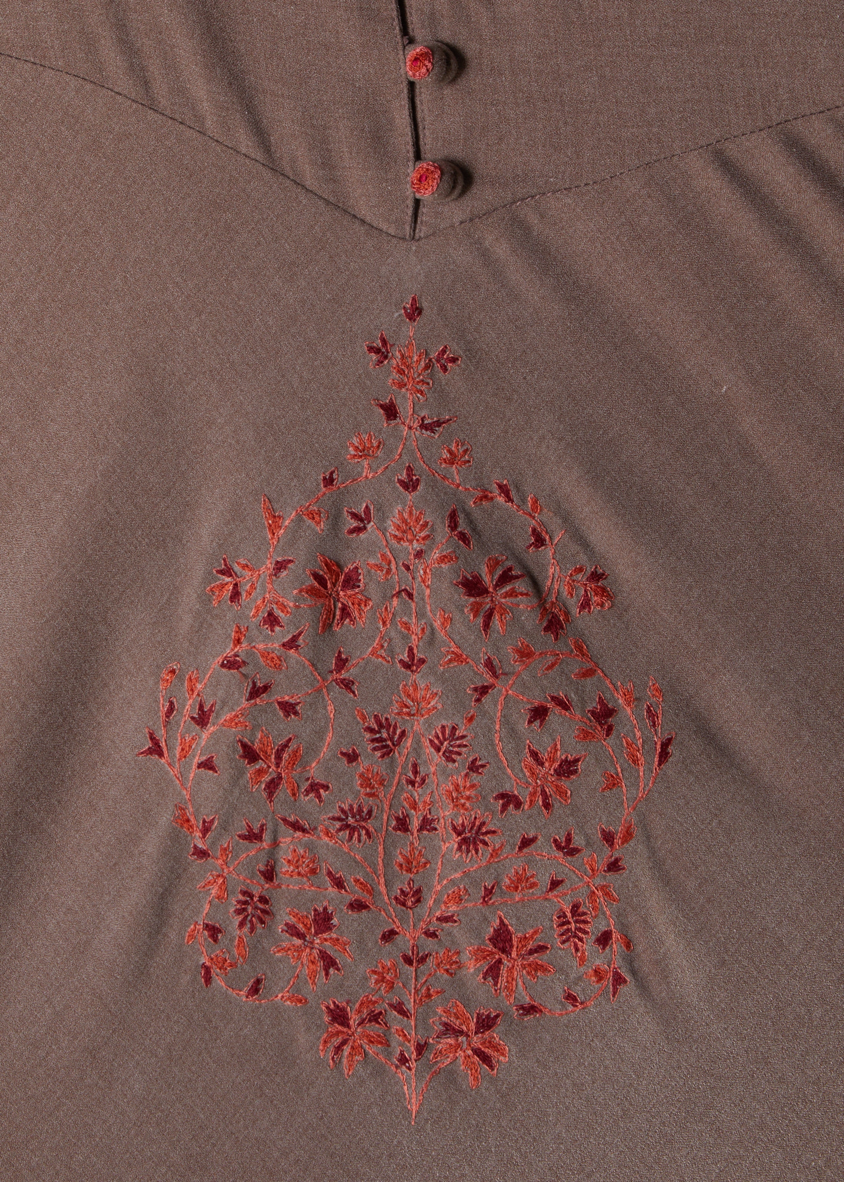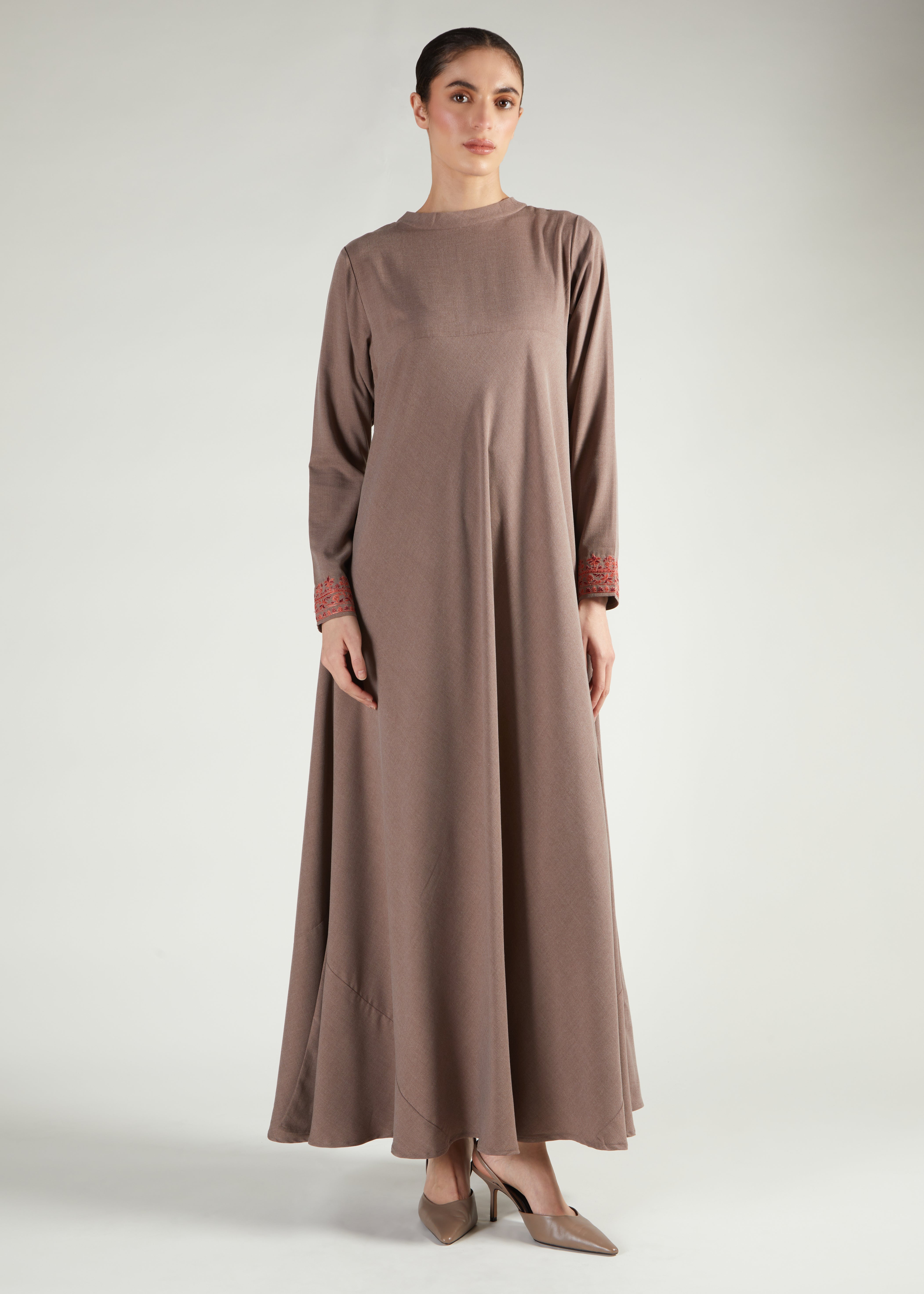 This abaya features elegant Kashmiri style embroidery; the soft beige fabric has a fluid look and feel whilst the embroidery has been made using two tones adding a vibrant pop to this muted hue abaya. The finishing touch is the hand embroidered buttons that accentuate the whole outfit.