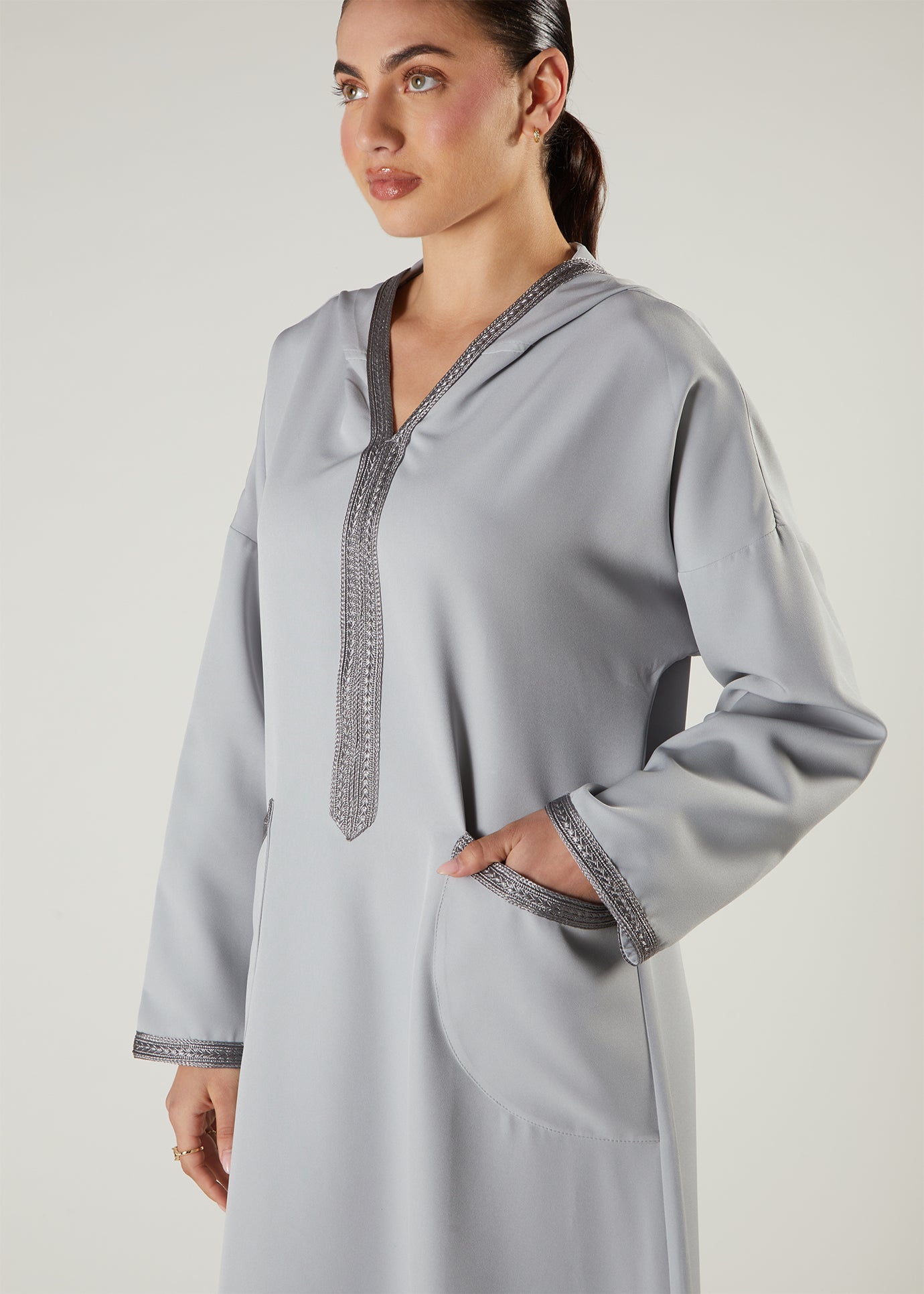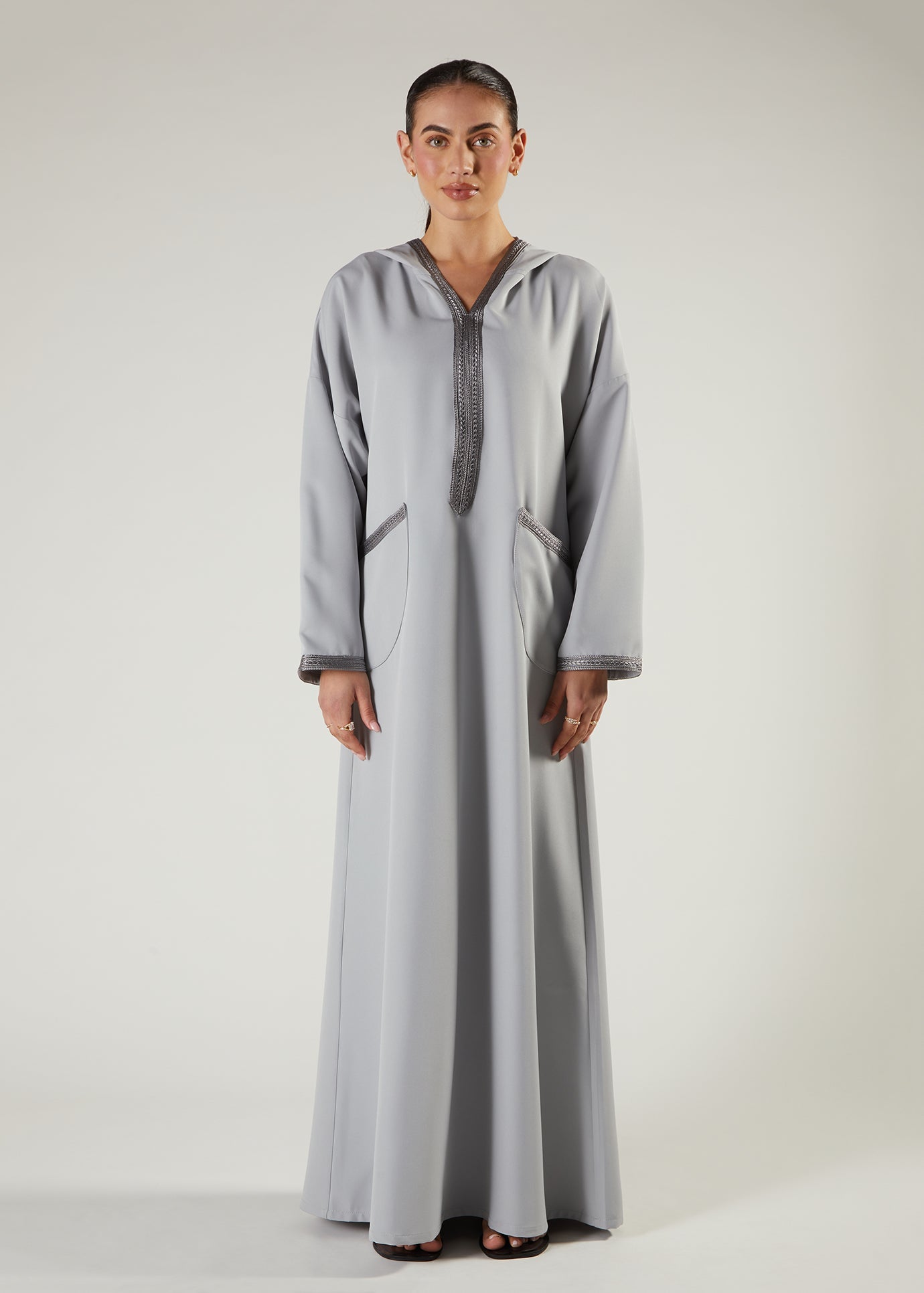 Embrace understated elegance with our Violet Ice Jalabiya, a hooded abaya designed for modern modest fashion. This piece features delicate lace detailing along the neckline and cuffs, adding a touch of refinement without compromising on comfort. The classic A-line silhouette flatters all figures while the practical pockets offer everyday functionality. Perfect for Ramadan gatherings or daily wear, this jalabiya combines timeless style with contemporary details that elevate your wardrobe effortlessly.