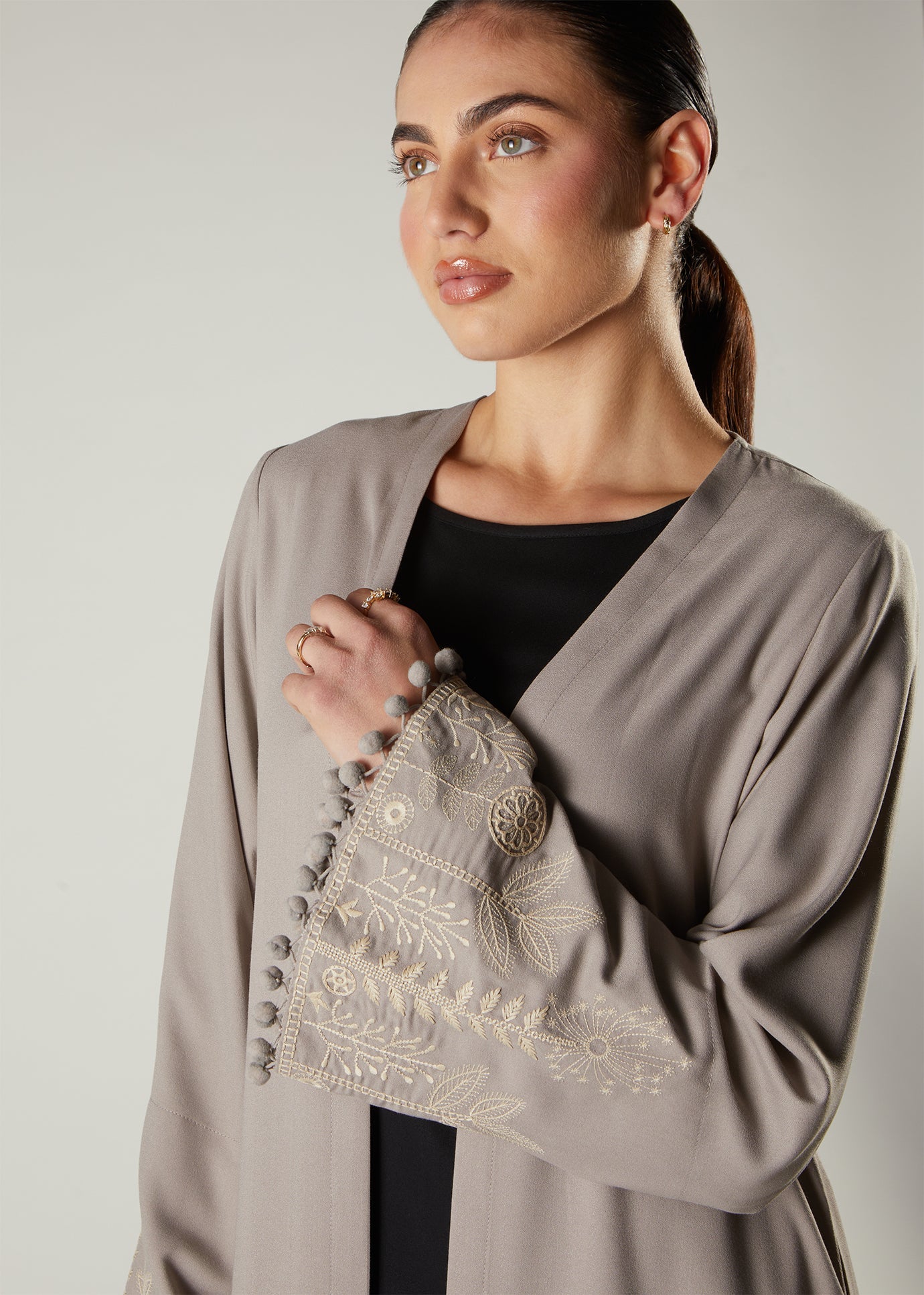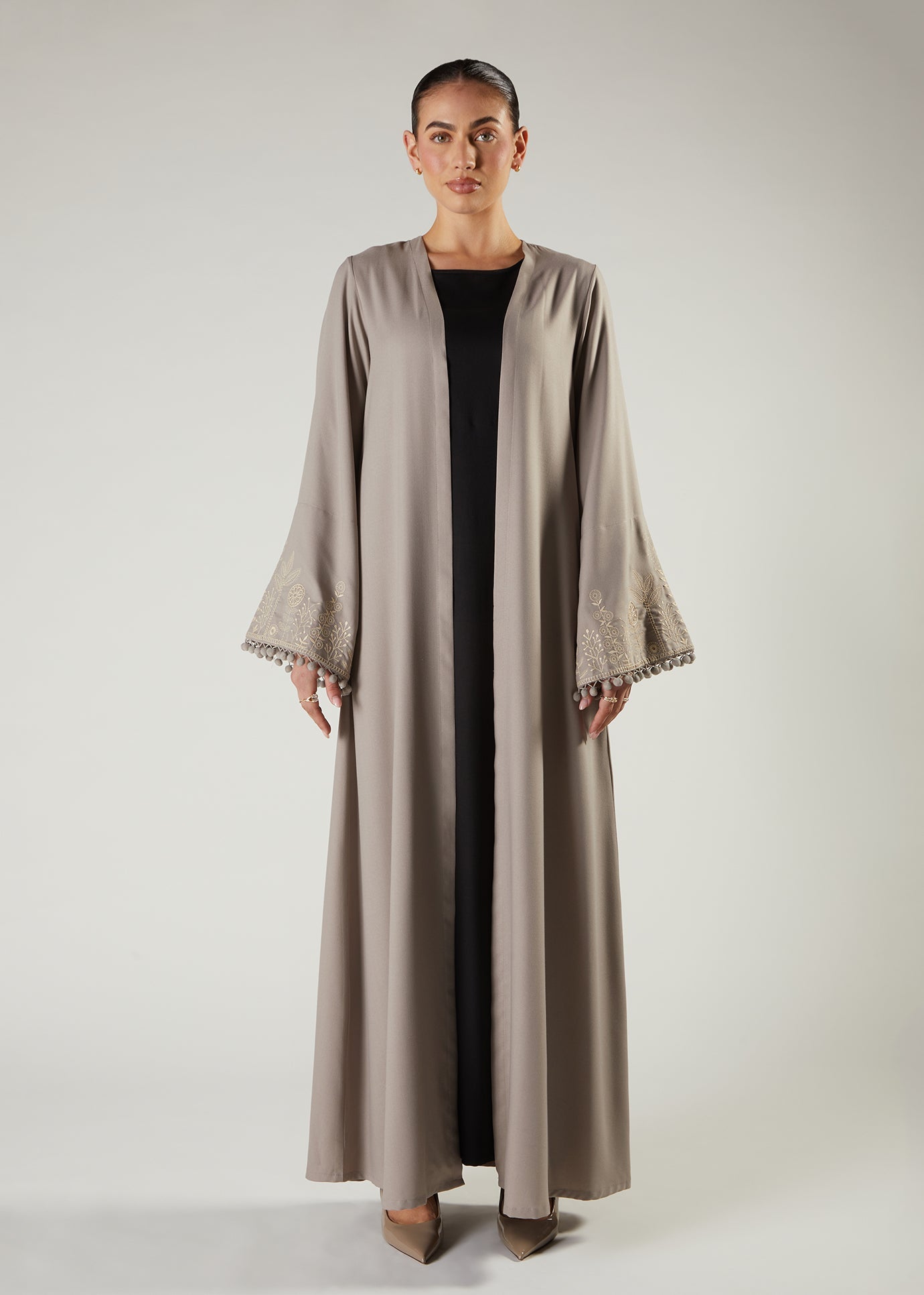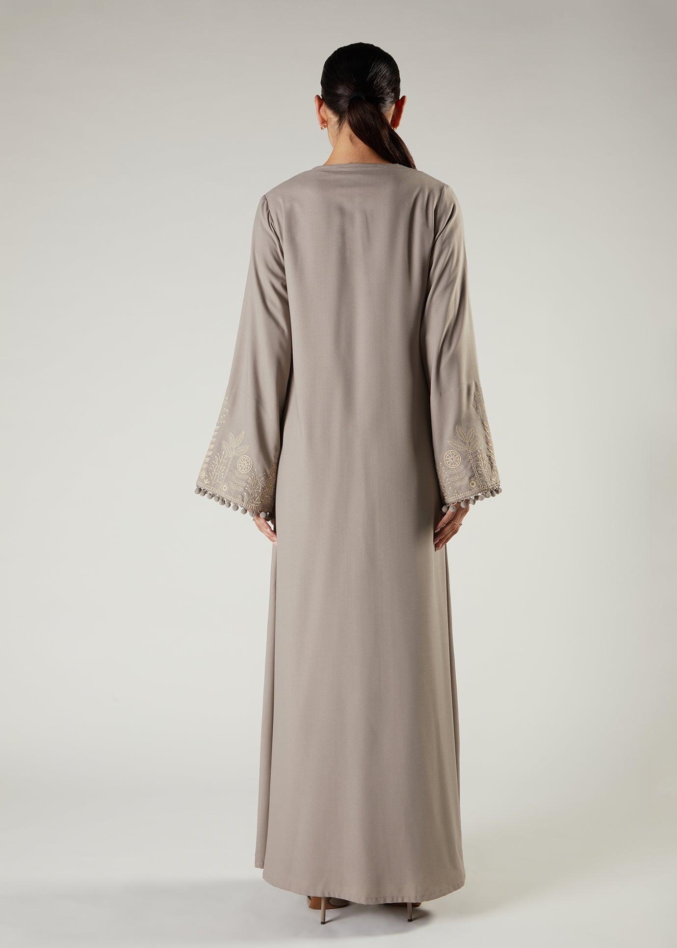 White Garden Kimono has a boho vibe, featuring soft milky white floral embroidery on the cuffs and adorning cute pompoms on the sleeves and placket of the kimono. Pair with our milk white slip dress to complete your look or keep it tonal with the Grey Full Slip.